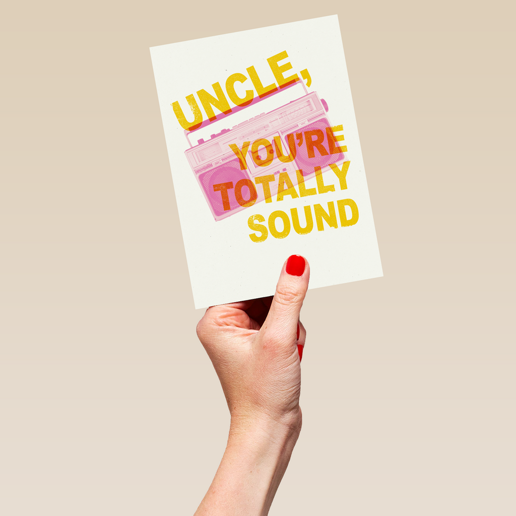 Show them you care with a personalised contemporary birthday uncle totally sound card from Hallmark. Our greetings cards are printed on premium quality, FSC®-certified card & delivered nationwide. This card is available as standard 12cm by 16.7cm and large 15.5cm by 21.6cm.