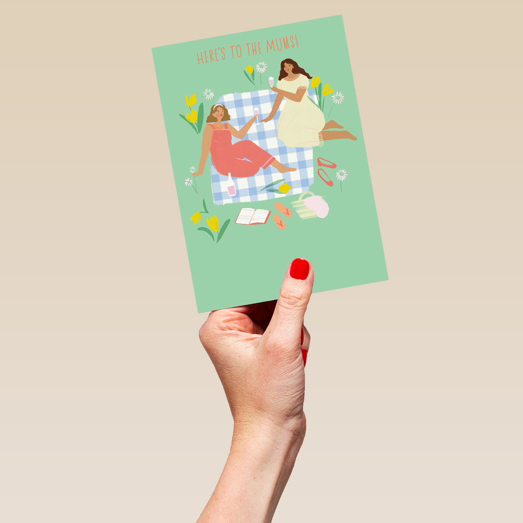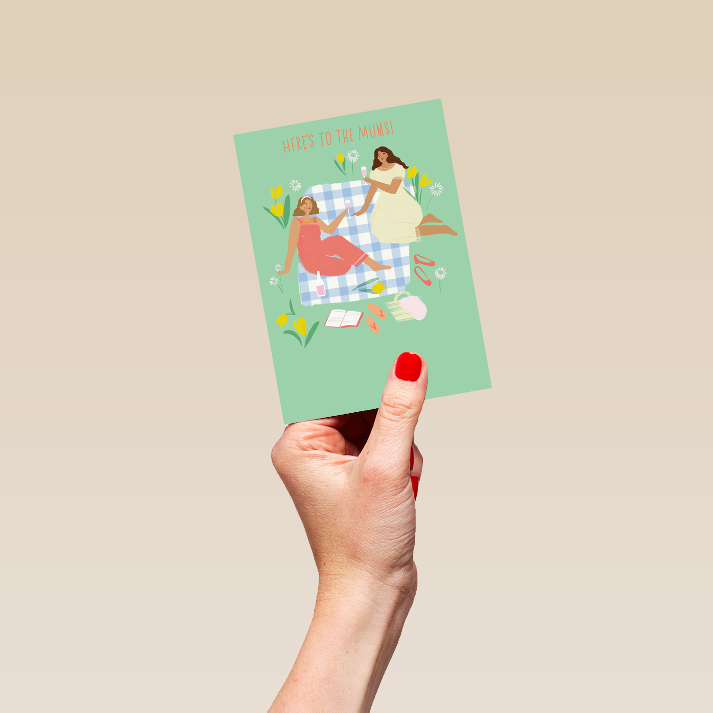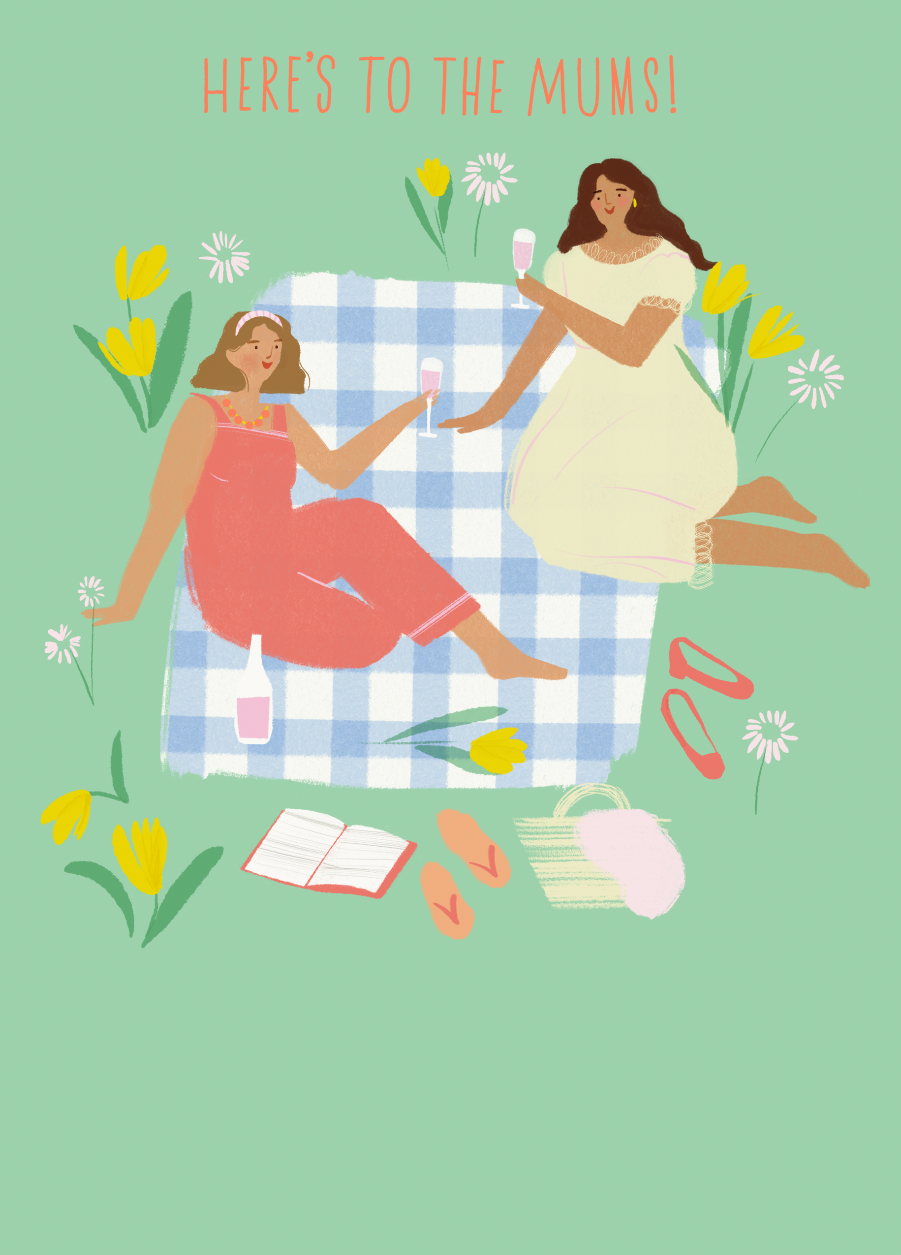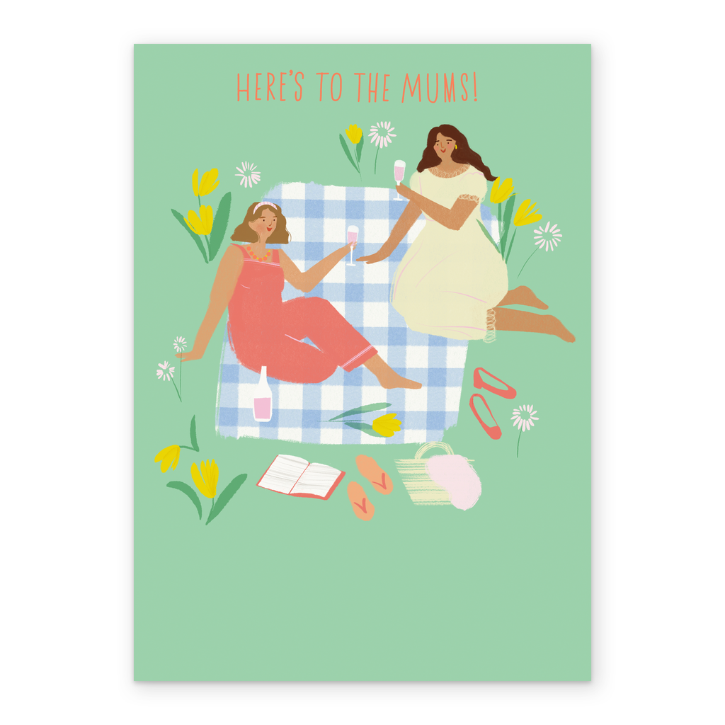 Printed on premium-quality board, this card features an illustration of 2 mums enjoying a relaxing picnic, with the message 'Here's To The Mums!', and comes complete with a co-ordinating white envelope.