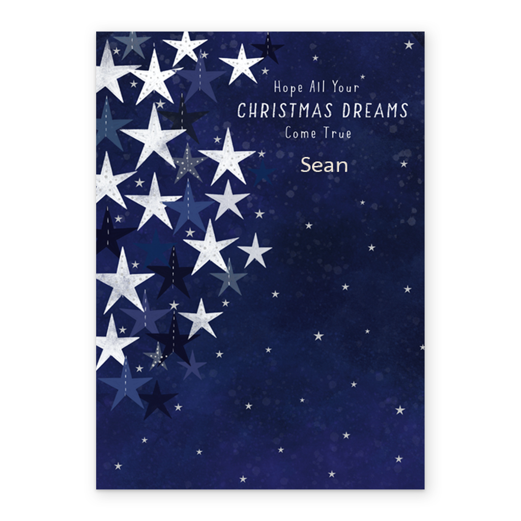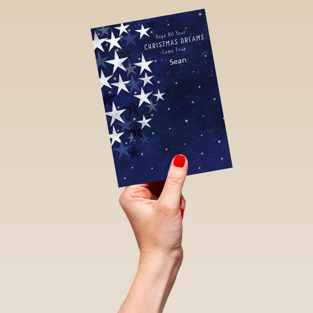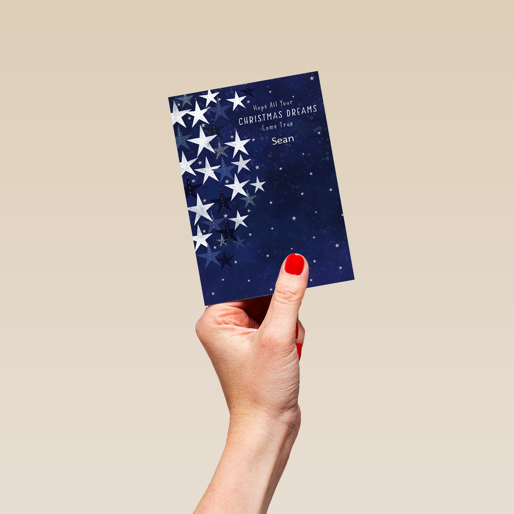 Show them you care with a personalised contemporary starry night dreams card from Hallmark. Our Christmas cards are printed on premium quality, FSC®-certified card & delivered nationwide. This card is available as standard 12cm by 16.7cm and large 15.5cm by 21.6cm.
