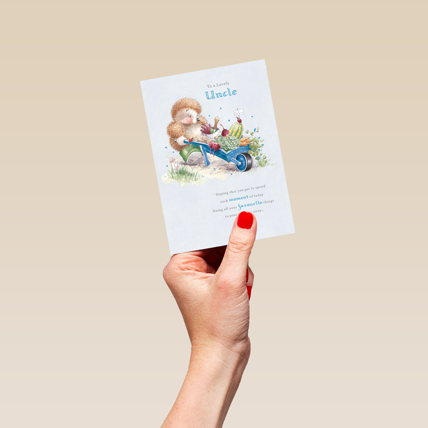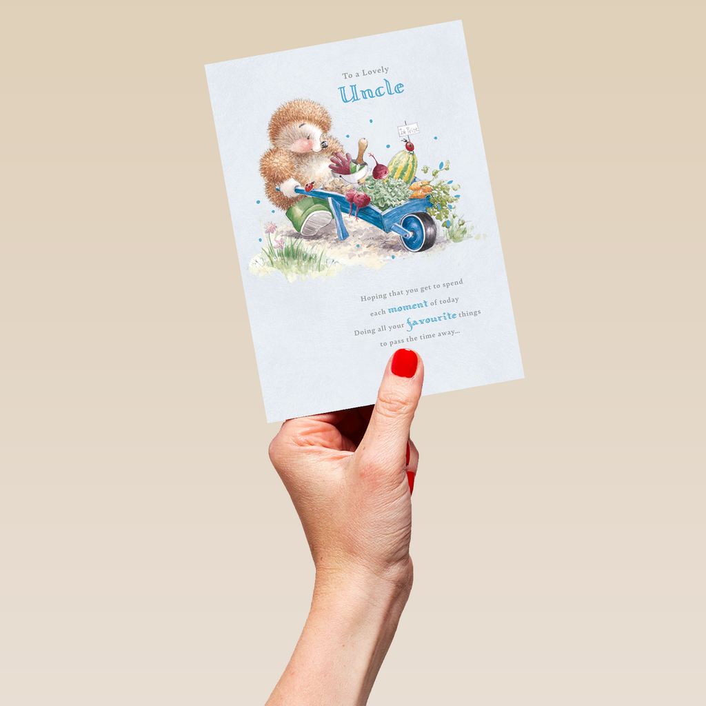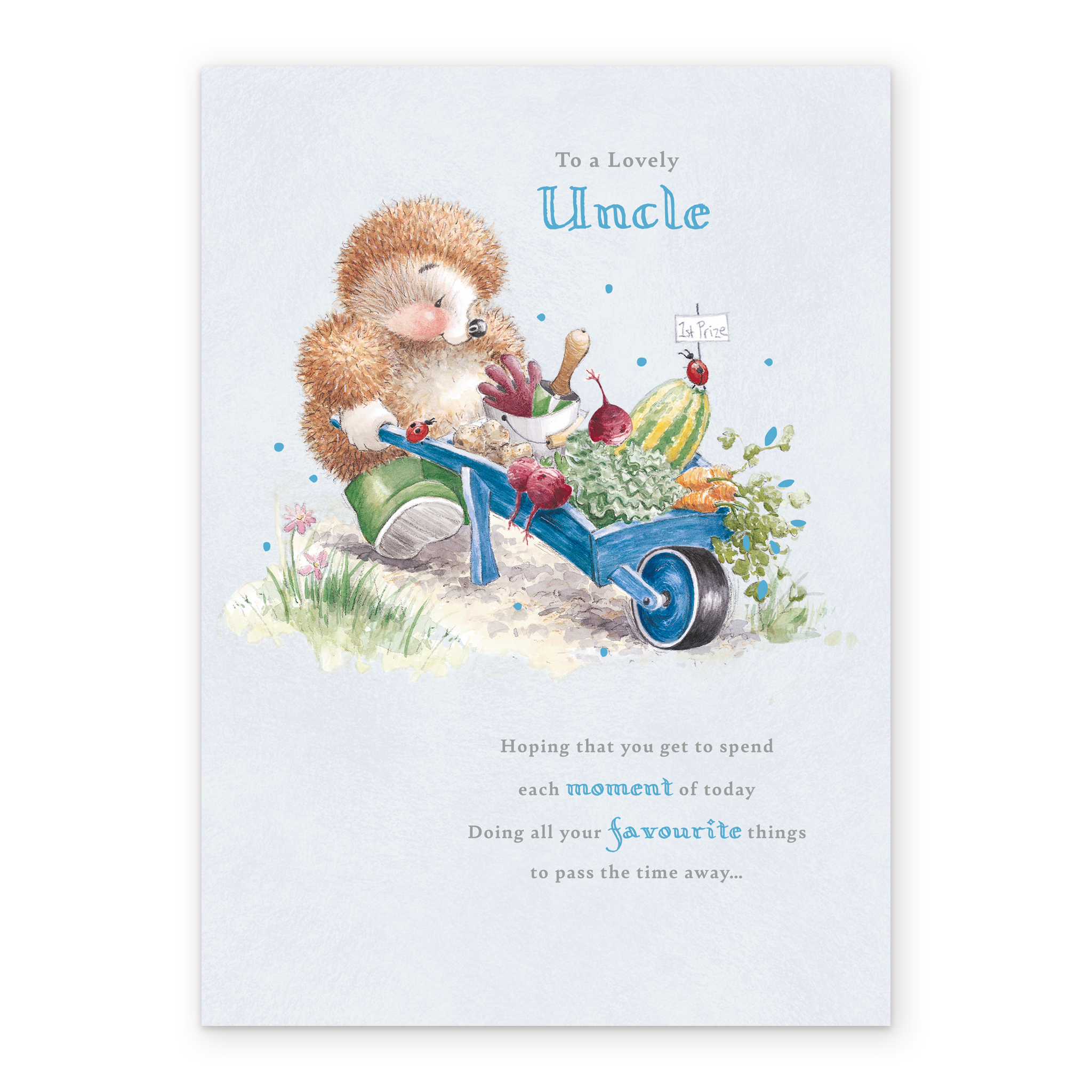 Printed on premium-quality board, this card features a cute hedgehog from Country Companions with a wheelbarrow full of vegetables, with the message 'To a lovely uncle. Hoping that you get to spend each moment of today doing all your favourite things to pass the time away…', and comes complete with a co-ordinating white envelope.