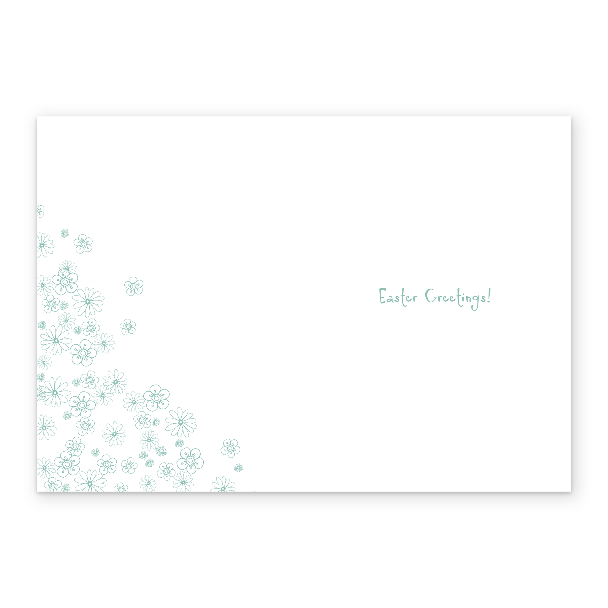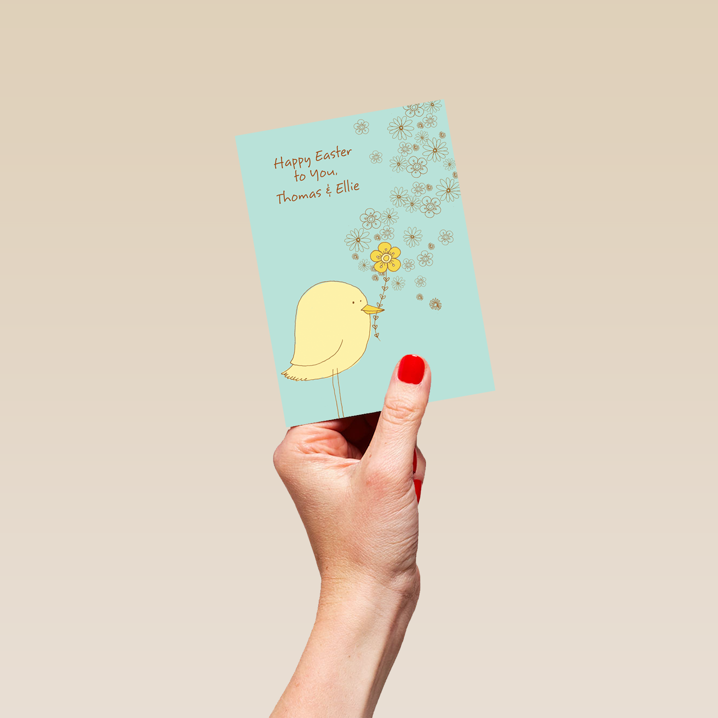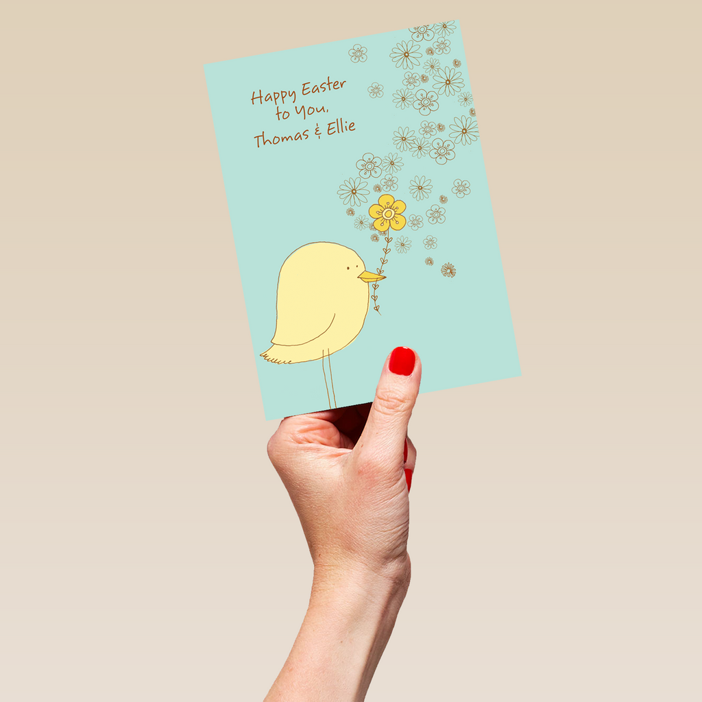 Printed on premium-quality board, this card features a cute illustrated yellow chick holding a flower in it's beak, on a floral embellished light green background, with the message 'Happy Easter to you,', space to personalise a name, and comes complete with a co-ordinating white envelope.