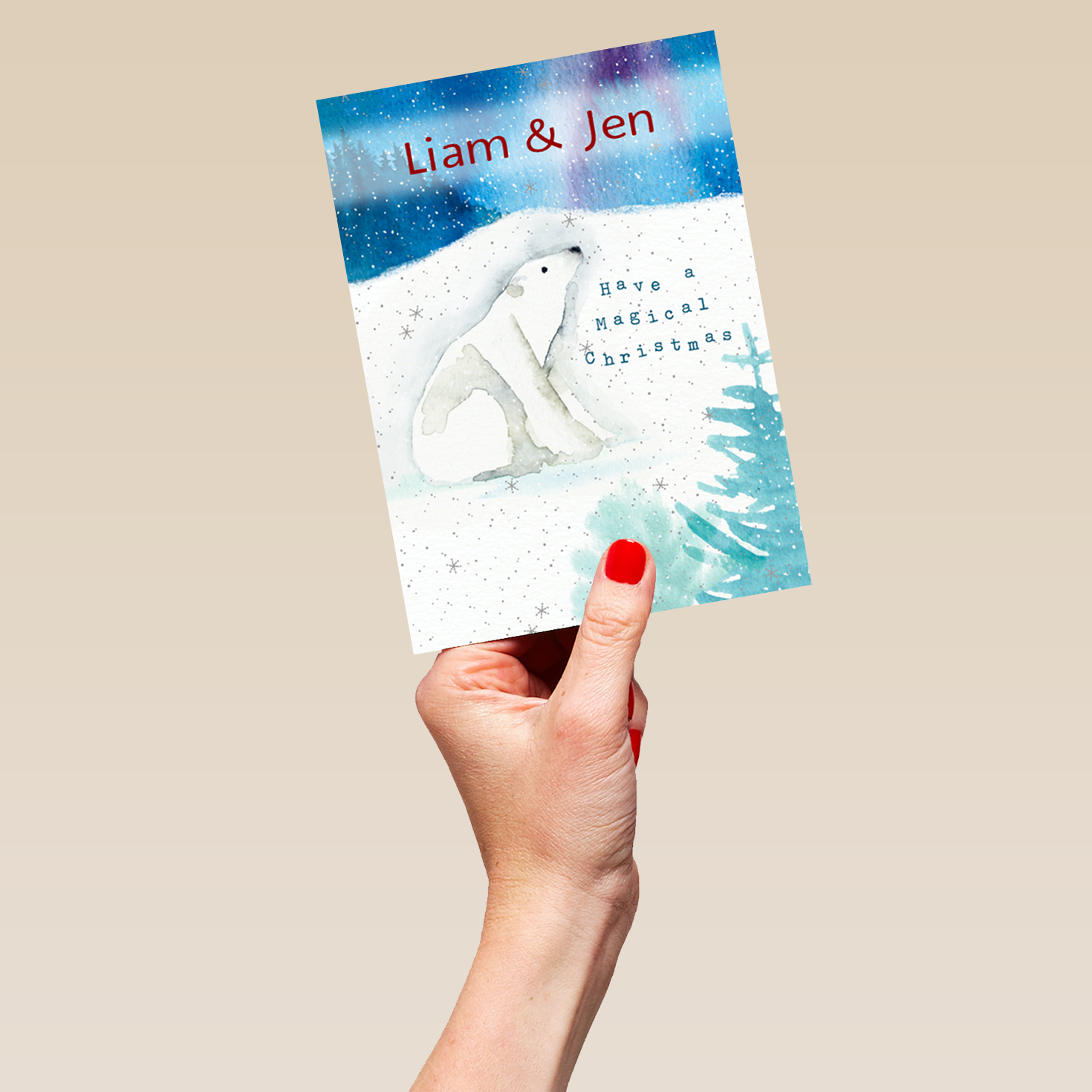 Show them you care with a personalised cute bear snowy winter night card from Hallmark. Our Christmas cards are printed on premium quality, FSC®-certified card & delivered nationwide. This card is available as standard 12cm by 16.7cm and large 15.5cm by 21.6cm.