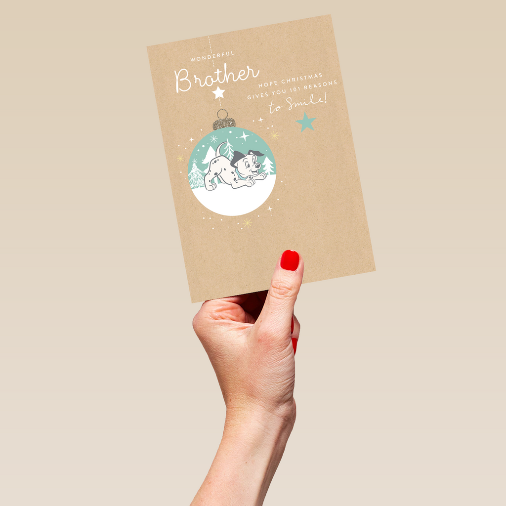Show them you care with a personalised & editable Disney's 101 Dalmatians Christmas card for brother from Hallmark. Our Christmas cards are printed on premium quality, FSC®-certified card & delivered nationwide. This card is available as standard 12cm by 16.7cm and large 15.5cm by 21.6cm.