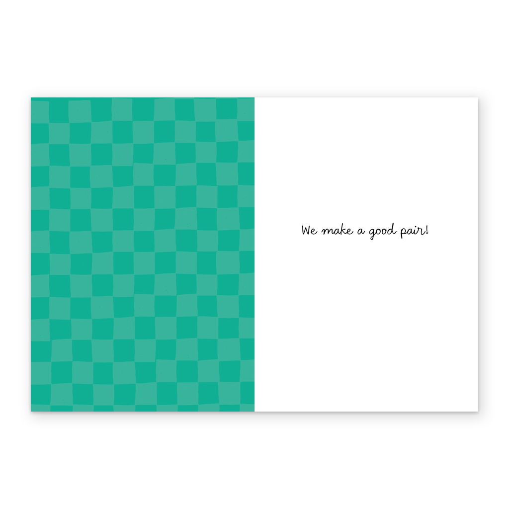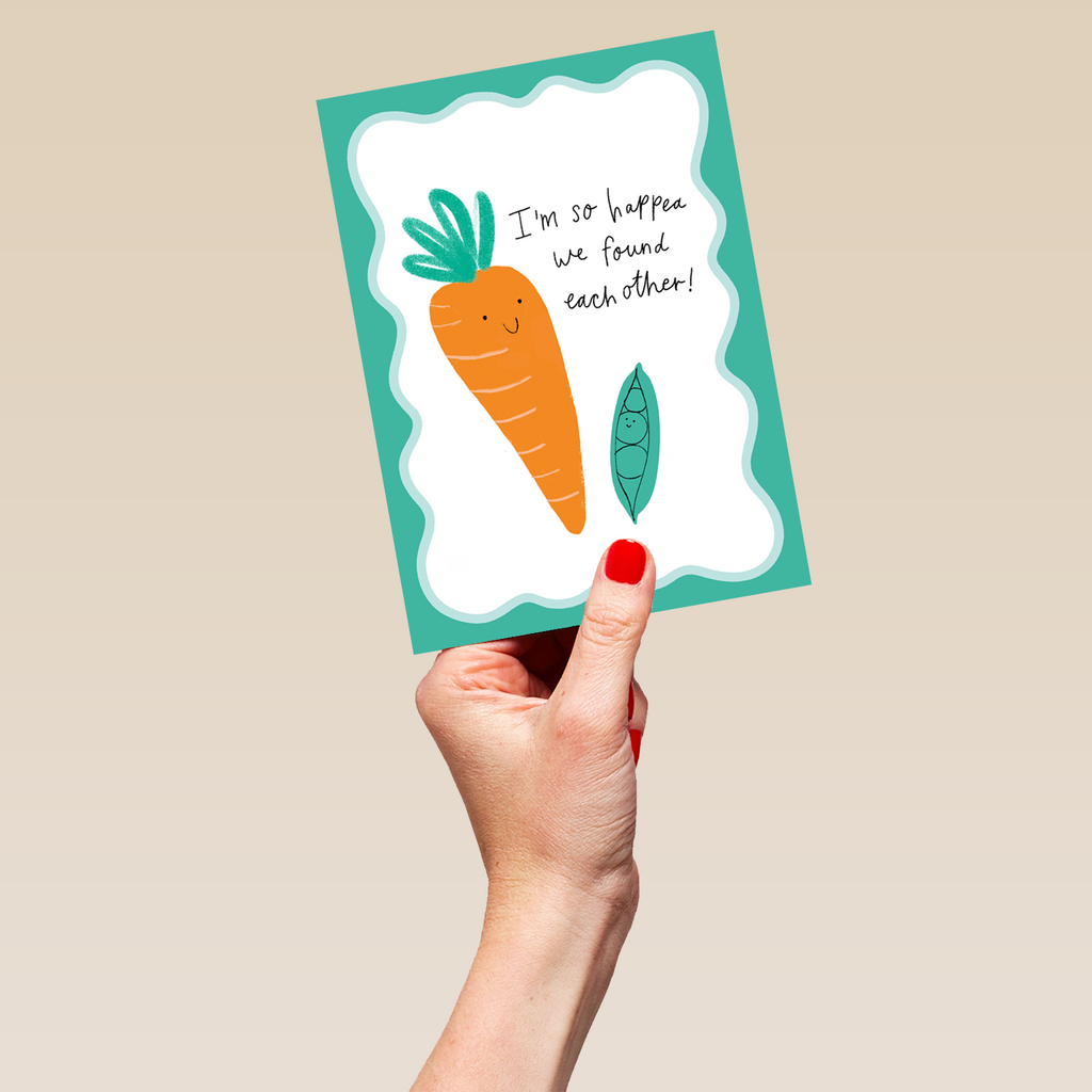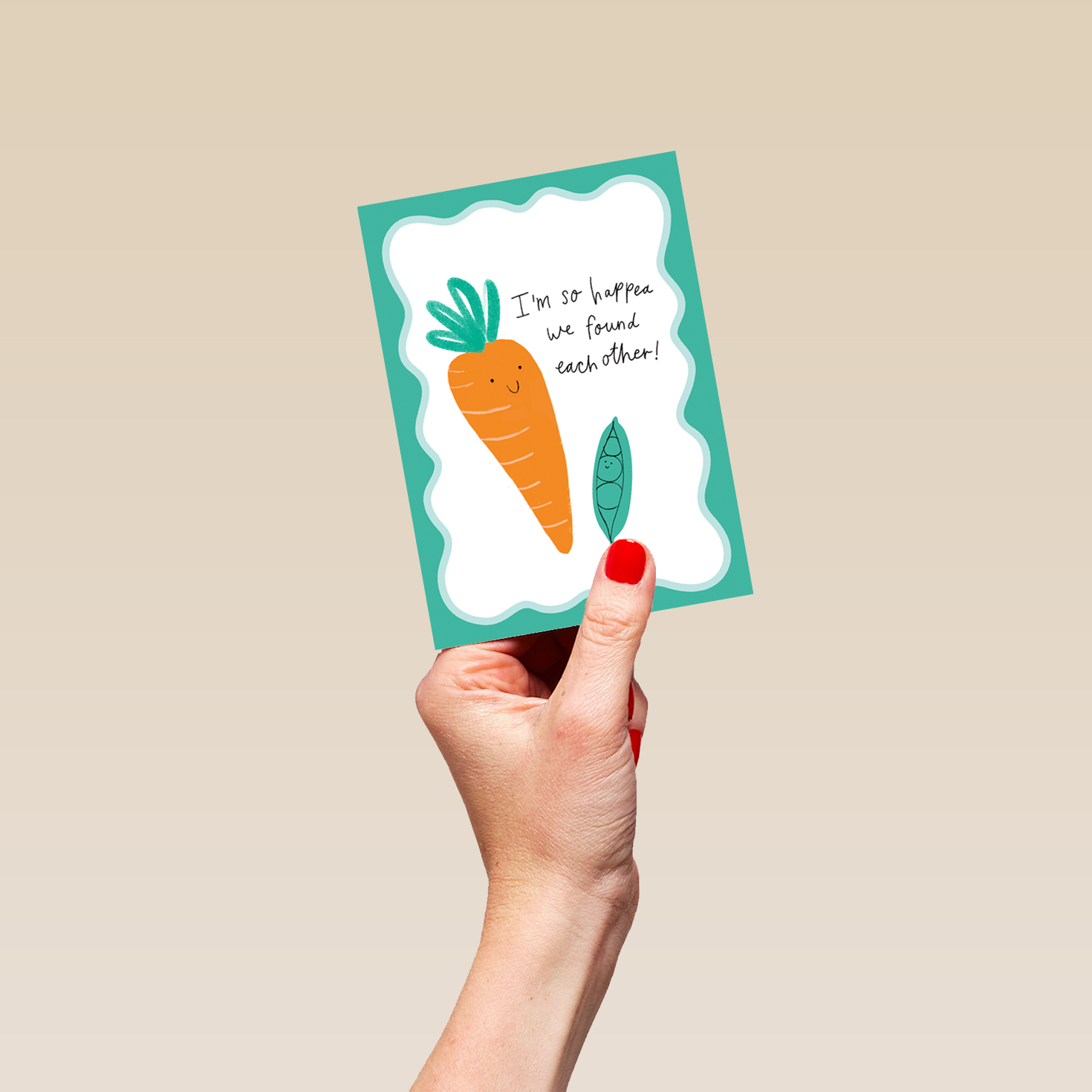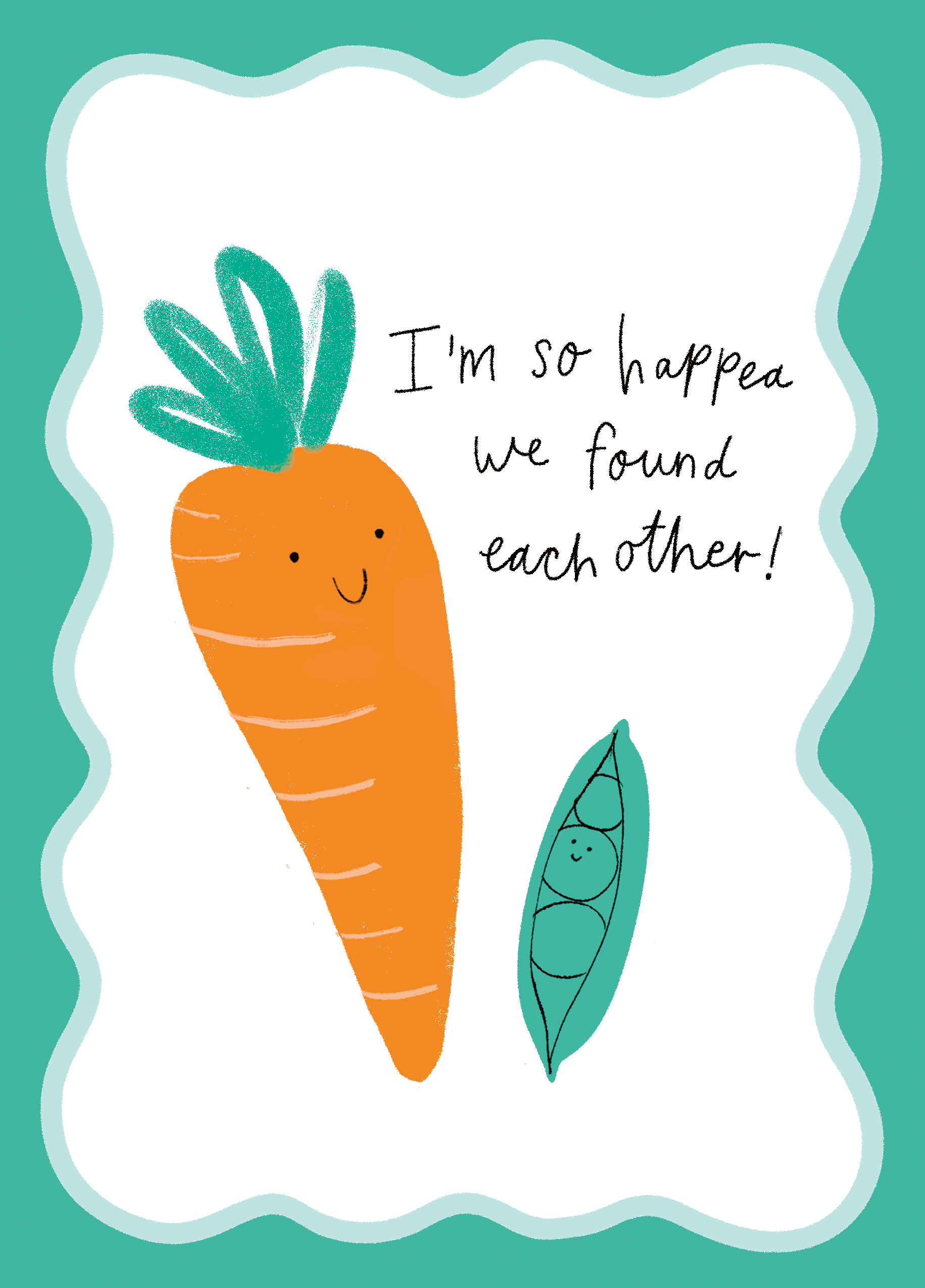 Printed on premium-quality board, this card features a cute carrot and peas in a pod with smiling faces, with the message 'I'm so happea we found each other!', and comes complete with a co-ordinating white envelope.
