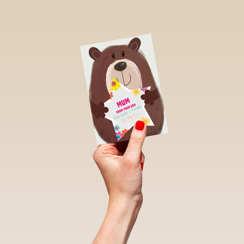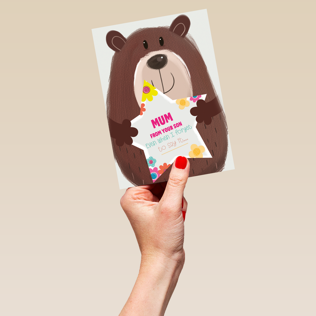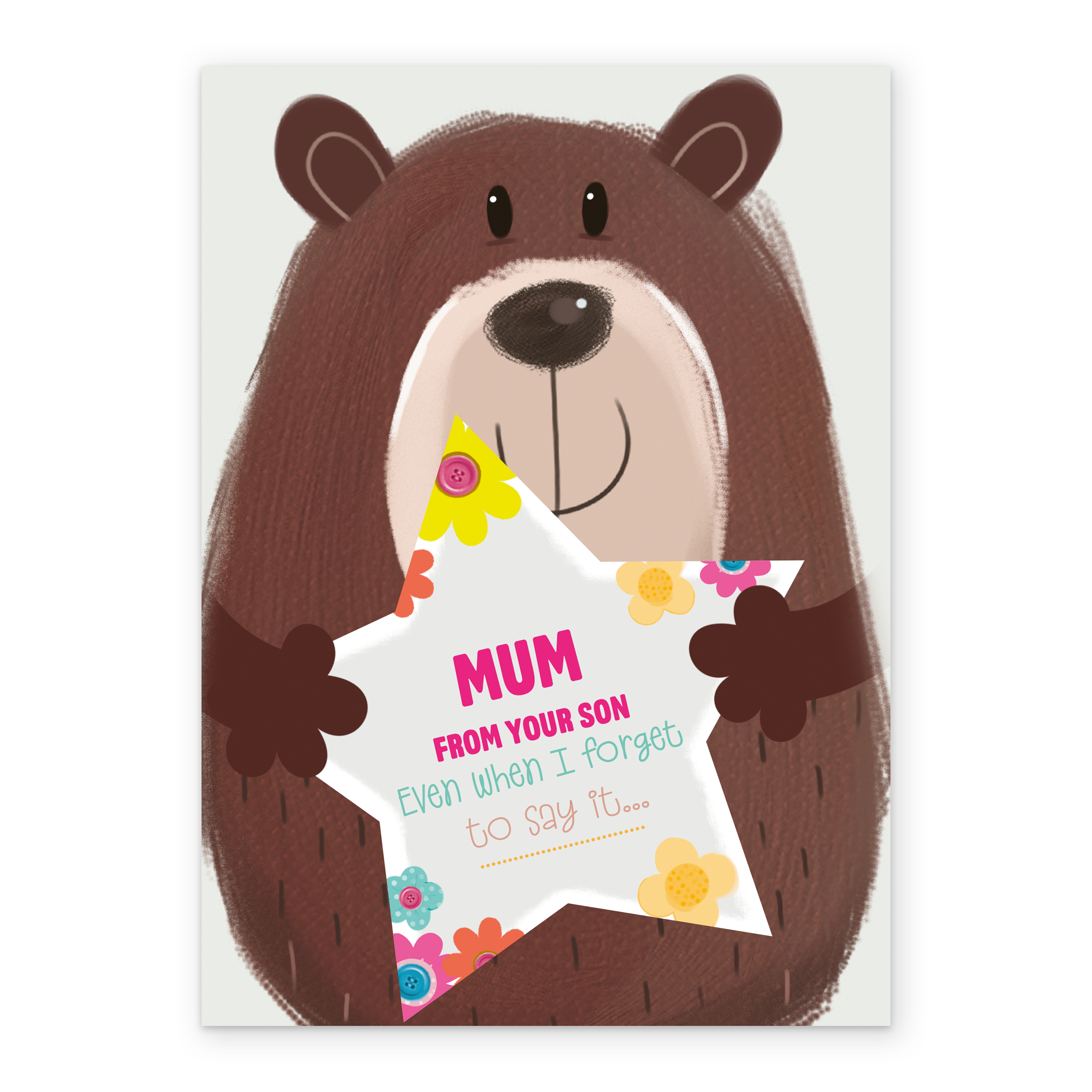 Printed on premium-quality board, this card features a cute illustrated bear holding a star decorated with colourful flowers, with the message 'Mum from your son. Even when I forget to say it…', space to personalise a name, and comes complete with a co-ordinating white envelope.