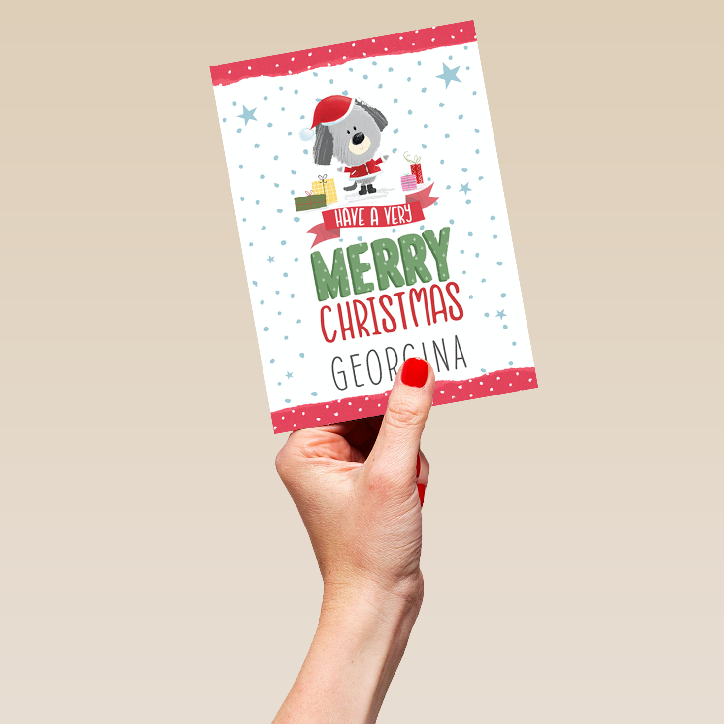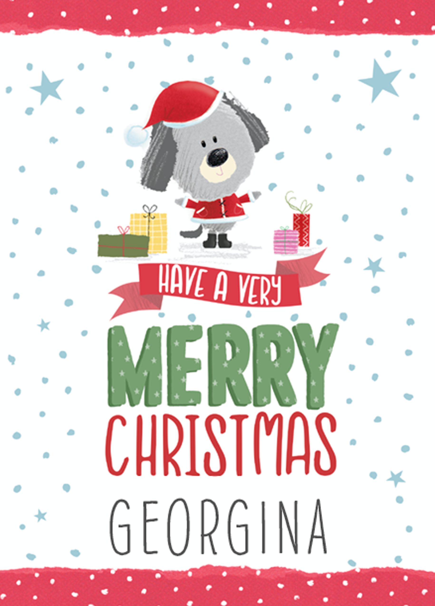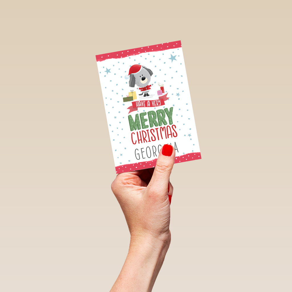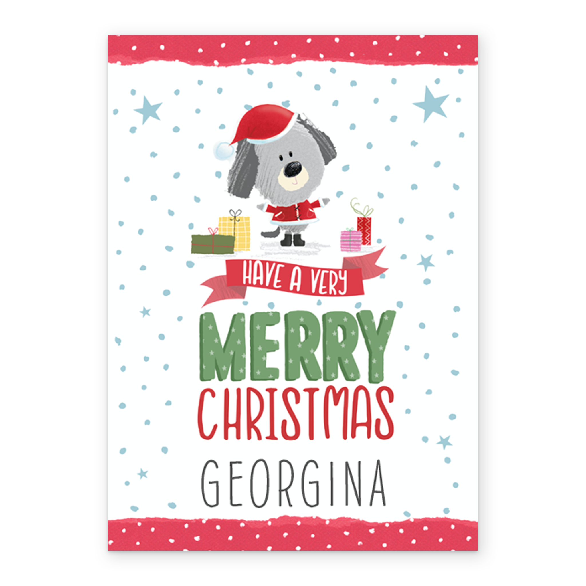 Show them you care with a personalised cute Christmas dotty dog Santa card from Hallmark. Our greetings cards are printed on premium quality, FSC®-certified card & delivered nationwide. This card is available as standard 12cm by 16.7cm and large 15.5cm by 21.6cm.