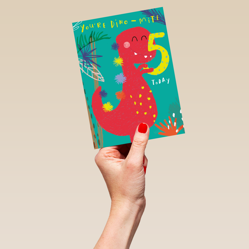 Show them you care with a personalised cute colourful smiley dinosaur 5th birthday card from Hallmark. Our greetings cards are printed on premium quality, FSC®-certified card & delivered nationwide.