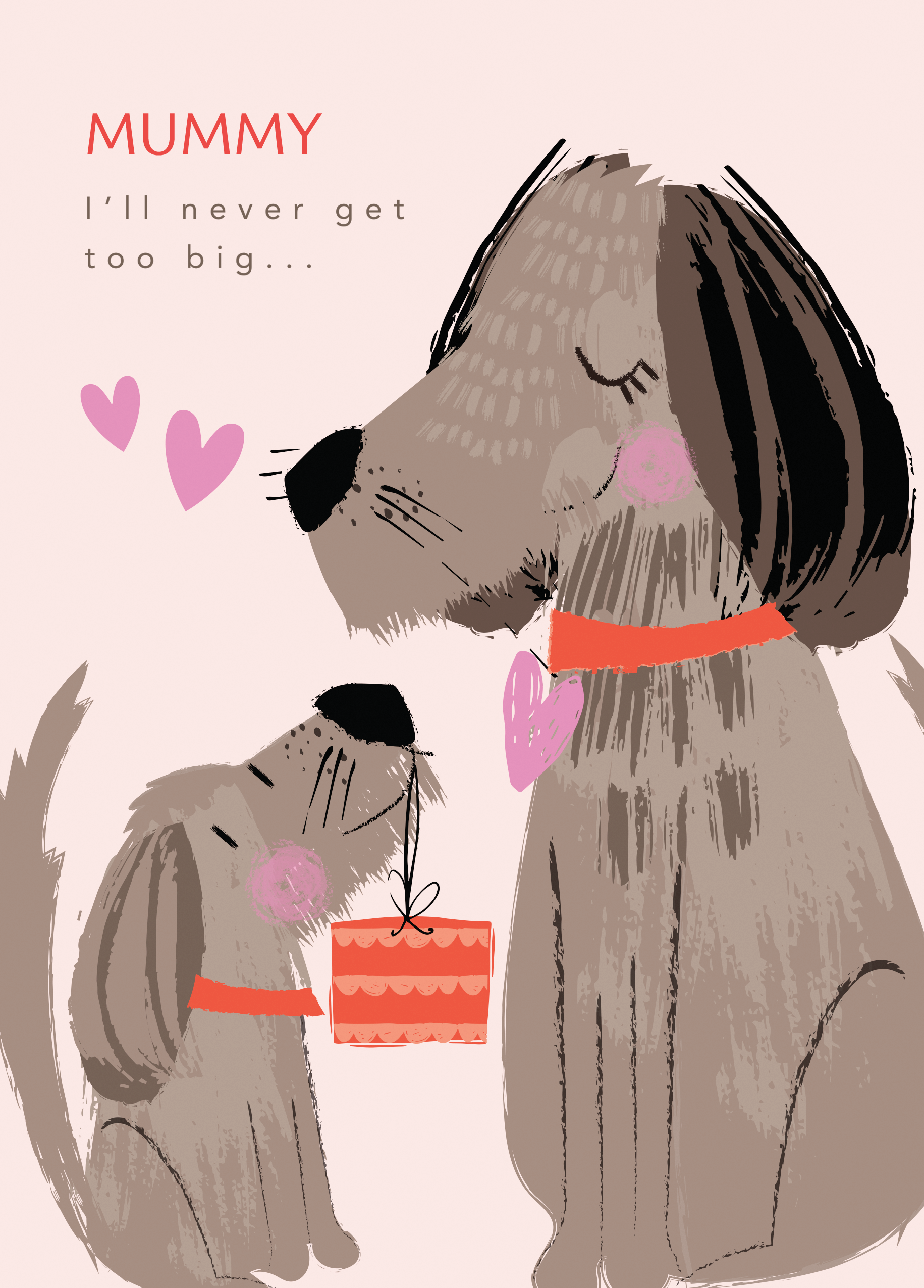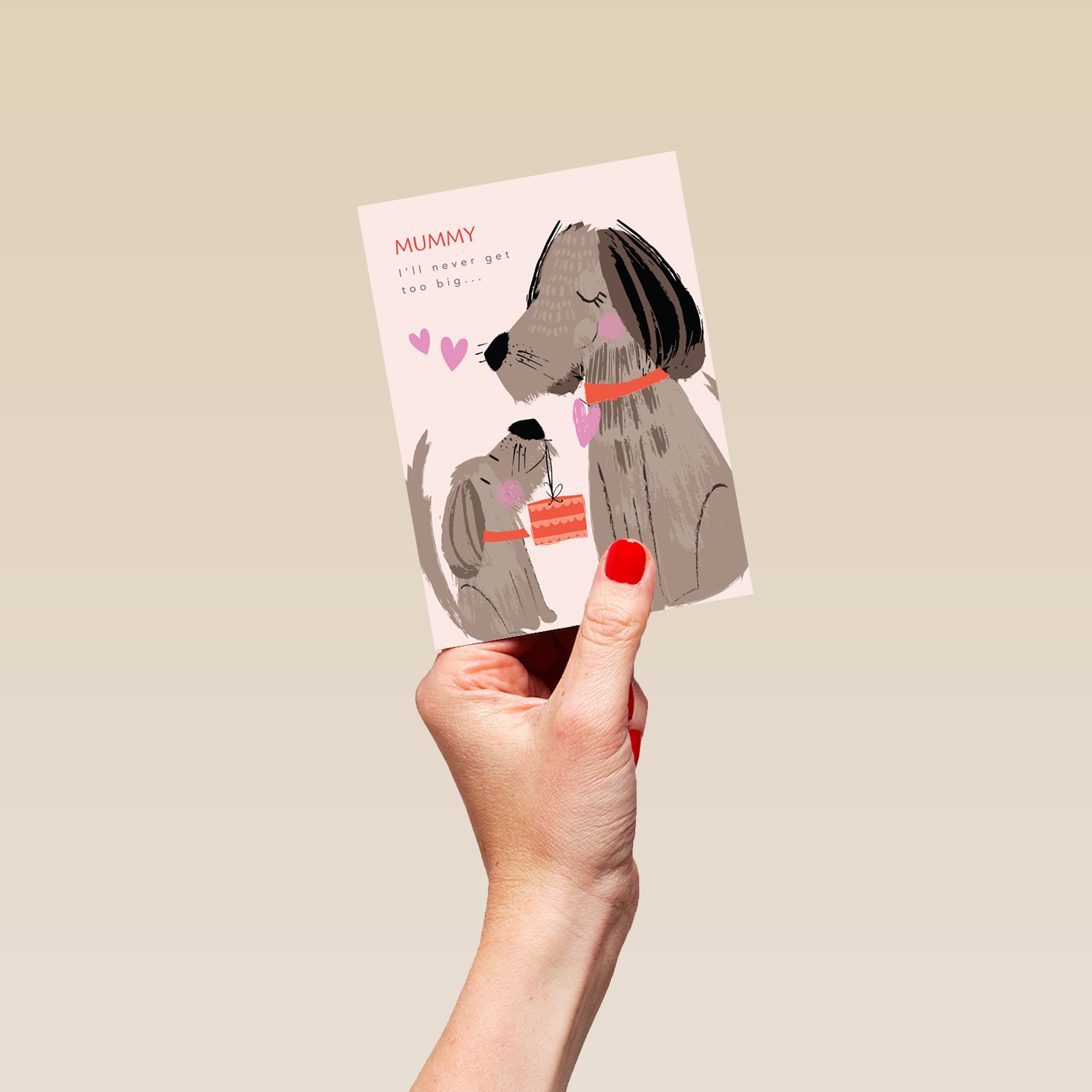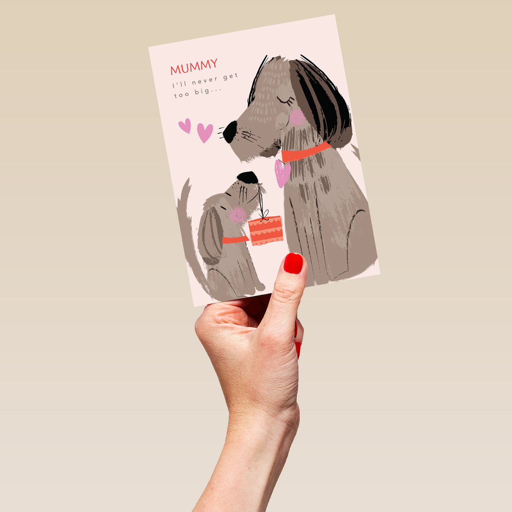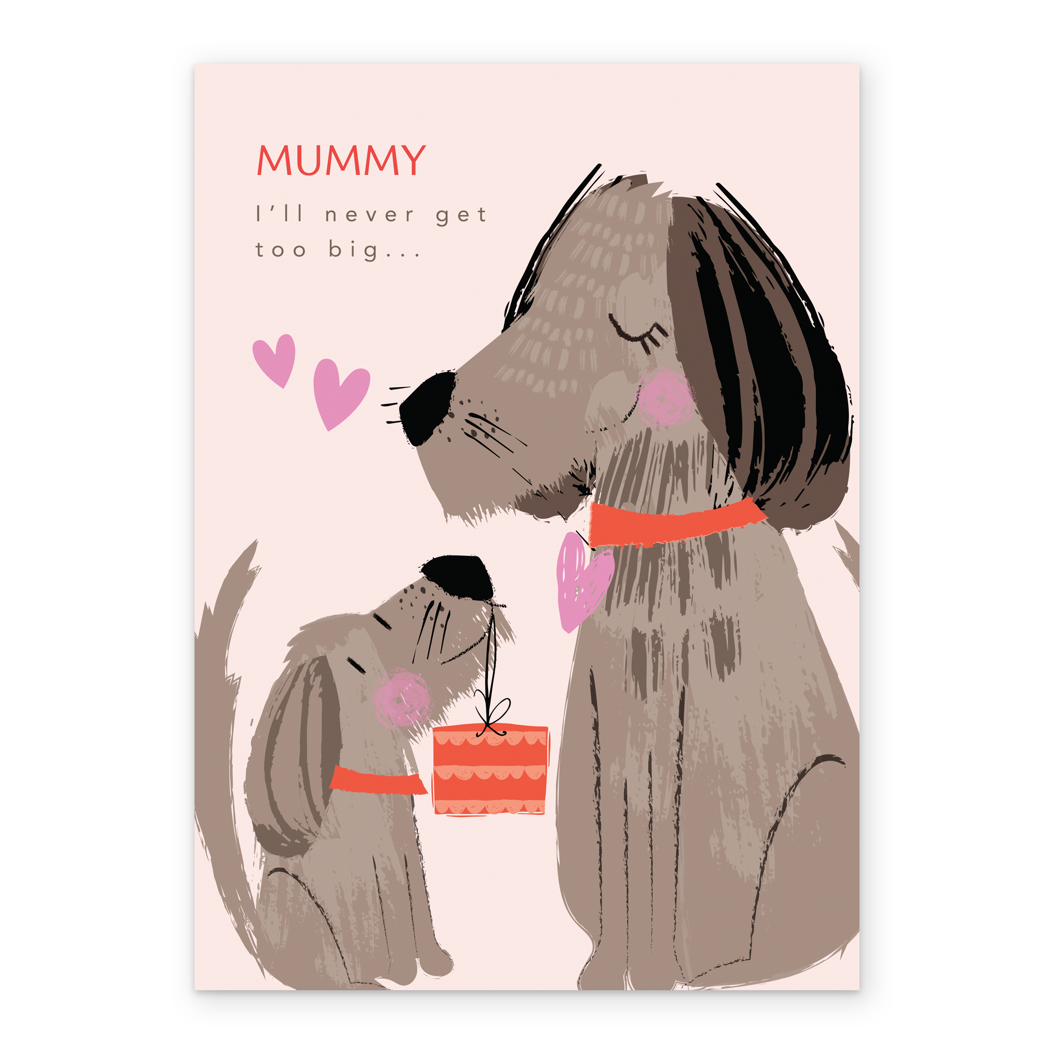 Printed on premium-quality board, this card features a cute illustration of a mother dog receiving a gift from her puppy, with the message 'Mummy I'll never get too big...', space to personalise a name, and comes complete with a co-ordinating white envelope.