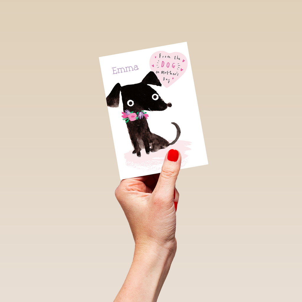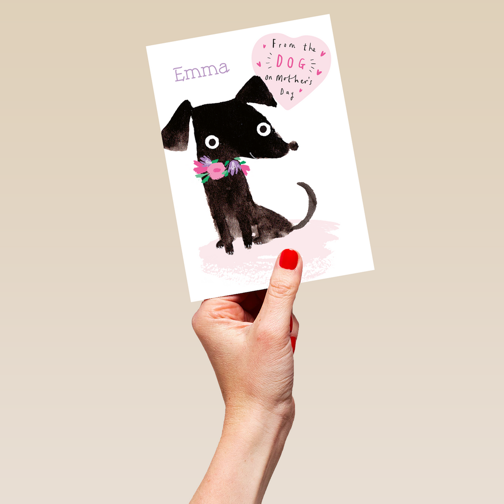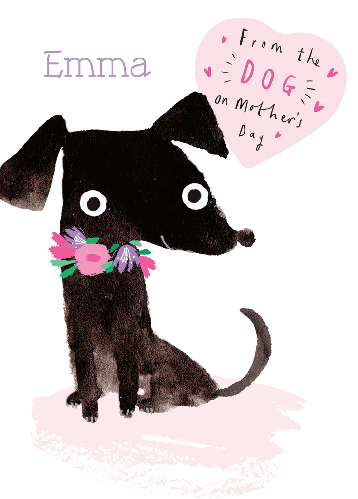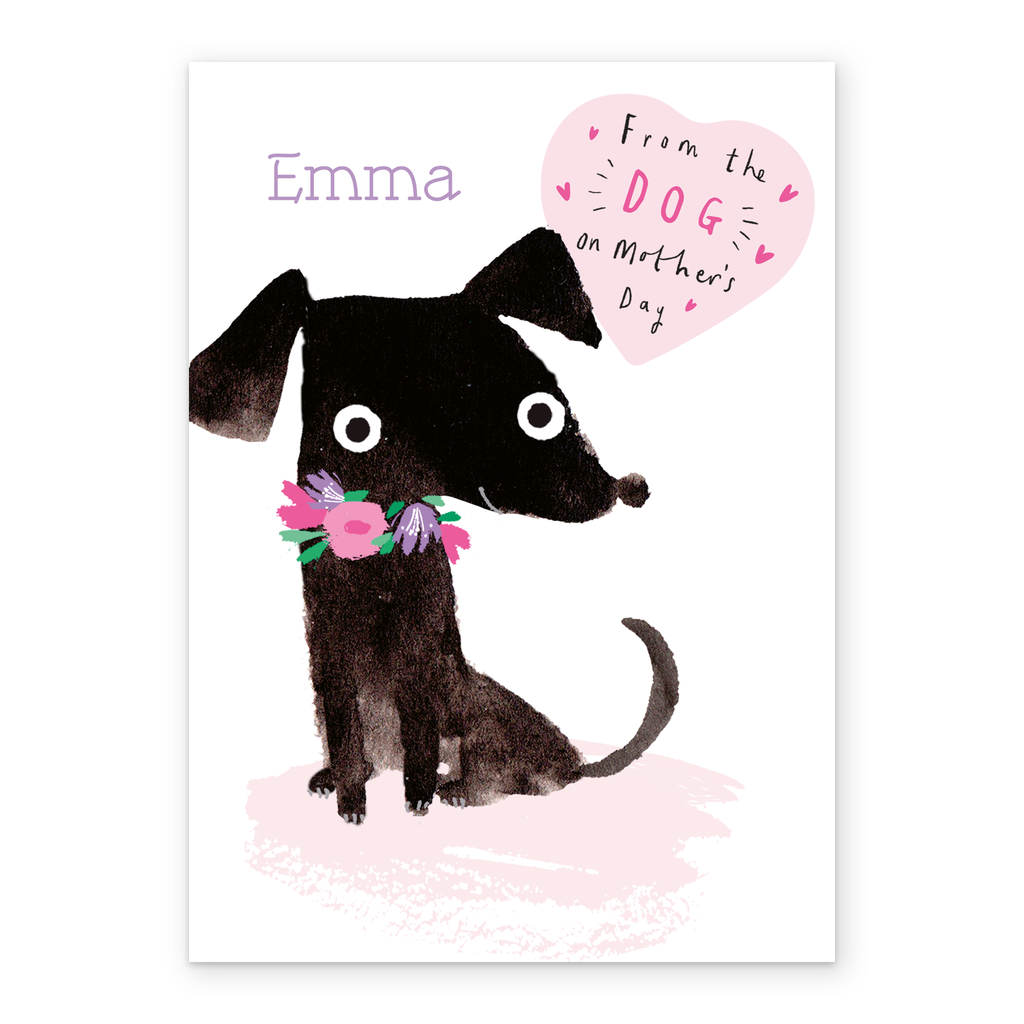 Printed on premium-quality board, this card features a cute illustrated black dog wearing a floral collar, and a light pink heart, on a white background, with the message 'From the dog on Mother's Day', space to personalise a name, and comes complete with a co-ordinating white envelope.