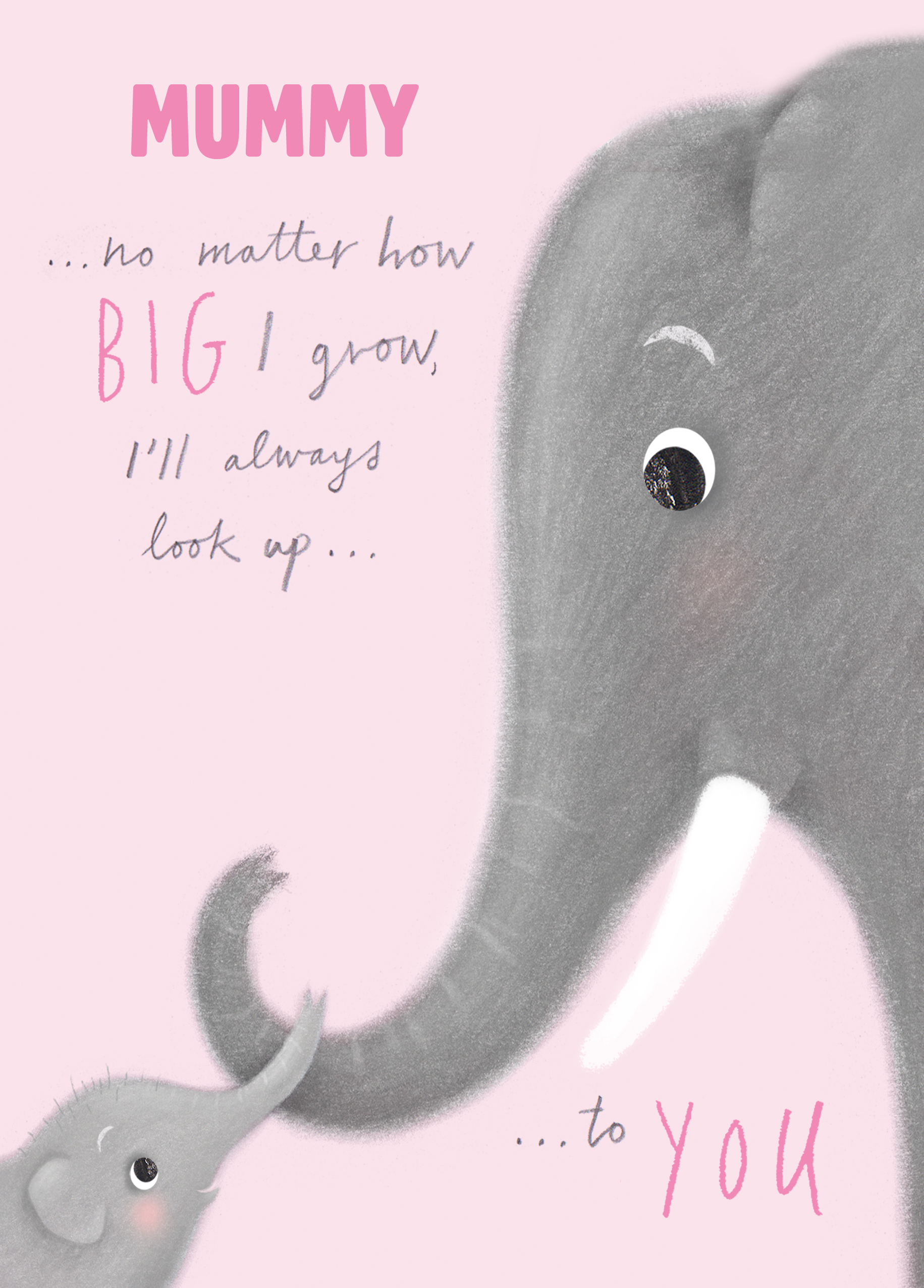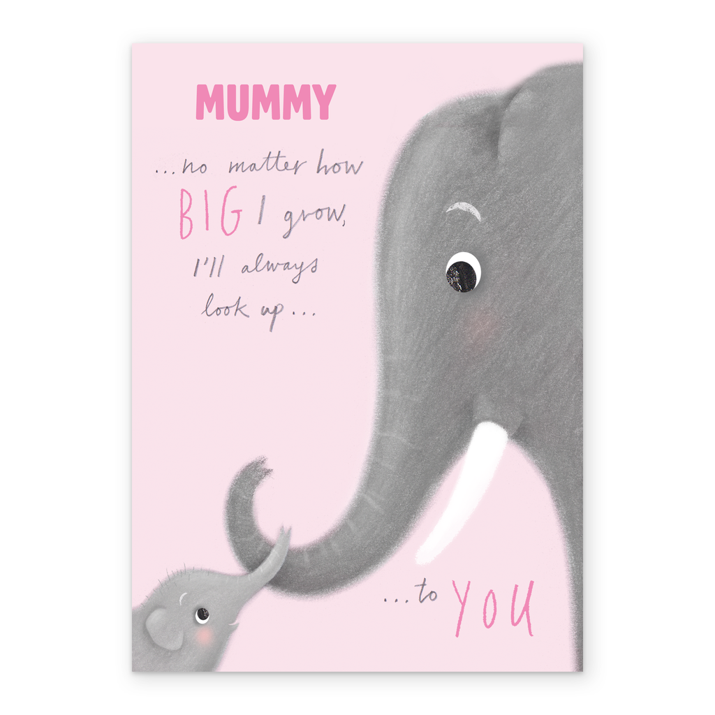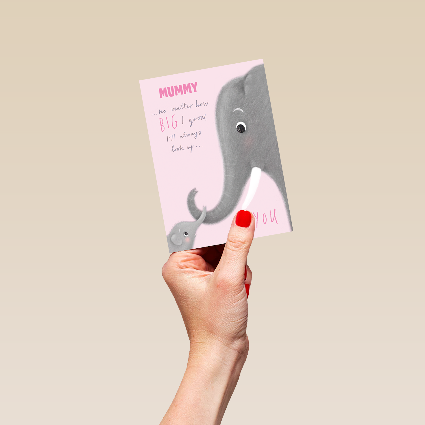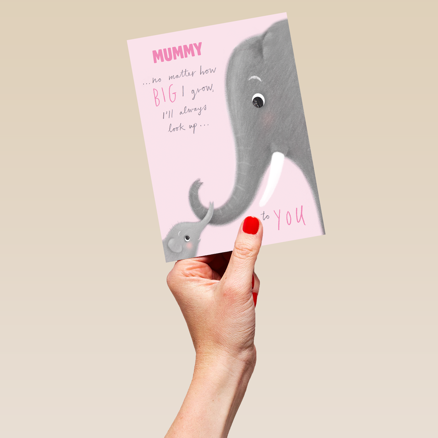 Printed on premium-quality board, this card features a cute illustrated mummy and baby elephant on a light pink background, with the message 'Mummy …no matter how big I grow, I'll always look up… ...to you', space to personalise a name, and comes complete with a co-ordinating white envelope.