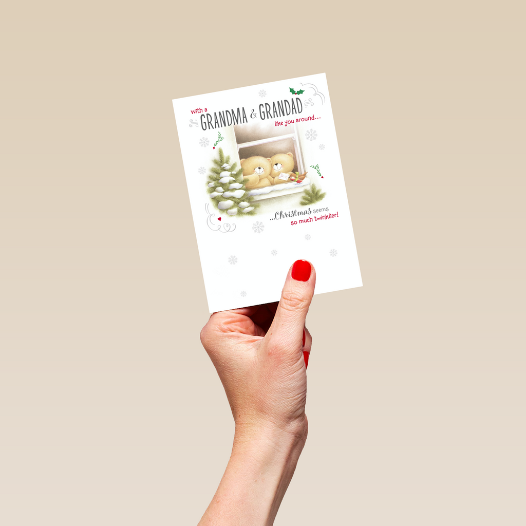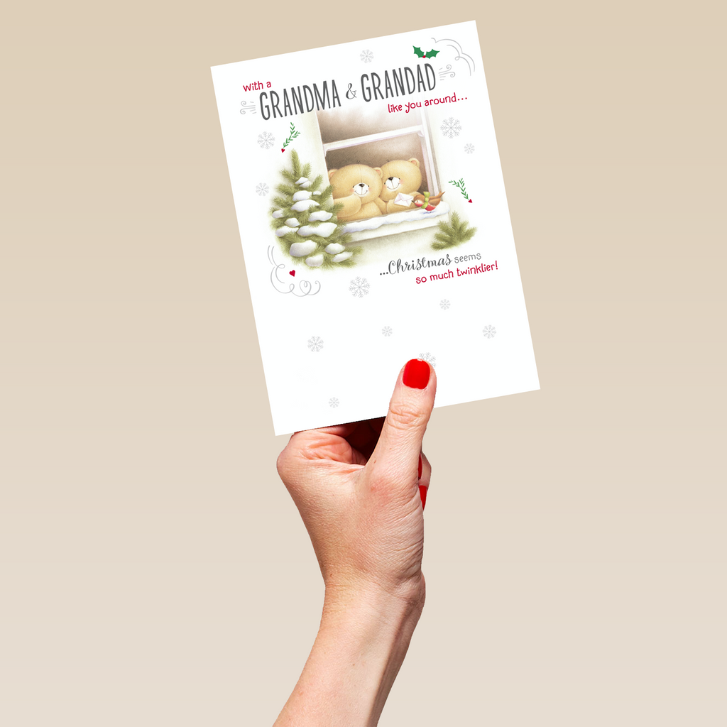 Show them you care with a personalised cute Christmas card for grandma and grandad from Hallmark. Our Christmas cards are printed on premium quality, FSC®-certified card & delivered nationwide. This card is available as standard 12cm by 16.7cm and large 15.5cm by 21.6cm.