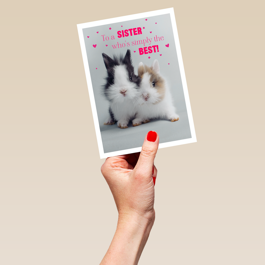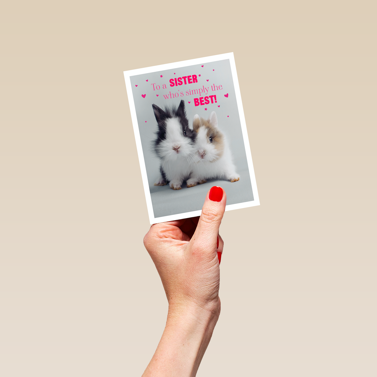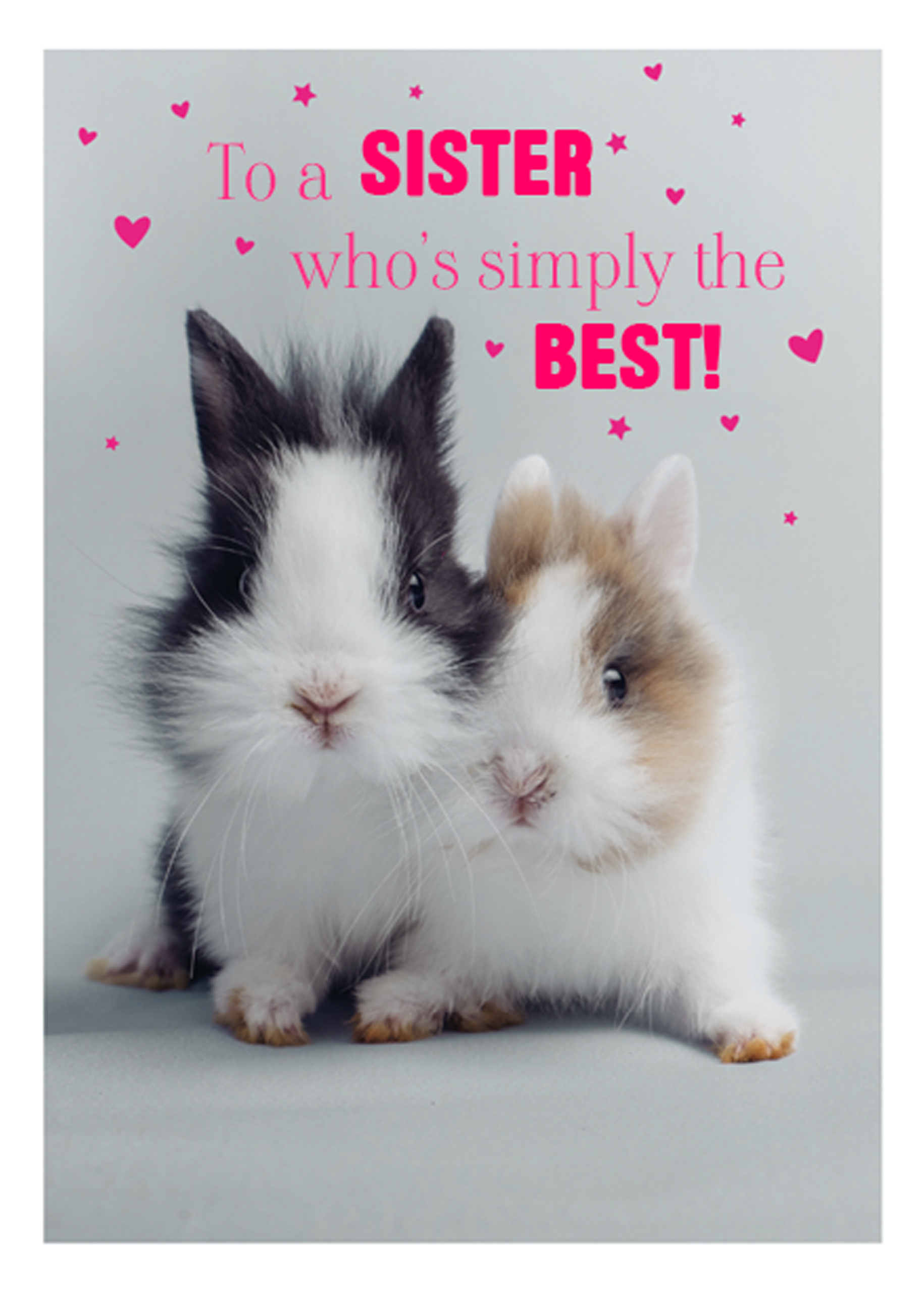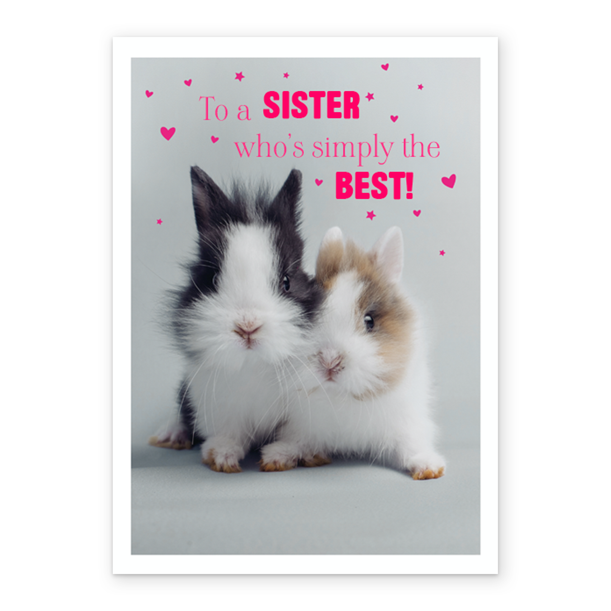Show them you care with a personalised cute guinea pig sister card from Hallmark. Our greetings cards are printed on premium quality, FSC®-certified card & delivered nationwide. This card is available as standard 12cm by 16.7cm and large 15.5cm by 21.6cm.