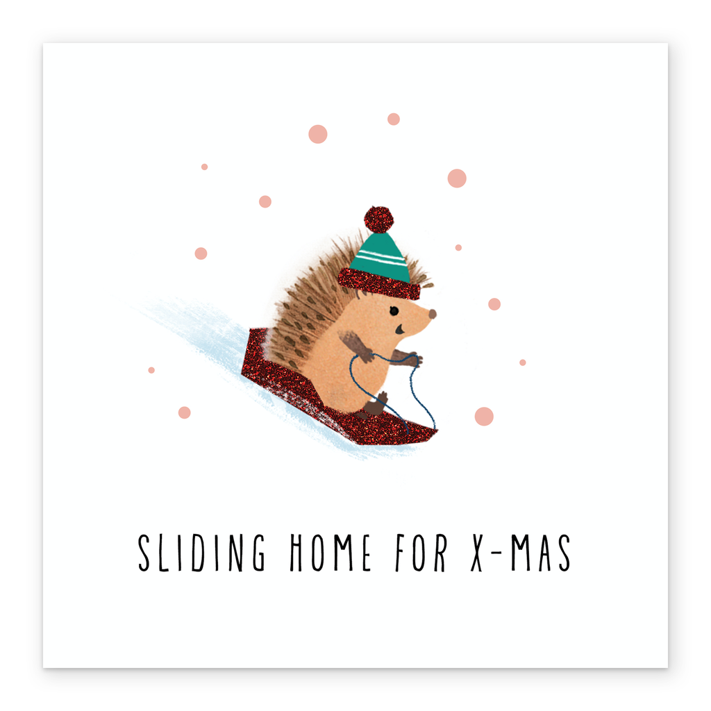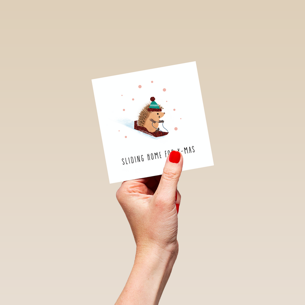 Show them you care with a personalised cute hedgehog skis sliding home for Christmas card from Hallmark. Our greetings cards are printed on premium quality, FSC®-certified card & delivered nationwide. This card is available as standard 12cm by 12cm and large 15cm by 15cm.