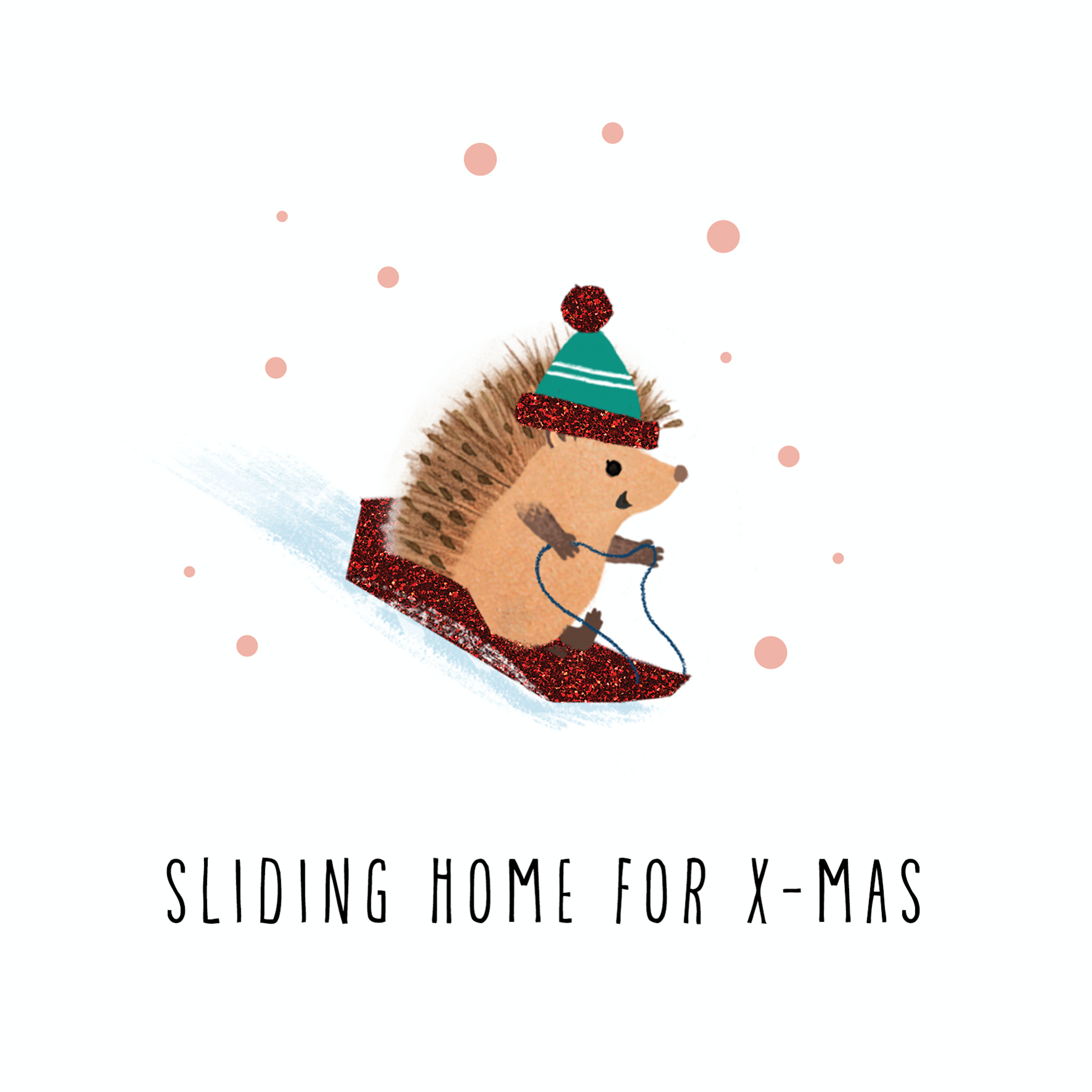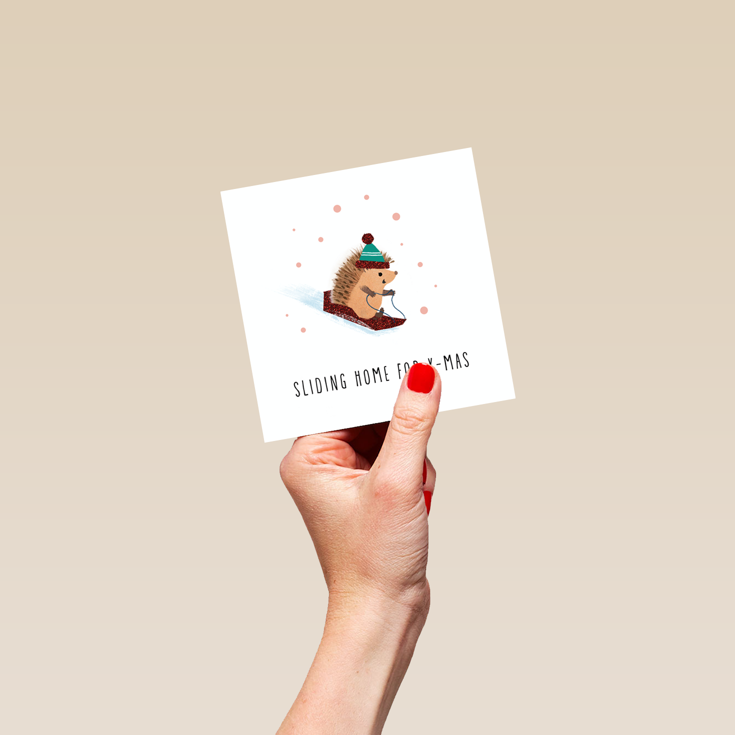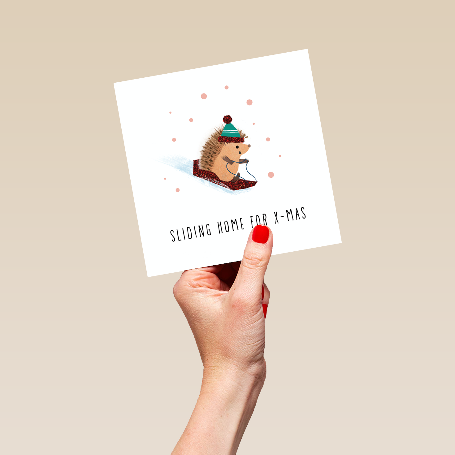 Show them you care with a personalised cute hedgehog skis sliding home for Christmas card from... View more details