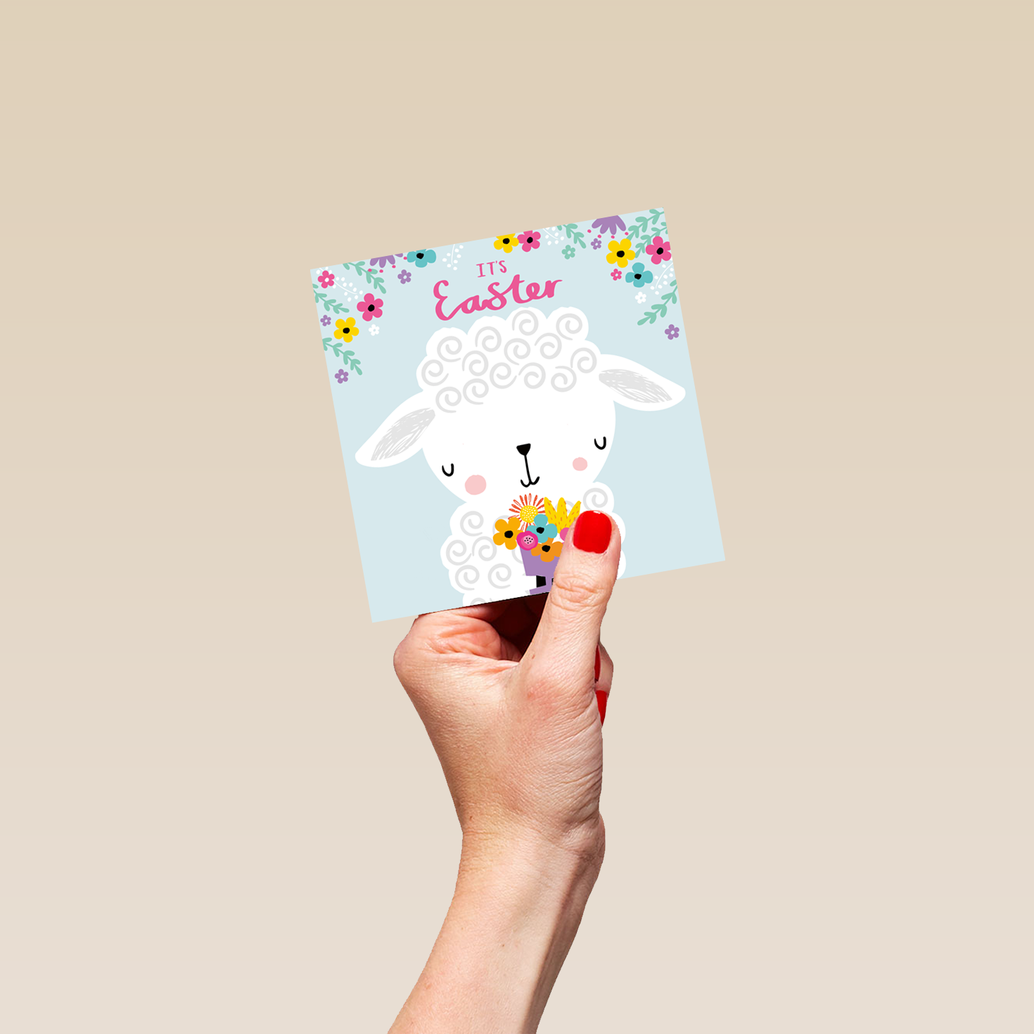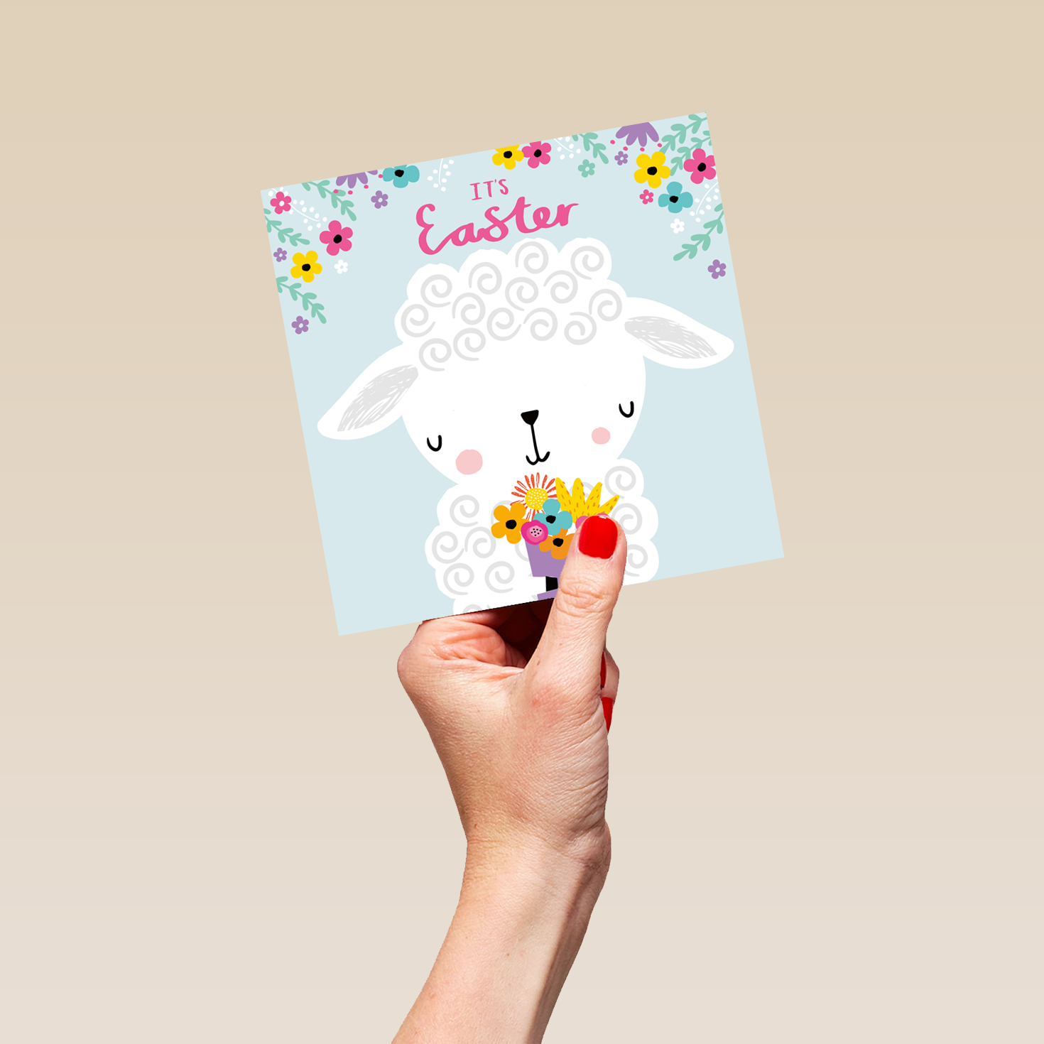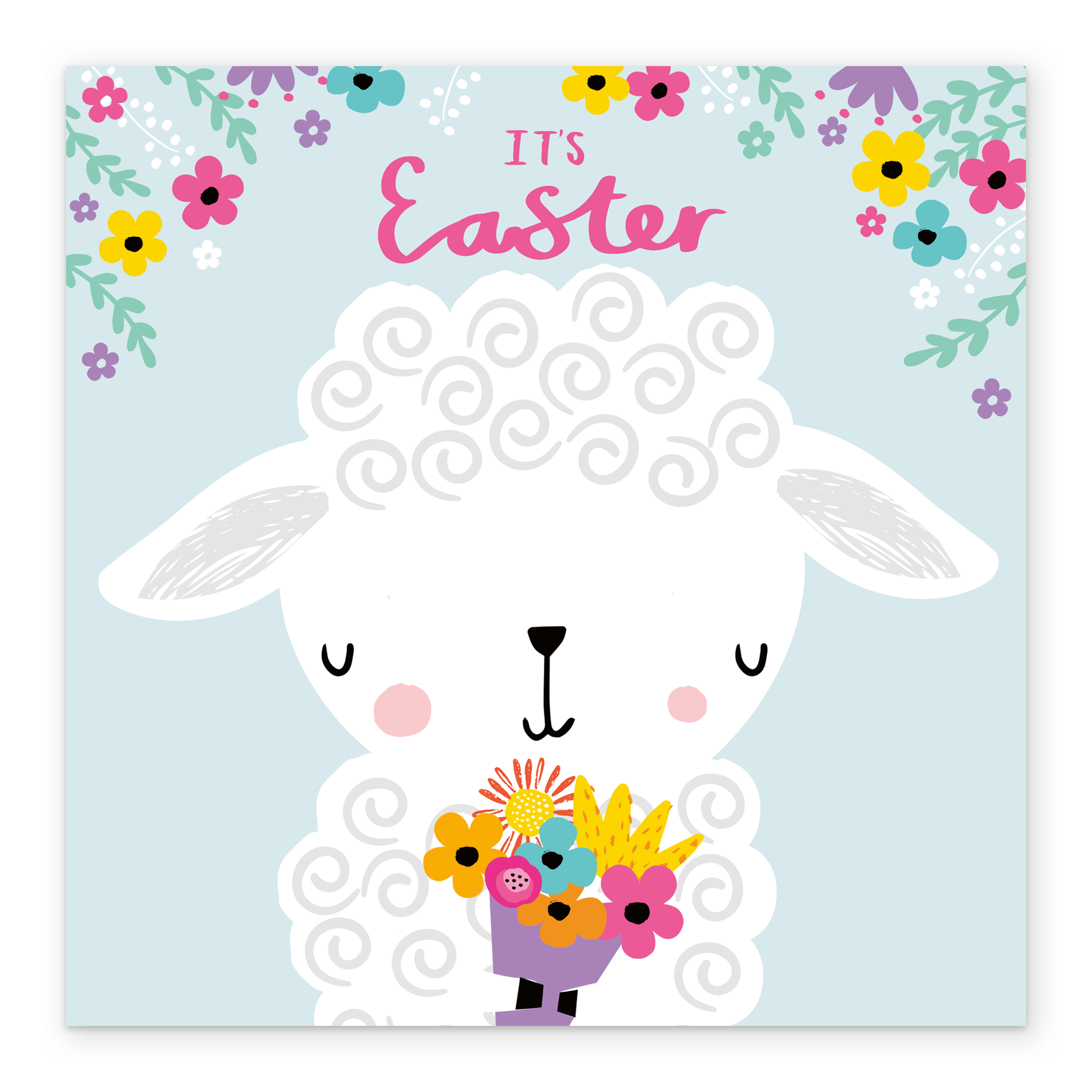 Printed on premium-quality board, this card features a cute illustrated lamb holding a colourful bouquet of spring flowers, on a light blue background with floral embelishments, with the message 'It's Easter', and comes complete with a co-ordinating white envelope.