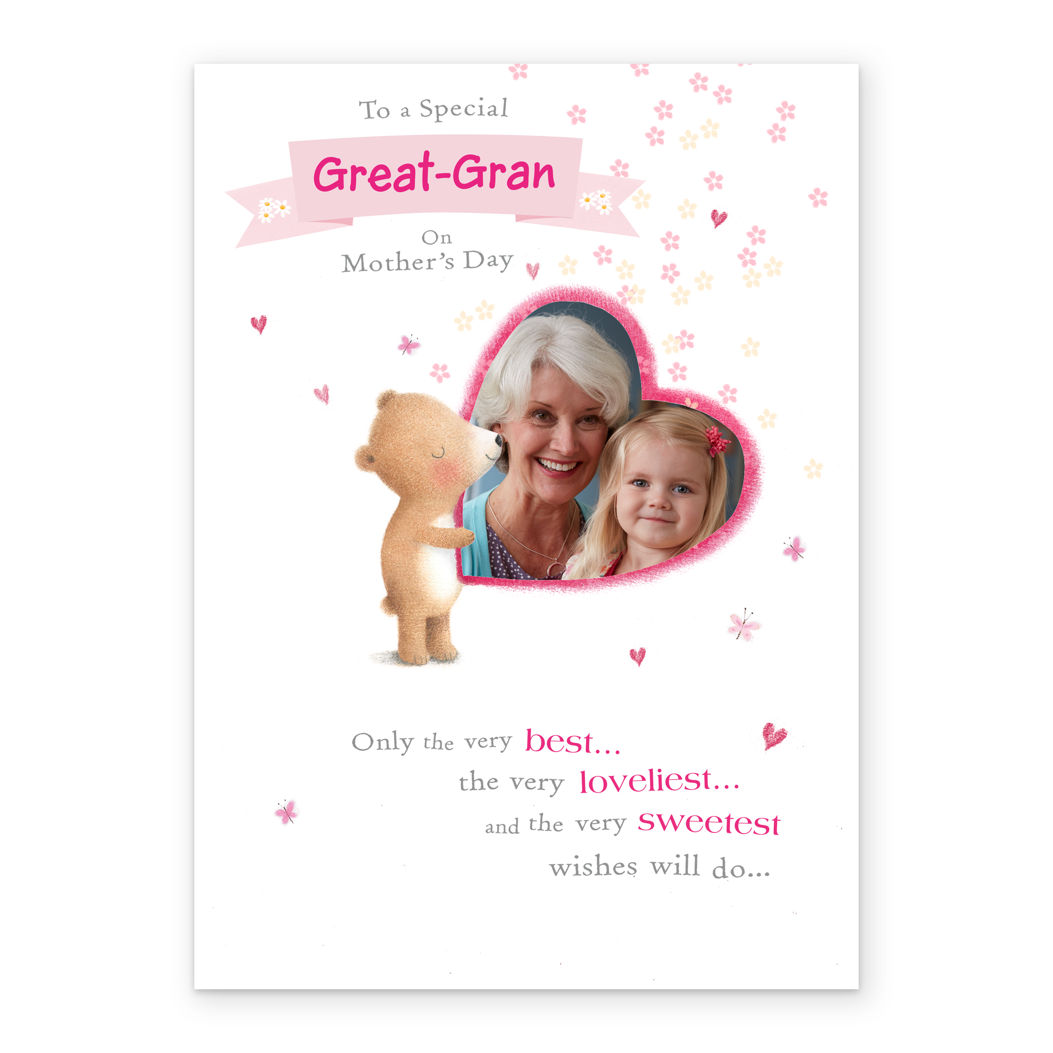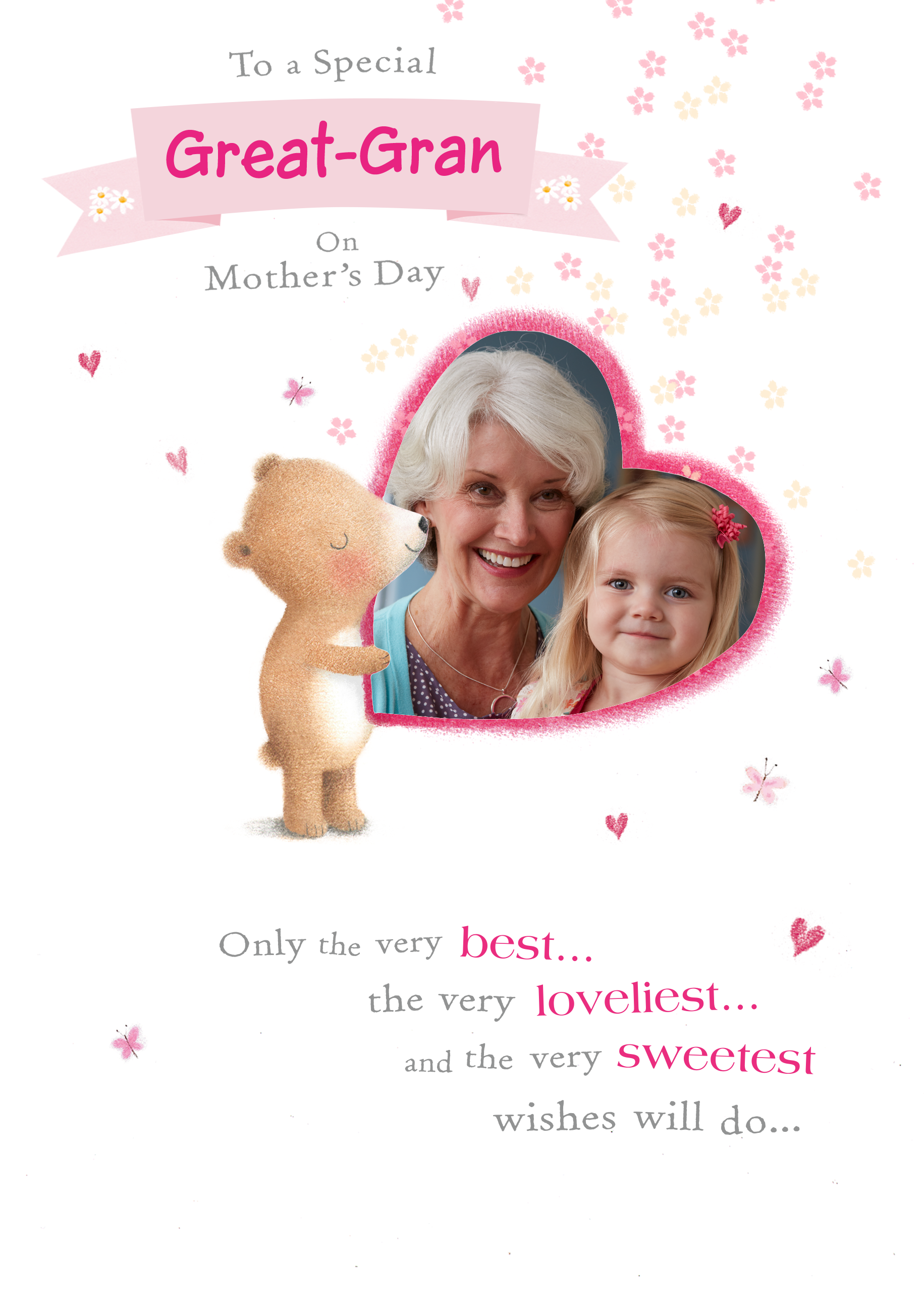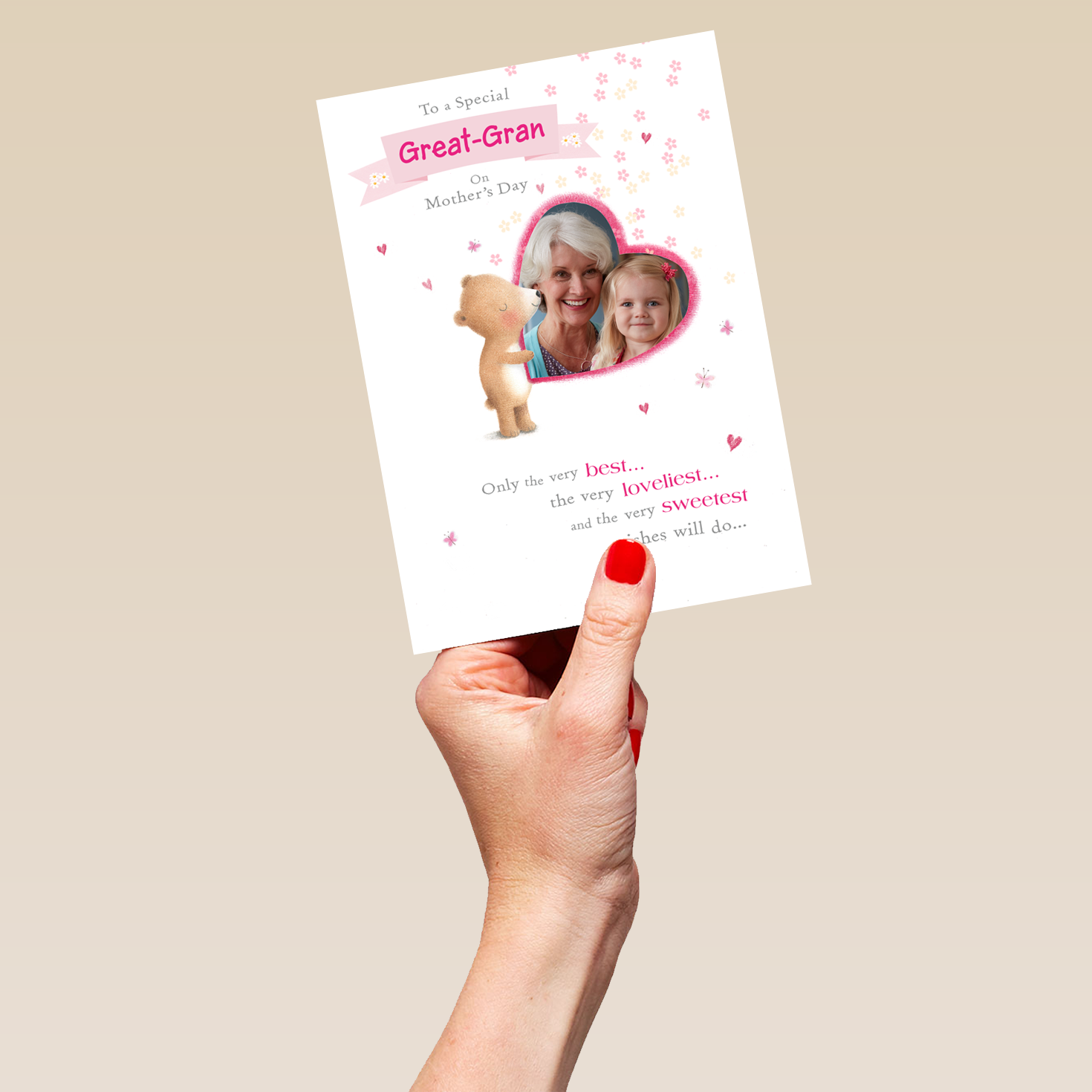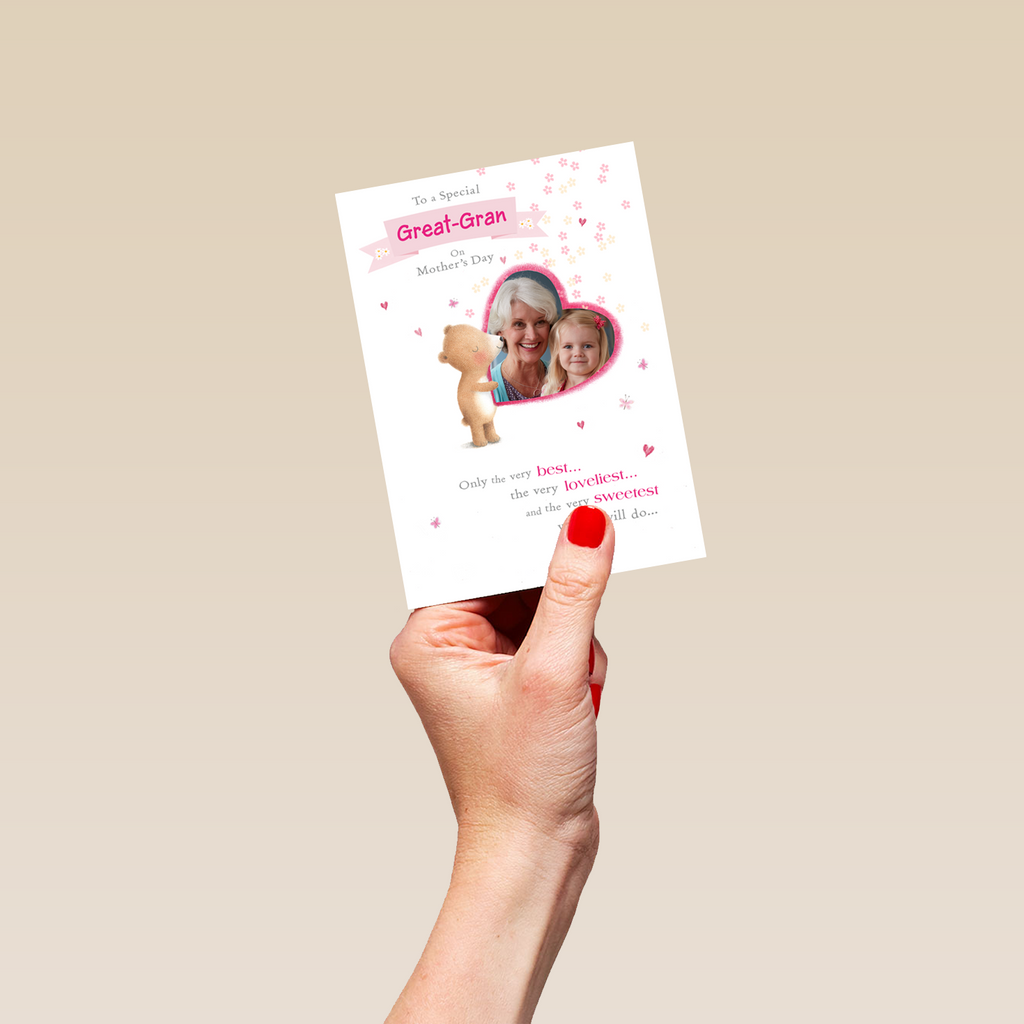 Printed on premium-quality board, this card features a cute illustrated bear hugging a heart, with the message 'To a special Great-Gran on Mother's Day. Only the very best… the very loveliest… and the very sweetest wishes will do…', space to upload a photo and personalise a name, and comes complete with a co-ordinating white envelope.