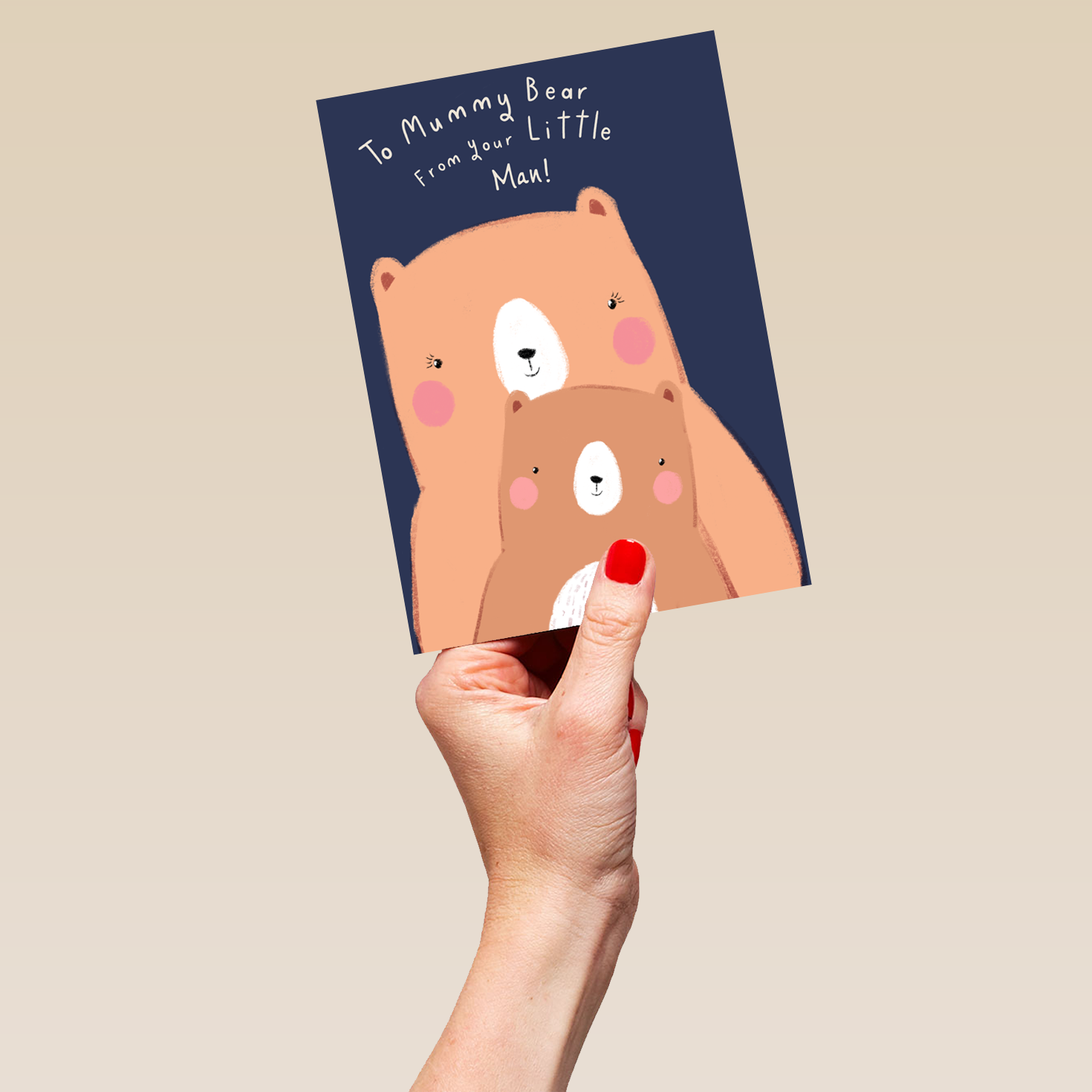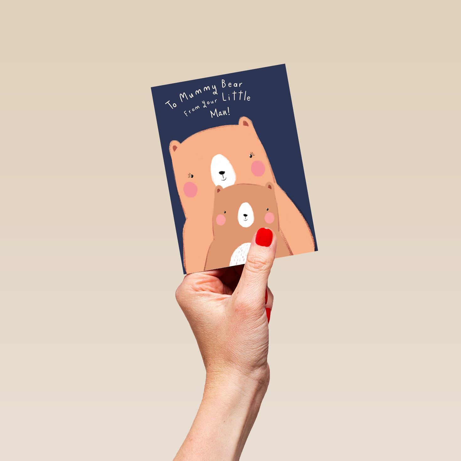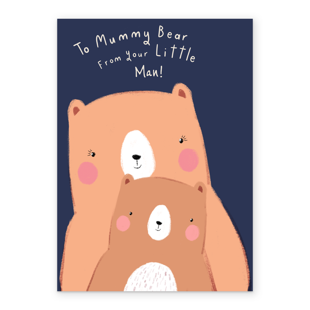 Printed on premium-quality board, this card features a cartoon mummy bear and child on a dark blue background, with the message 'To mummy bear from your little man!', space to personalise a name, and comes complete with a co-ordinating white envelope.