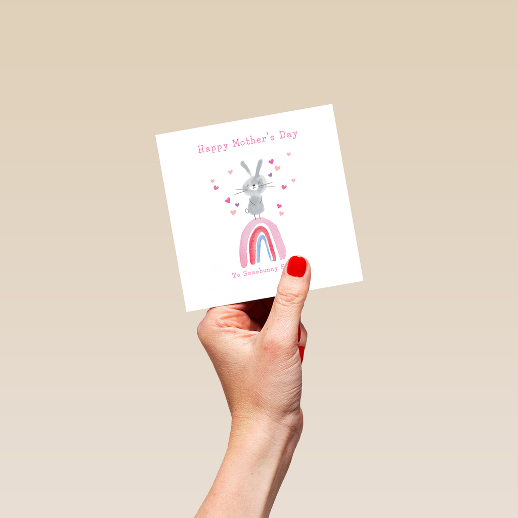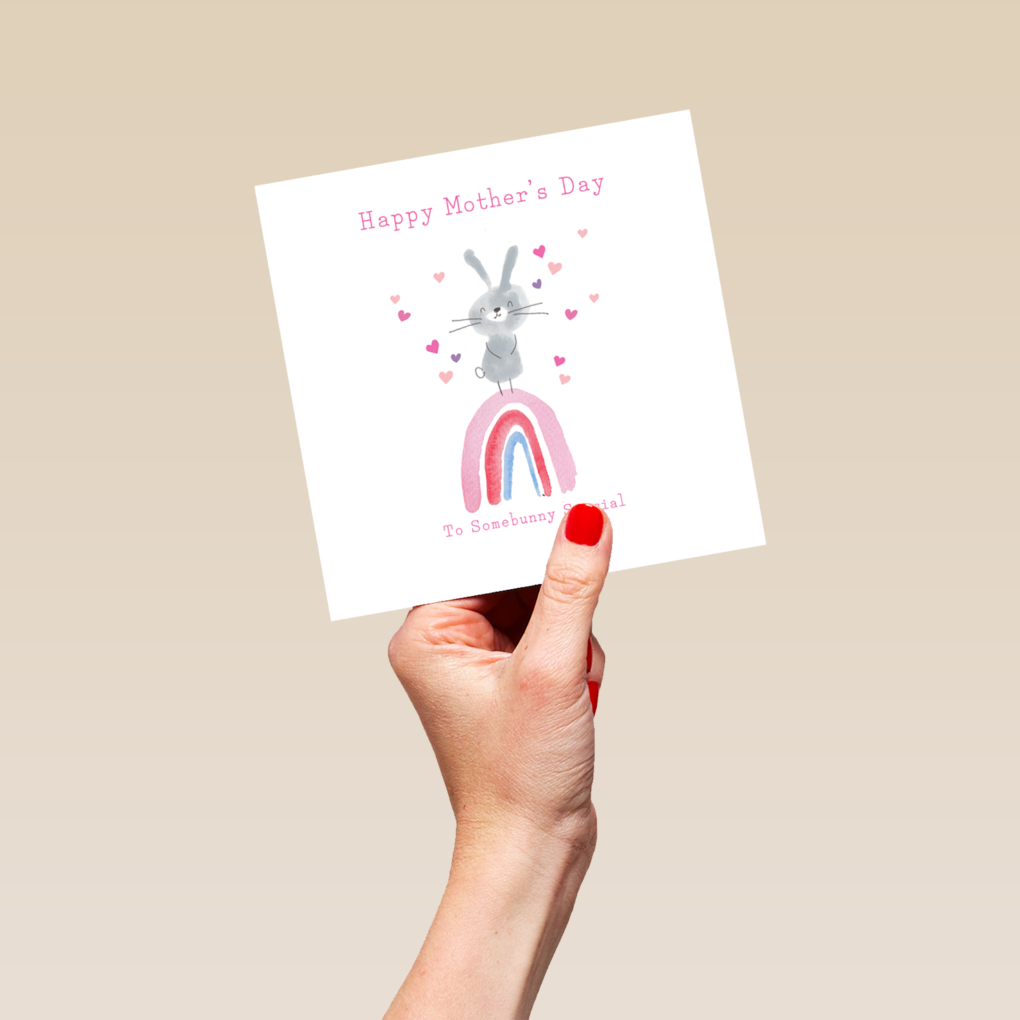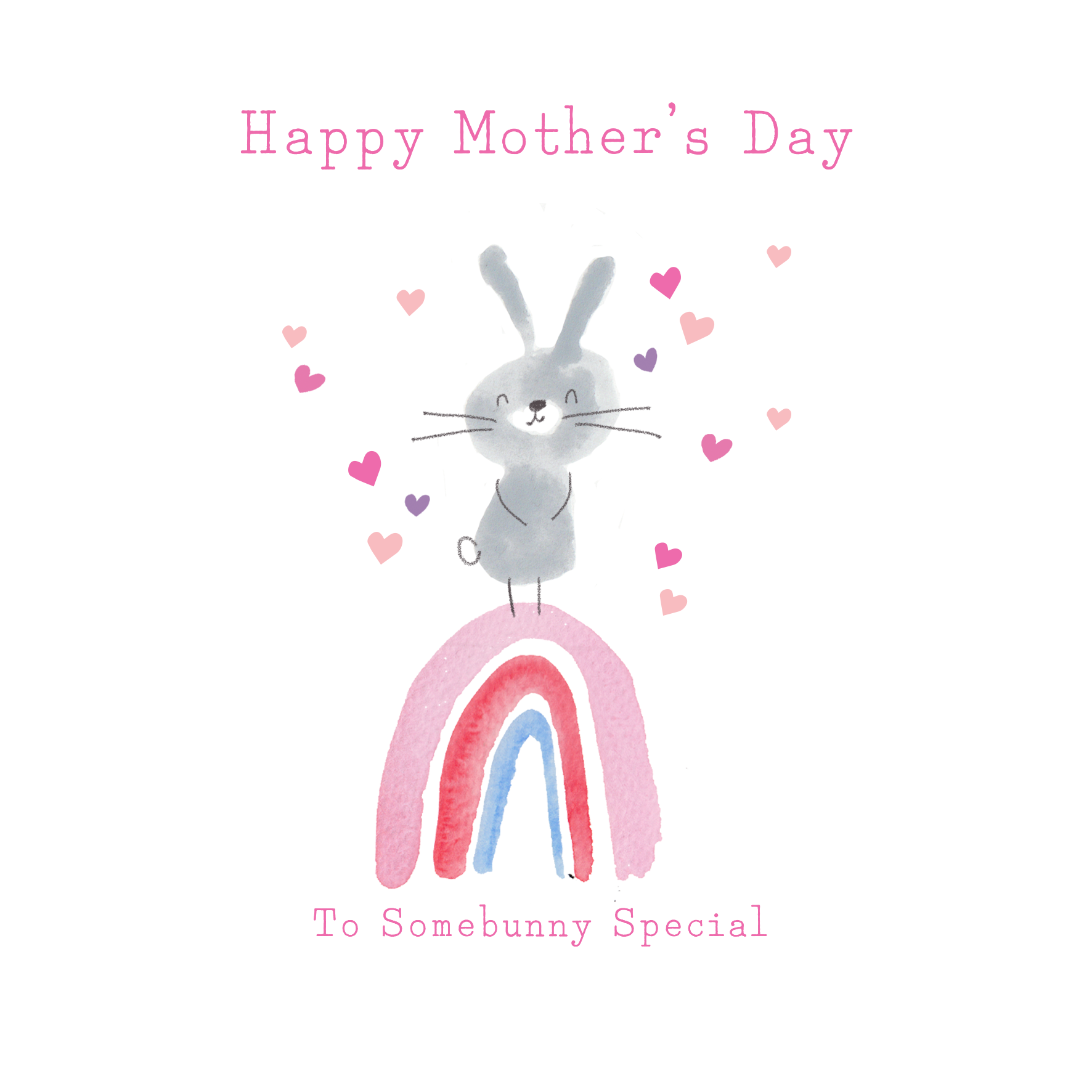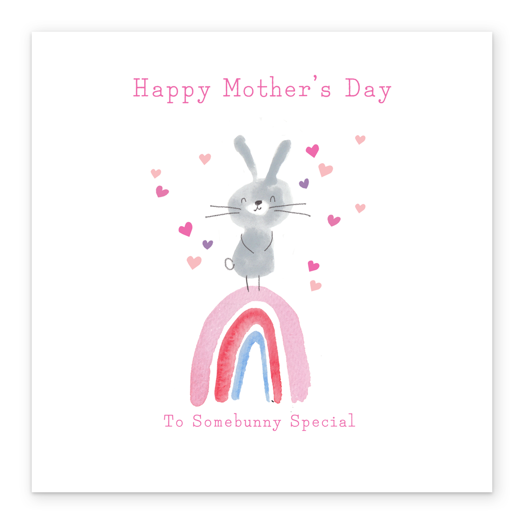Printed on premium-quality board, this card features a cute rabbit, stood on top of a pink rainbow with hearts, with the message 'Happy Mother's Day To Somebunny Special', and comes complete with a co-ordinating white envelope.