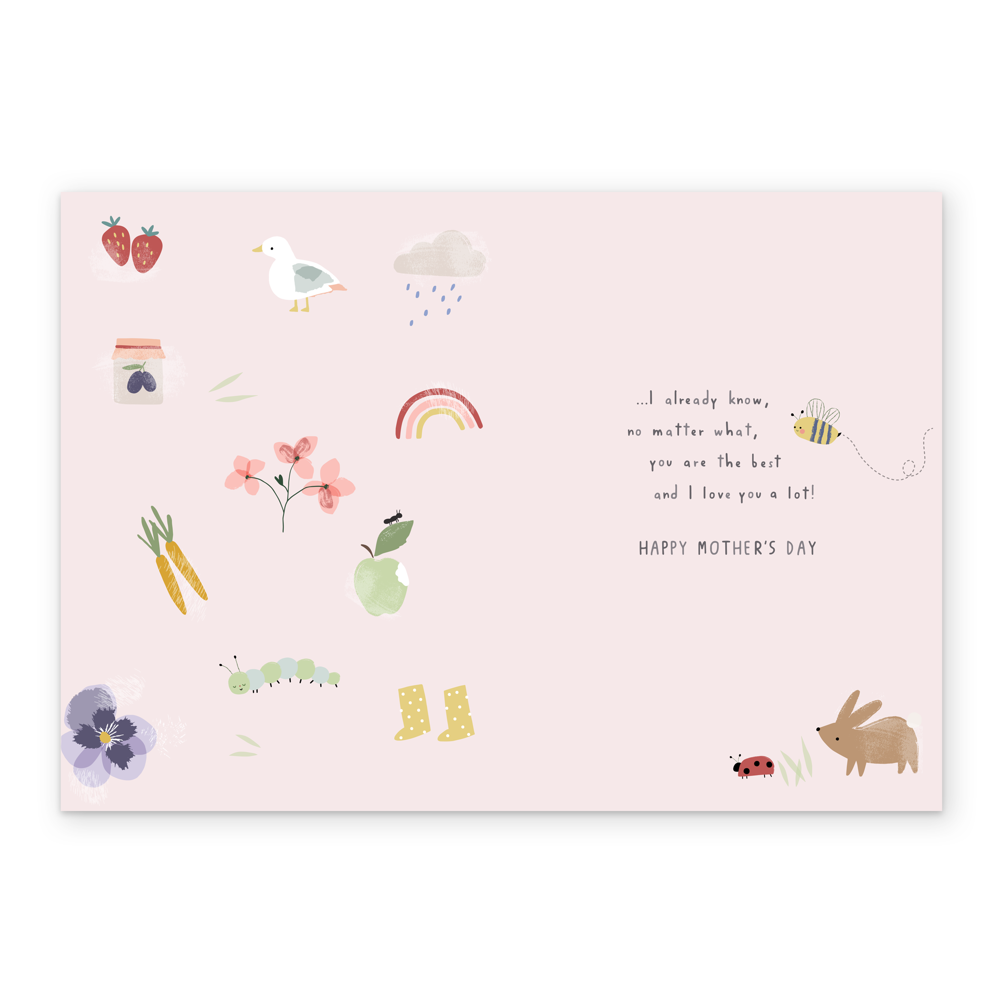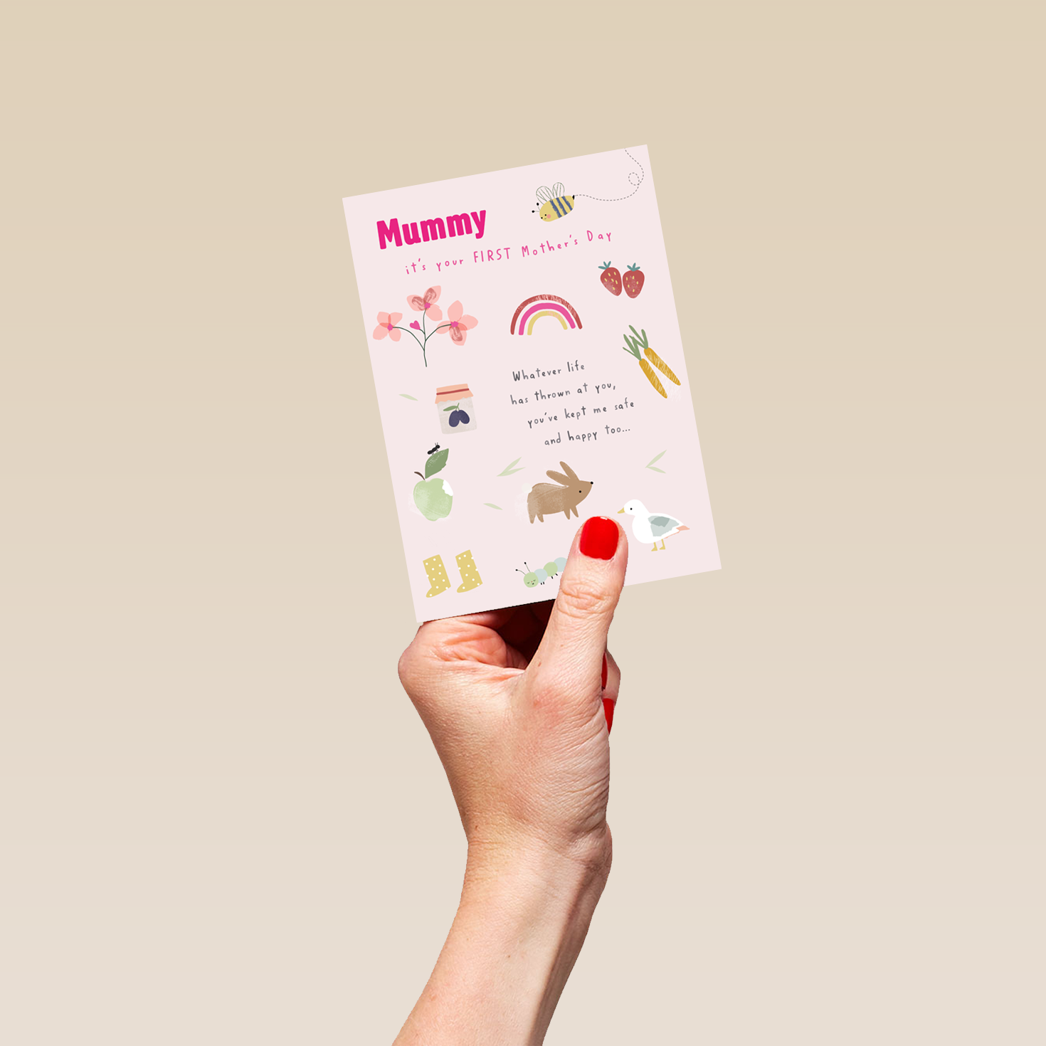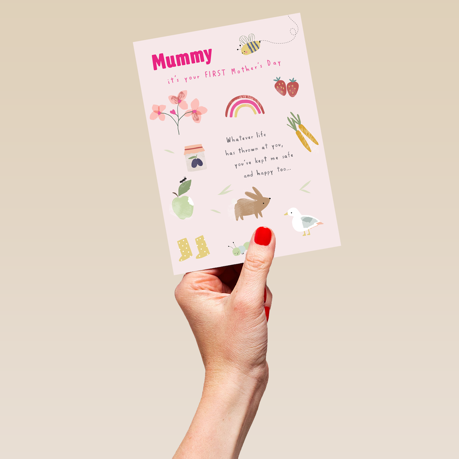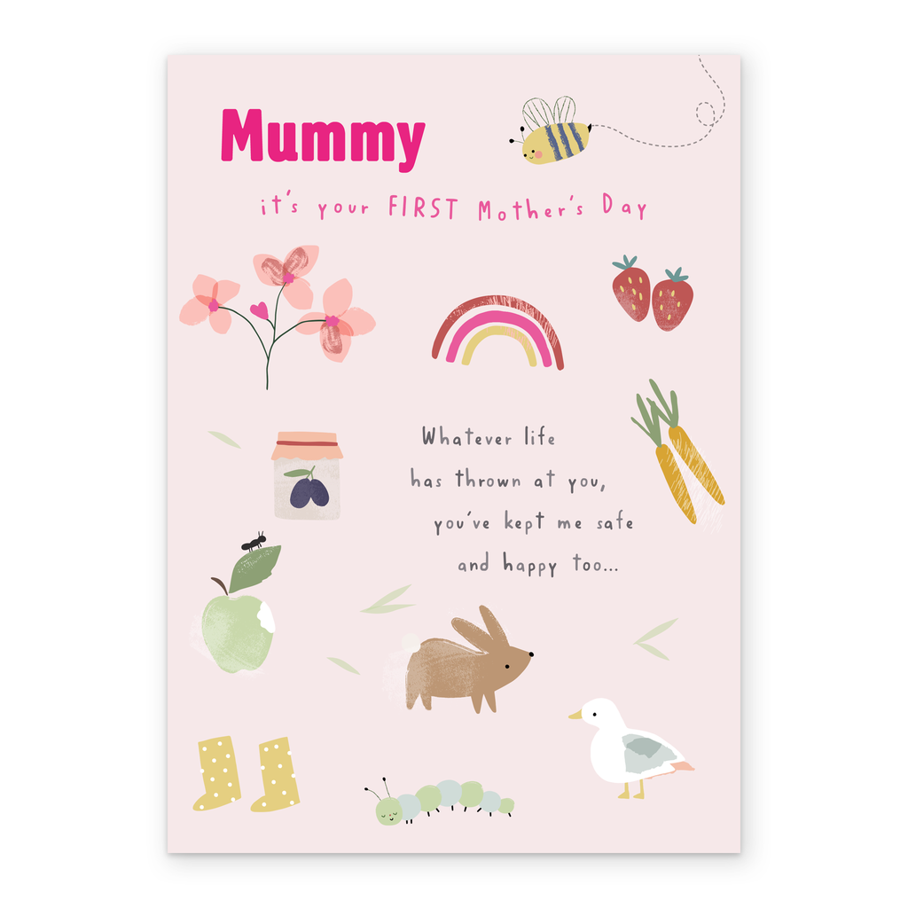Printed on premium-quality board, this card features cute illustrated animals, fruit, insects, plants and a rainbow on a light pink background, with the message 'Mummy it's your first Mother's Day. Whatever life has thrown at you, you've kept me safe and happy too…', space to personalise a name, and comes complete with a co-ordinating white envelope.