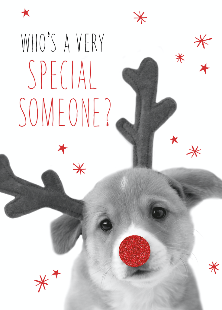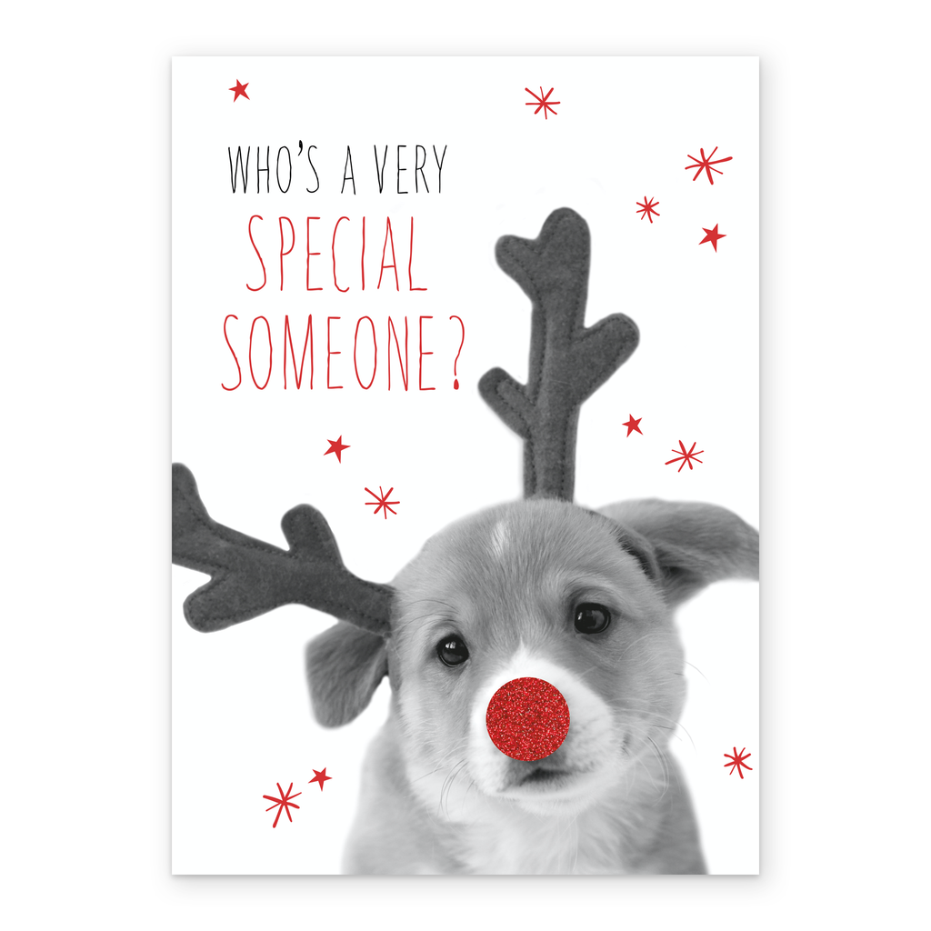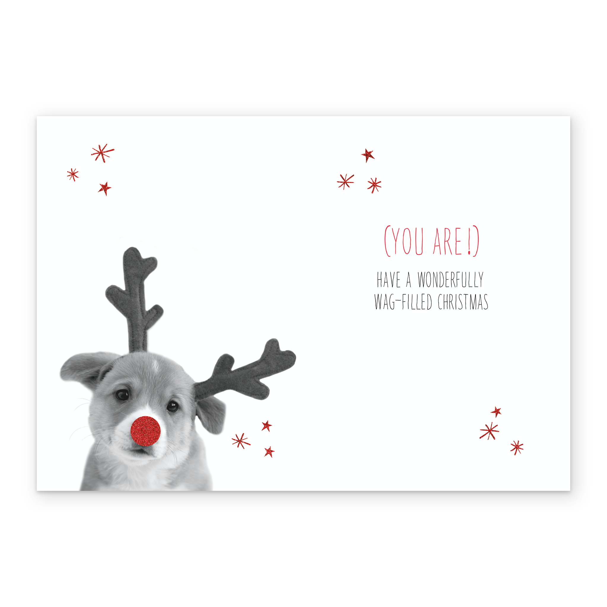 Printed on premium-quality board, this card features an adorable puppy with a red nose and reindeer antlers, and comes complete with a co-ordinating white envelope.