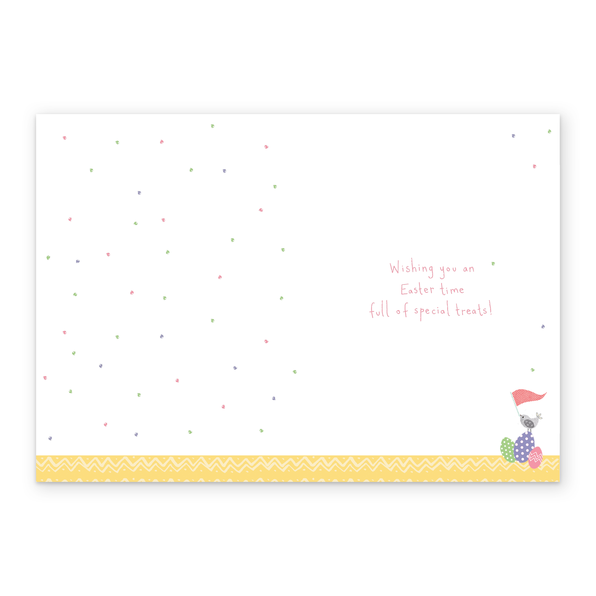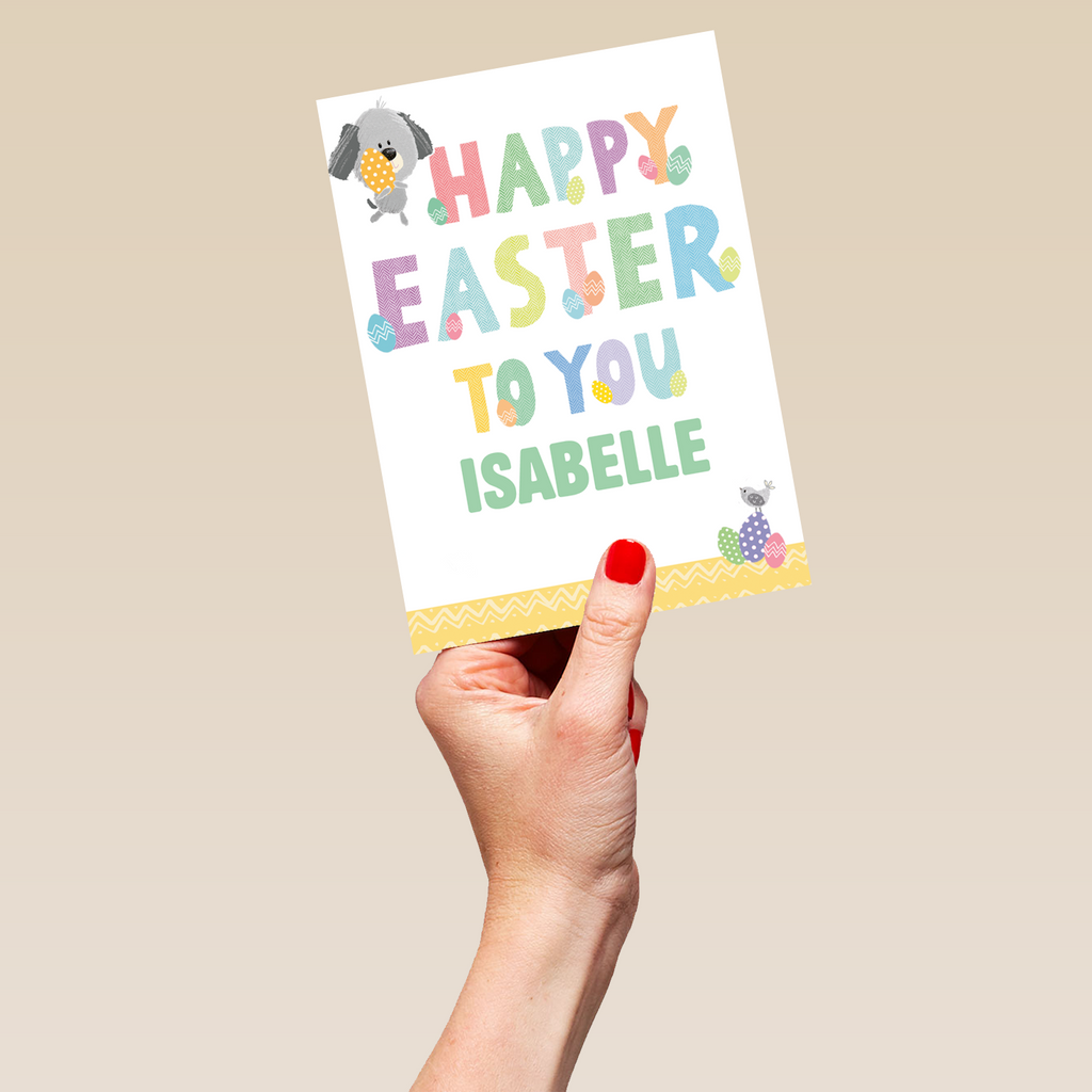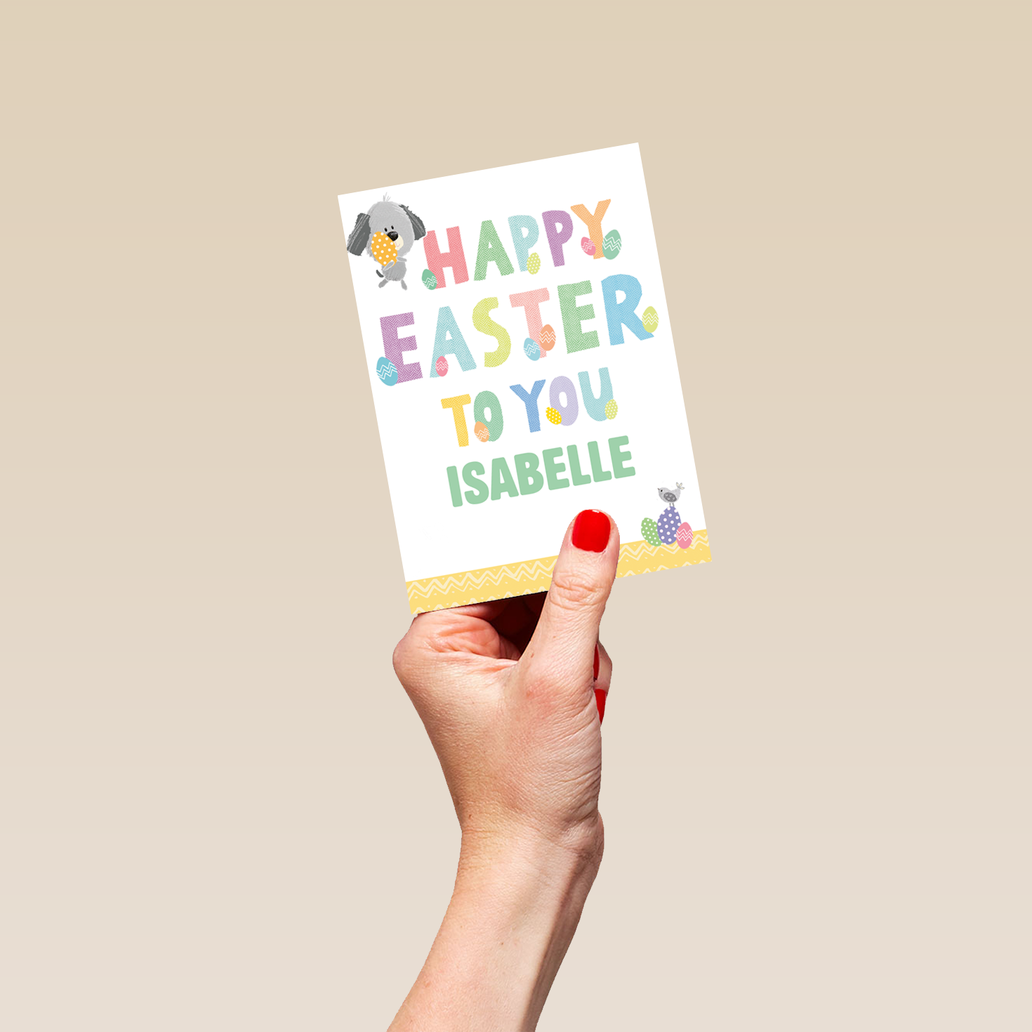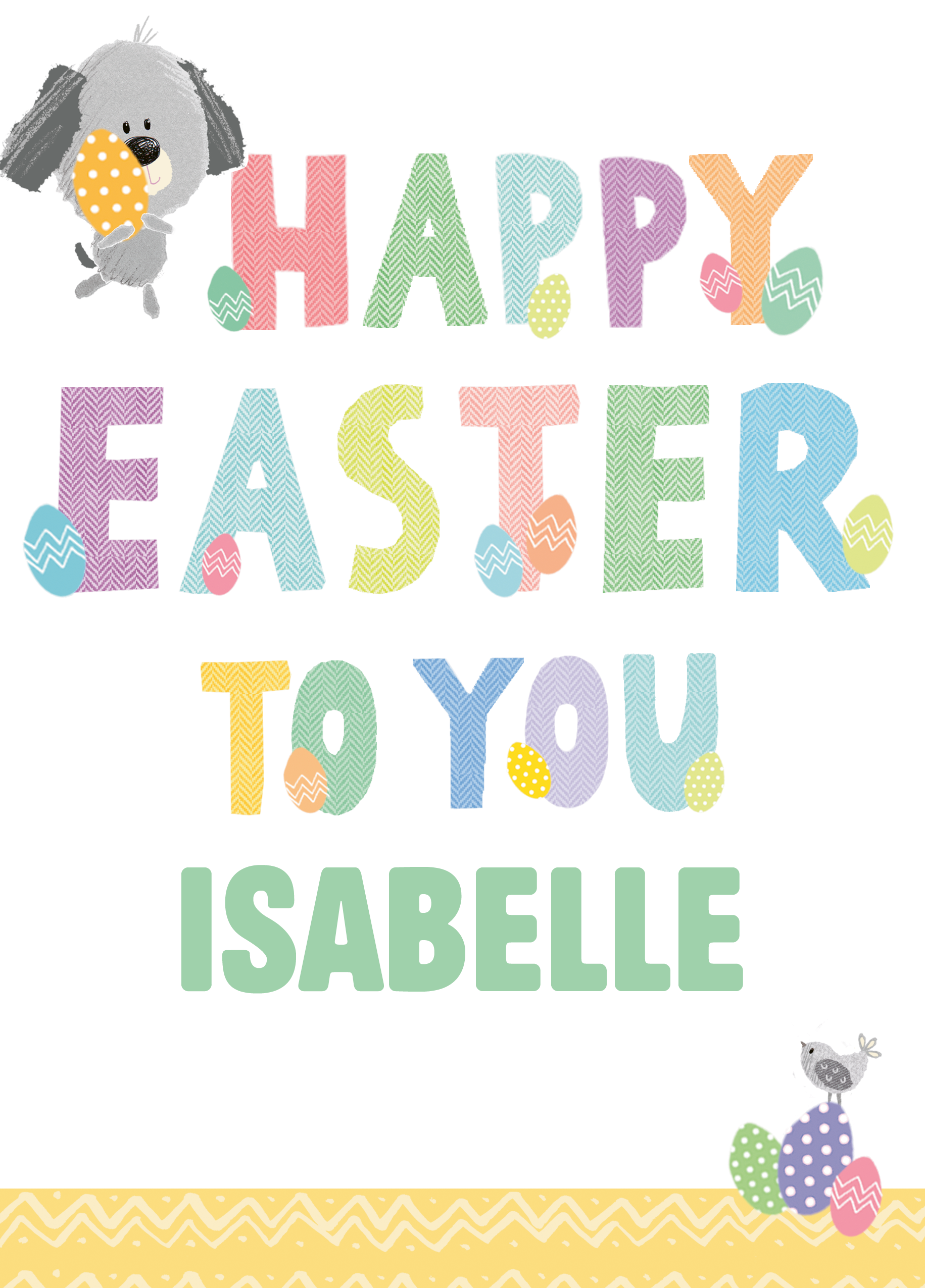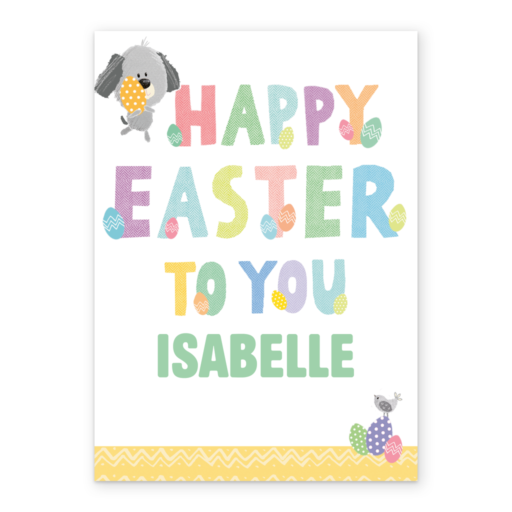 Printed on premium-quality board, this card features cute "Scruffles" the dog and colourful patterned text, adorned with bright Easter eggs, with the message 'Happy Easter to you', space to personalise a name, and comes complete with a co-ordinating white envelope.
