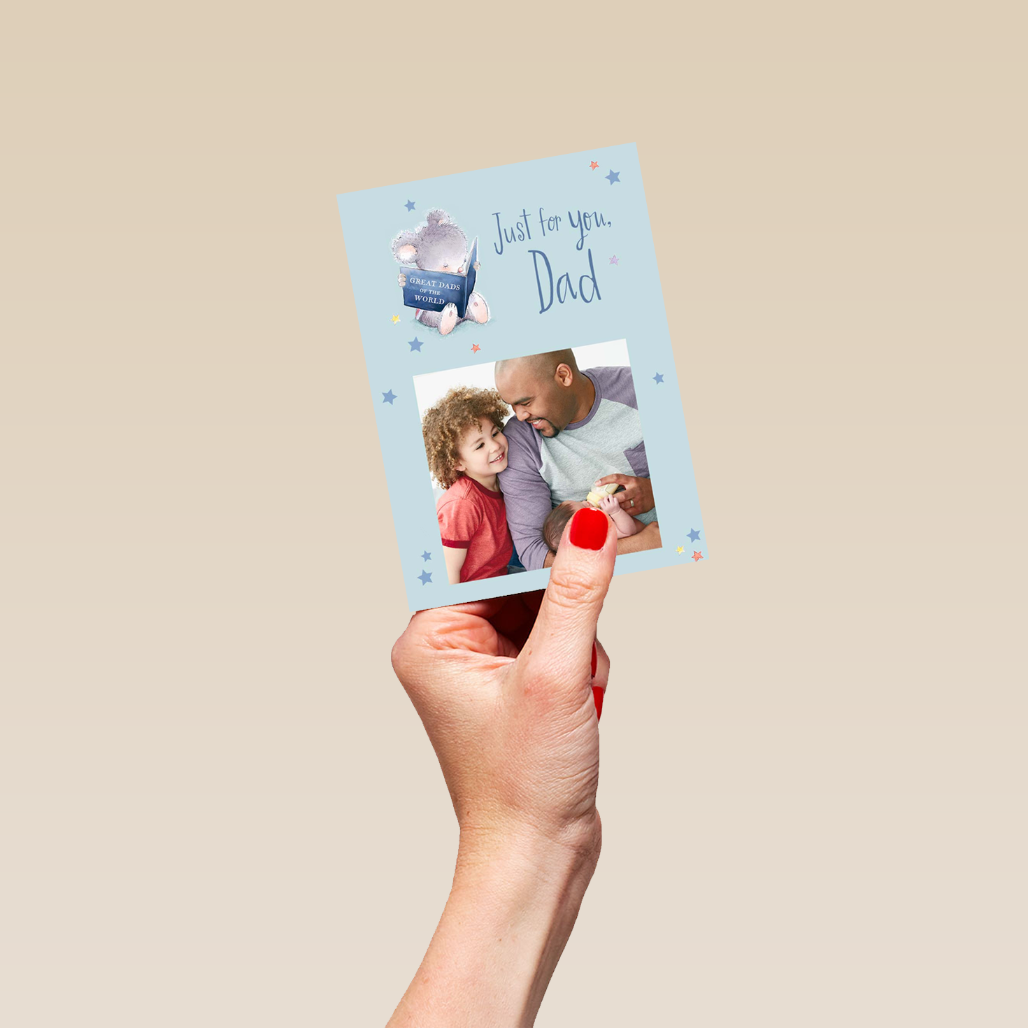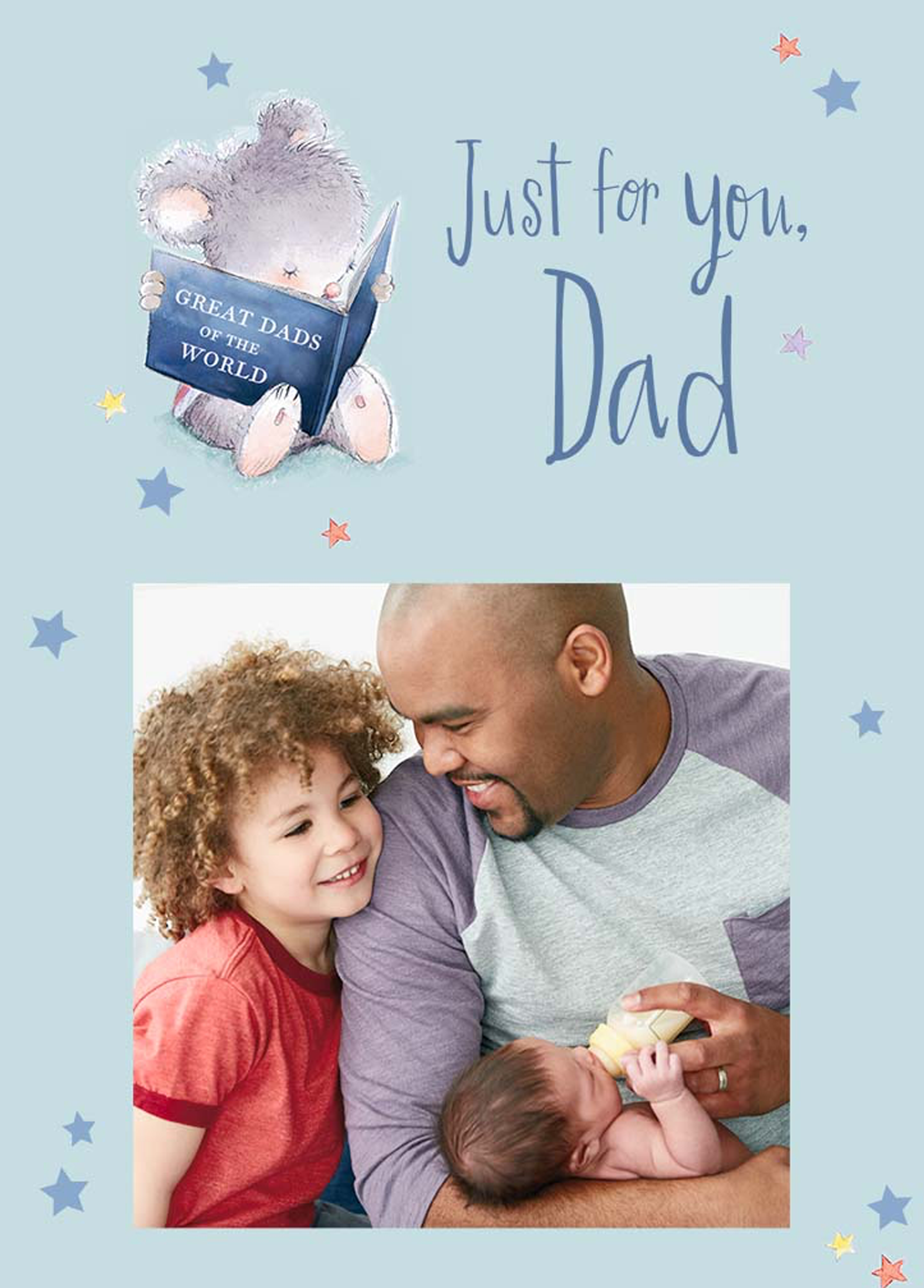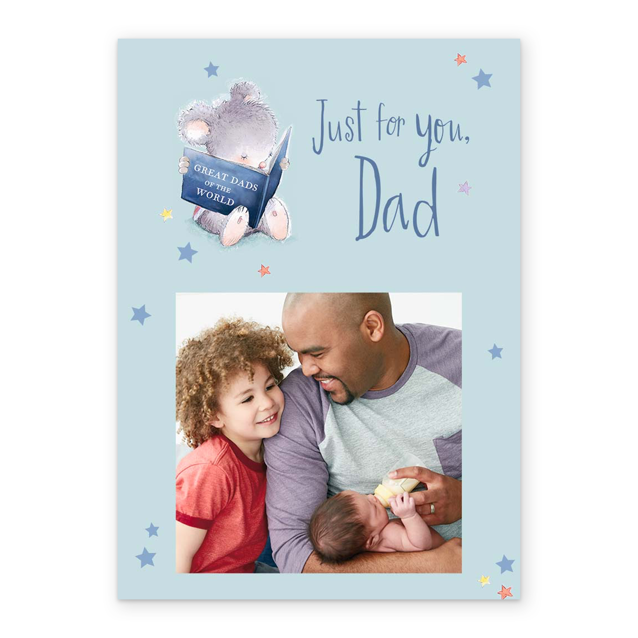 Show them you care with a personalised dad cute photo card from Hallmark. Our cards for Dad are printed on premium quality, FSC®-certified card & delivered nationwide. This card is available as standard 12cm by 16.7cm and large 15.5cm by 21.6cm.