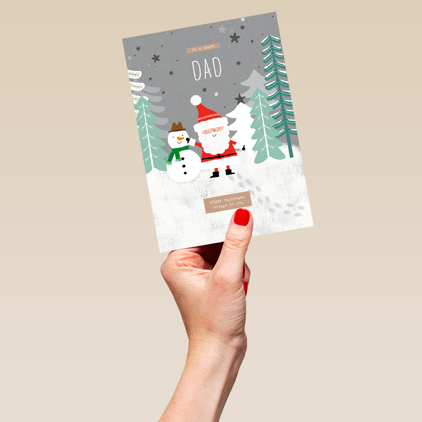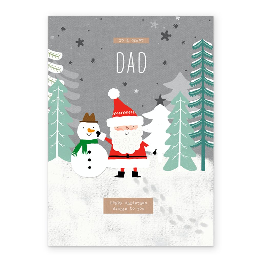 Show them you care with a personalised dad cute Santa Claus snowman Christmas card from Hallmark. Our greetings cards are printed on premium quality, FSC®-certified card & delivered nationwide. This card is available as standard 12cm by 16.7cm and large 15.5cm by 21.6cm.