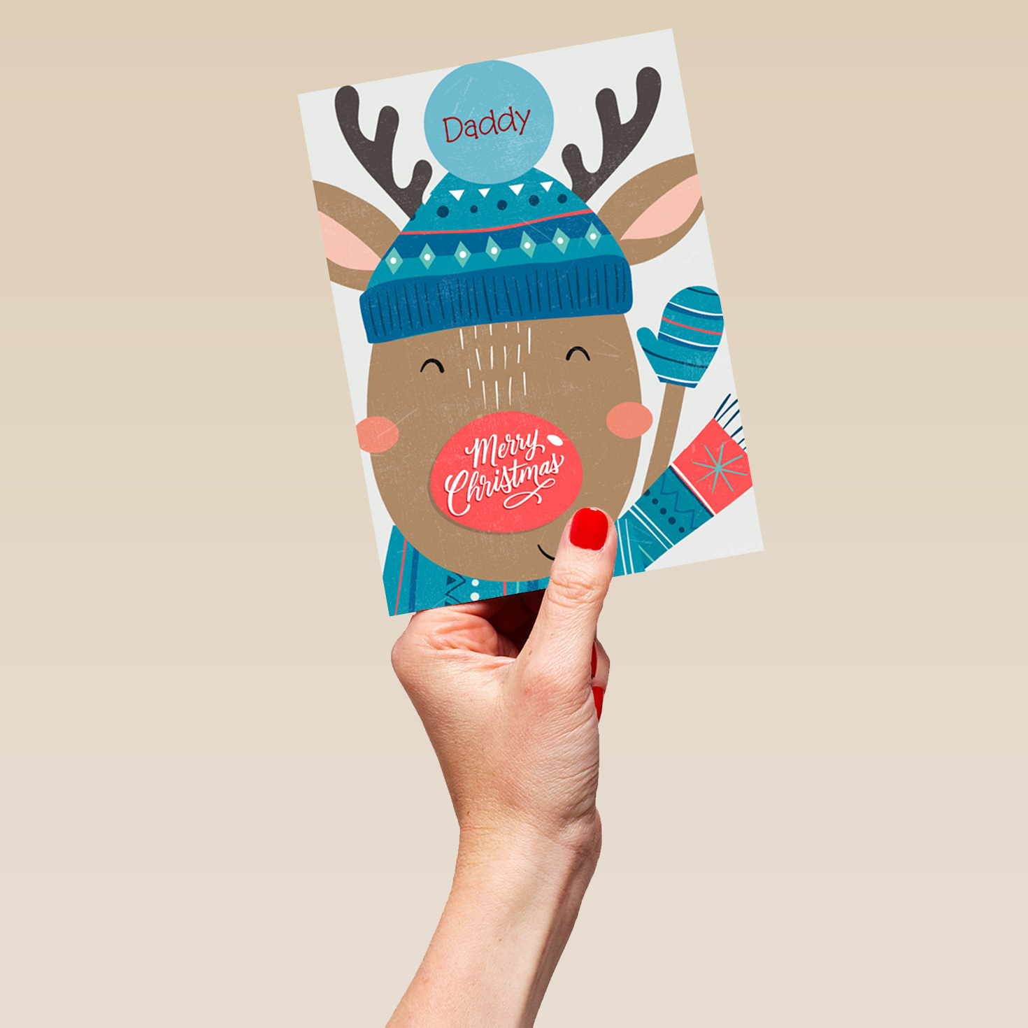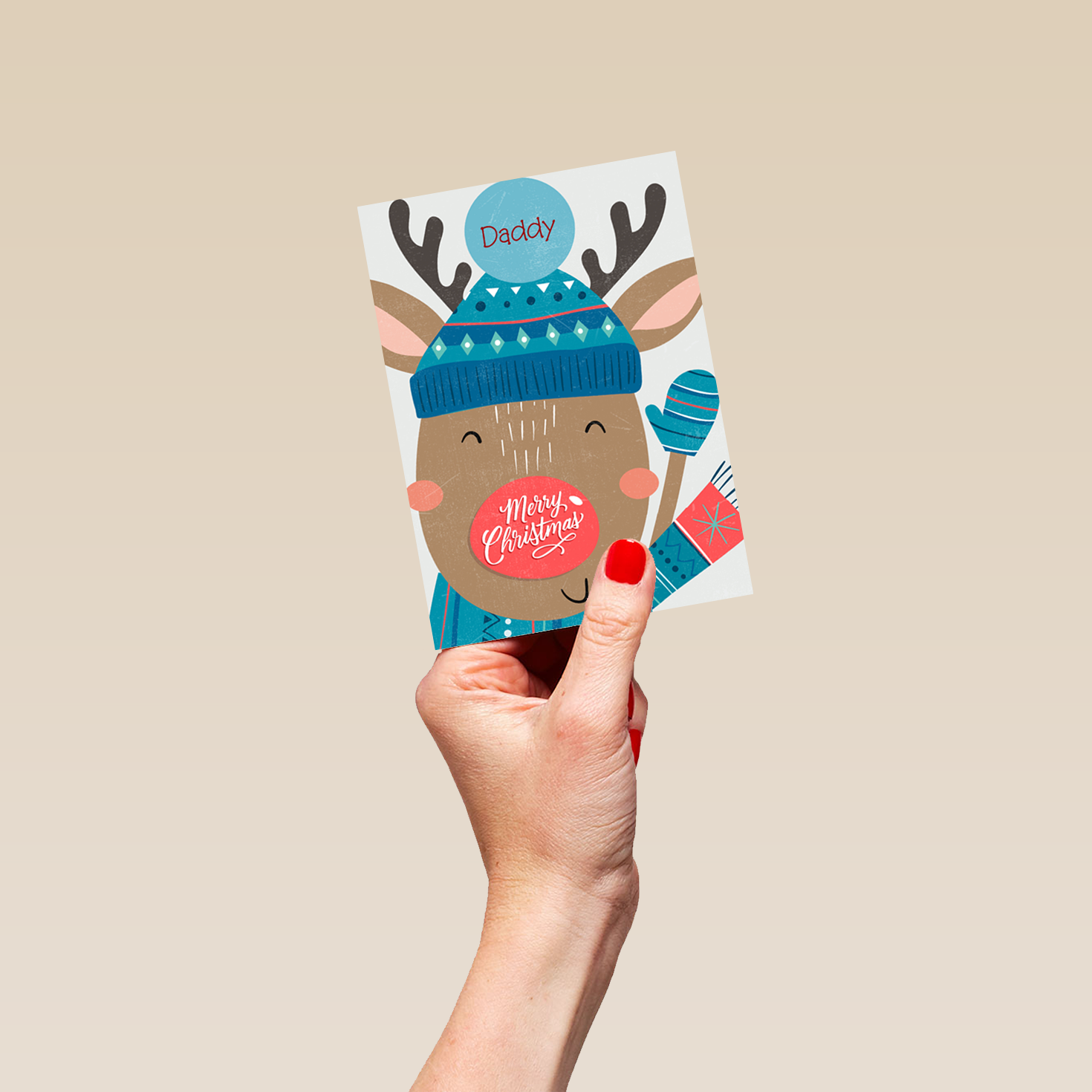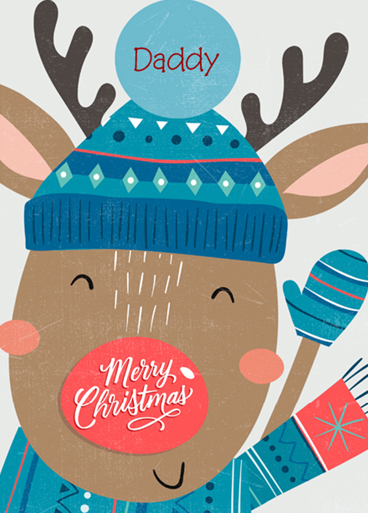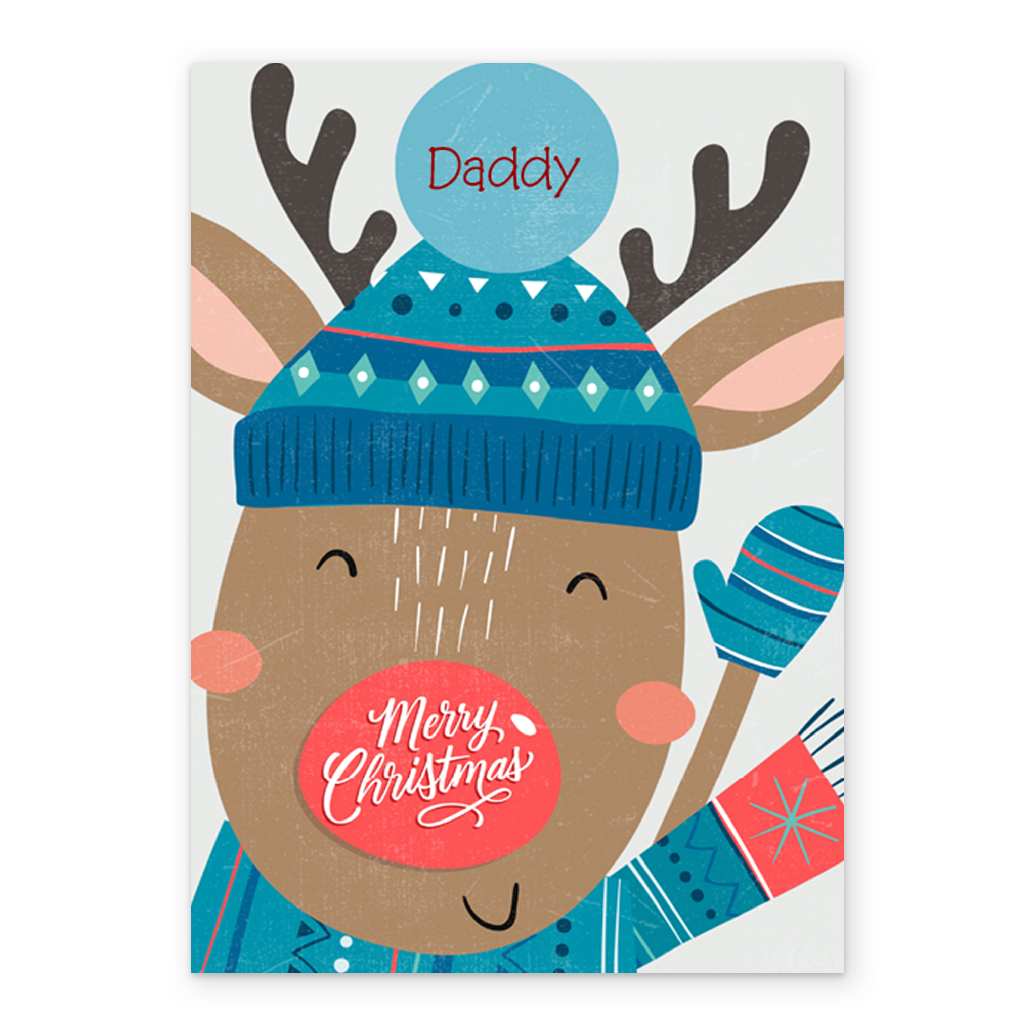 Show them you care with a personalised daddy cute reindeer winter woolies card from Hallmark. Our Christmas cards are printed on premium quality, FSC®-certified card & delivered nationwide. This card is available as standard 12cm by 16.7cm and large 15.5cm by 21.6cm.