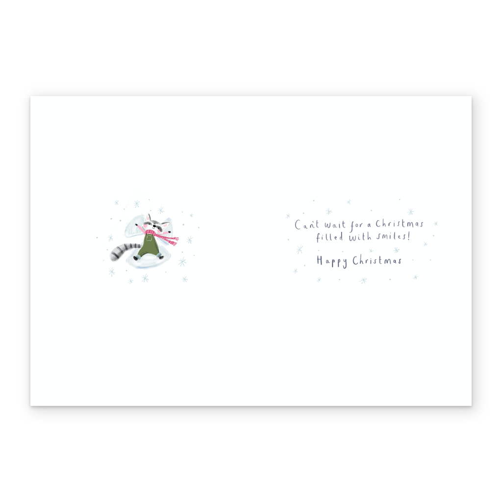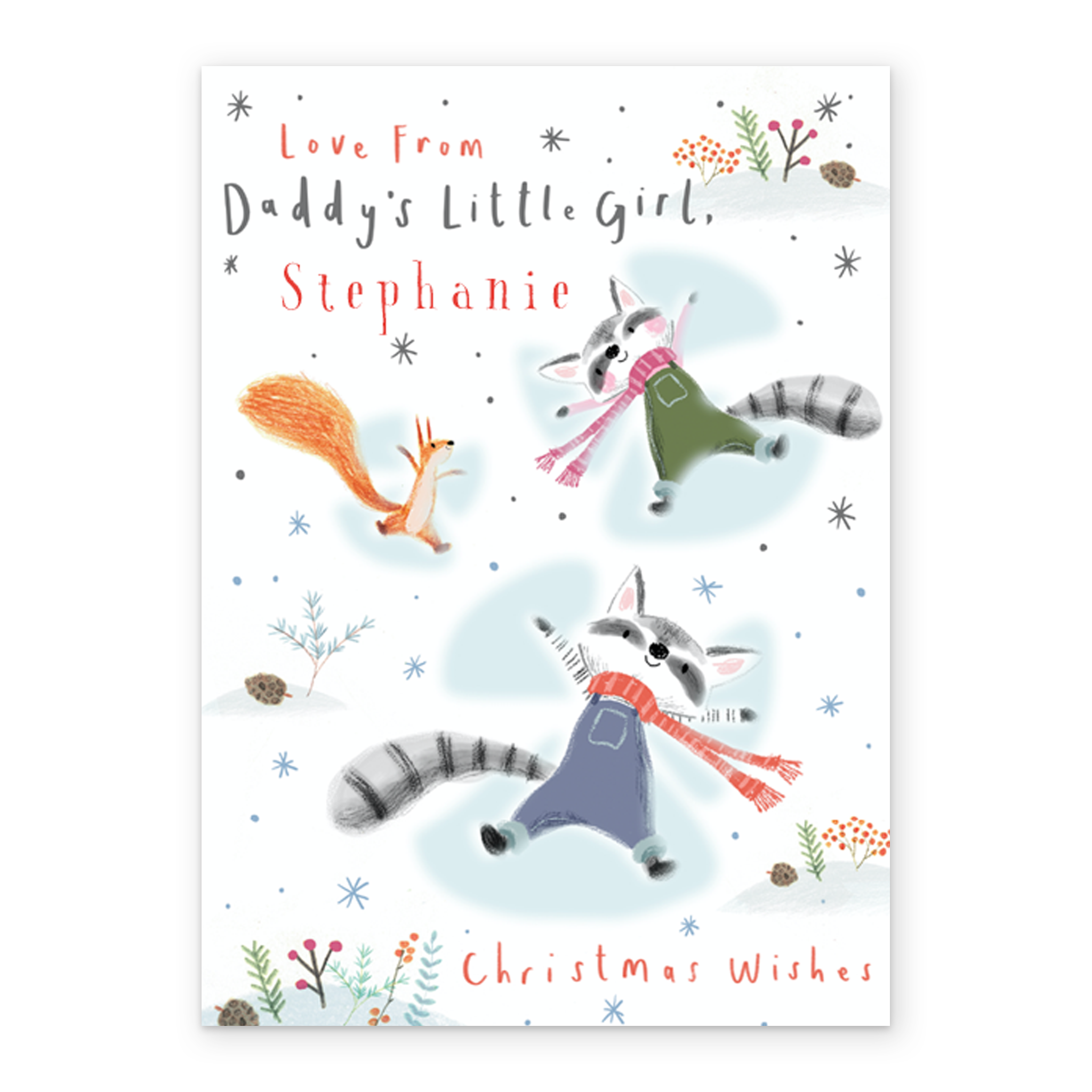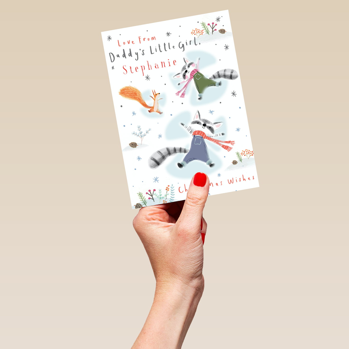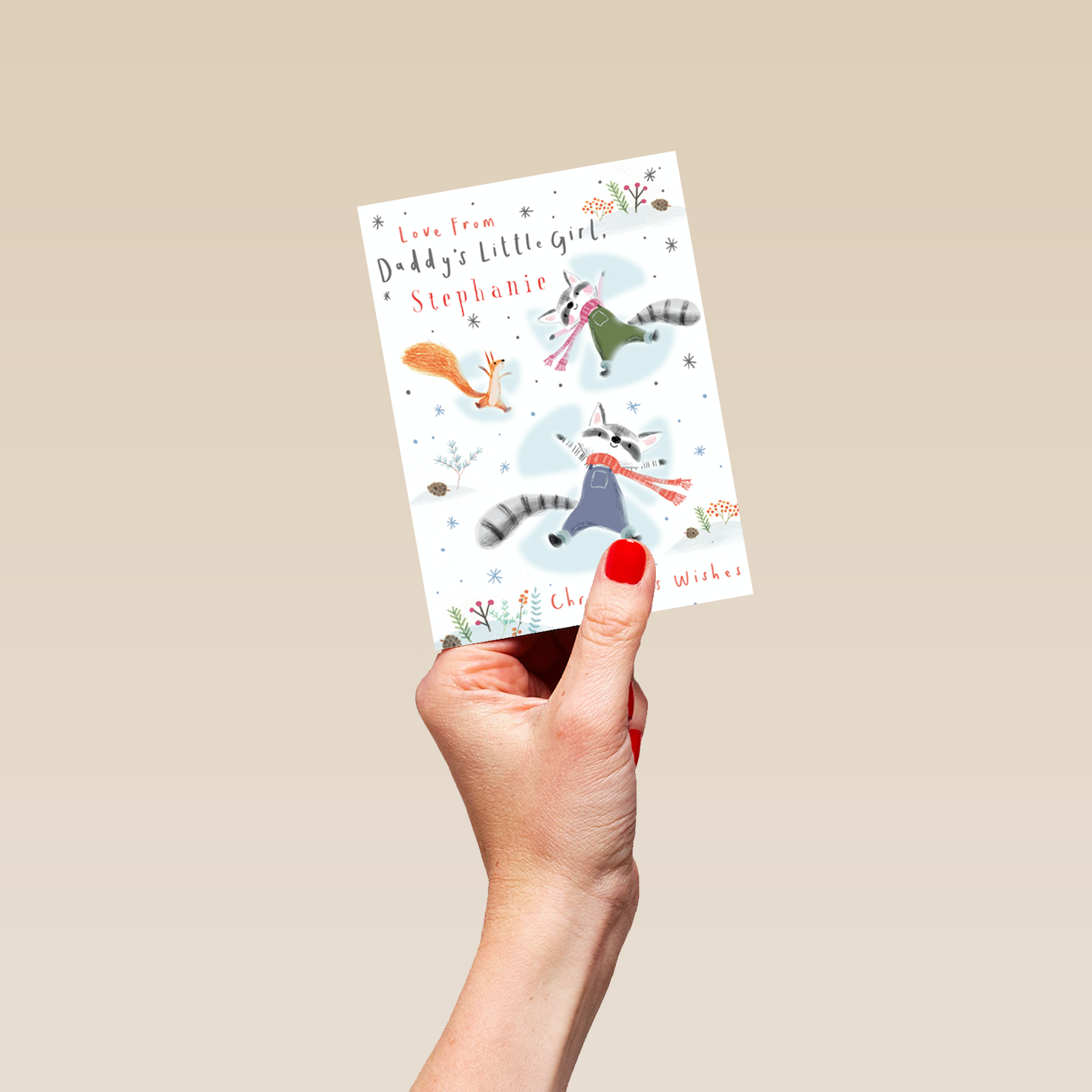 Personalised Daddy From Little Girl Snow Angel Raccoons Christmas Card