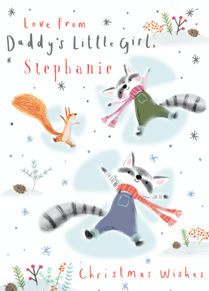Show them you care with a personalised daddy from little girl snow angel raccoons Christmas card from Hallmark. Our greetings cards are printed on premium quality, FSC®-certified card & delivered nationwide. This card is available as standard 12cm by 16.7cm and large 15.5cm by 21.6cm.