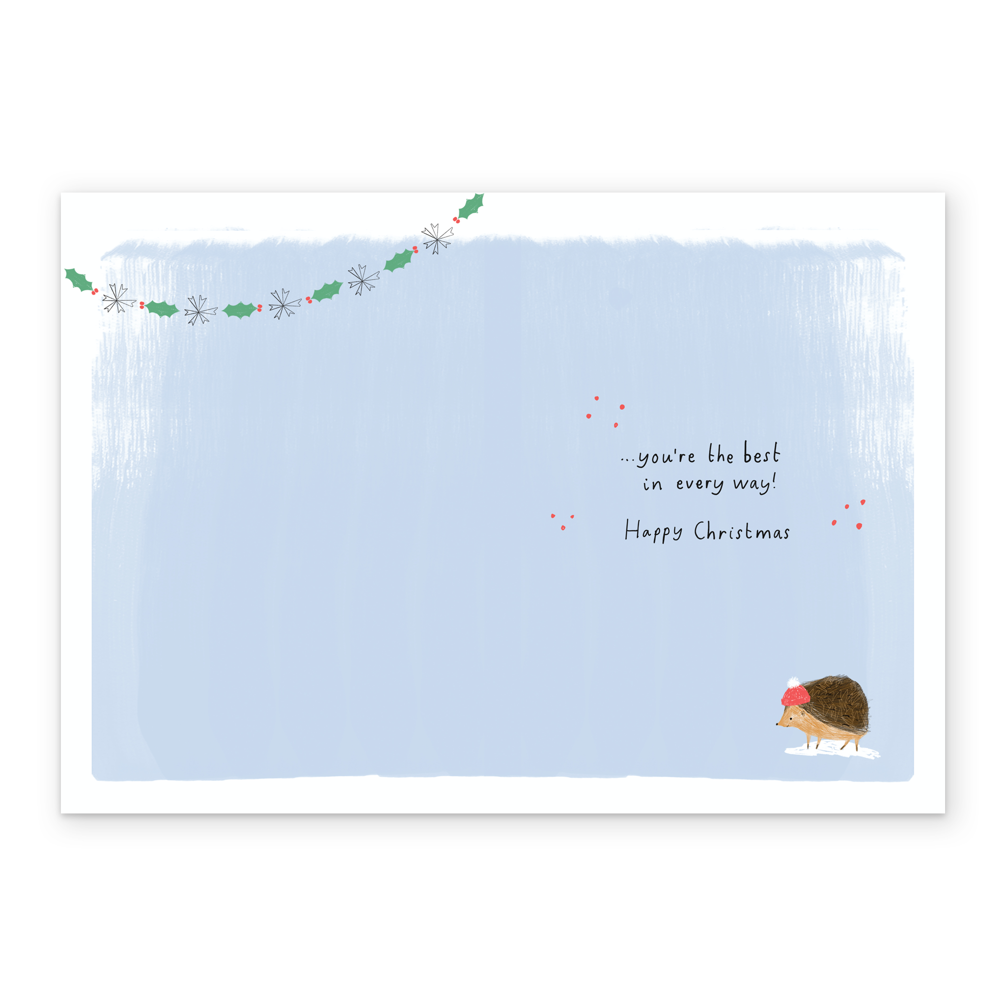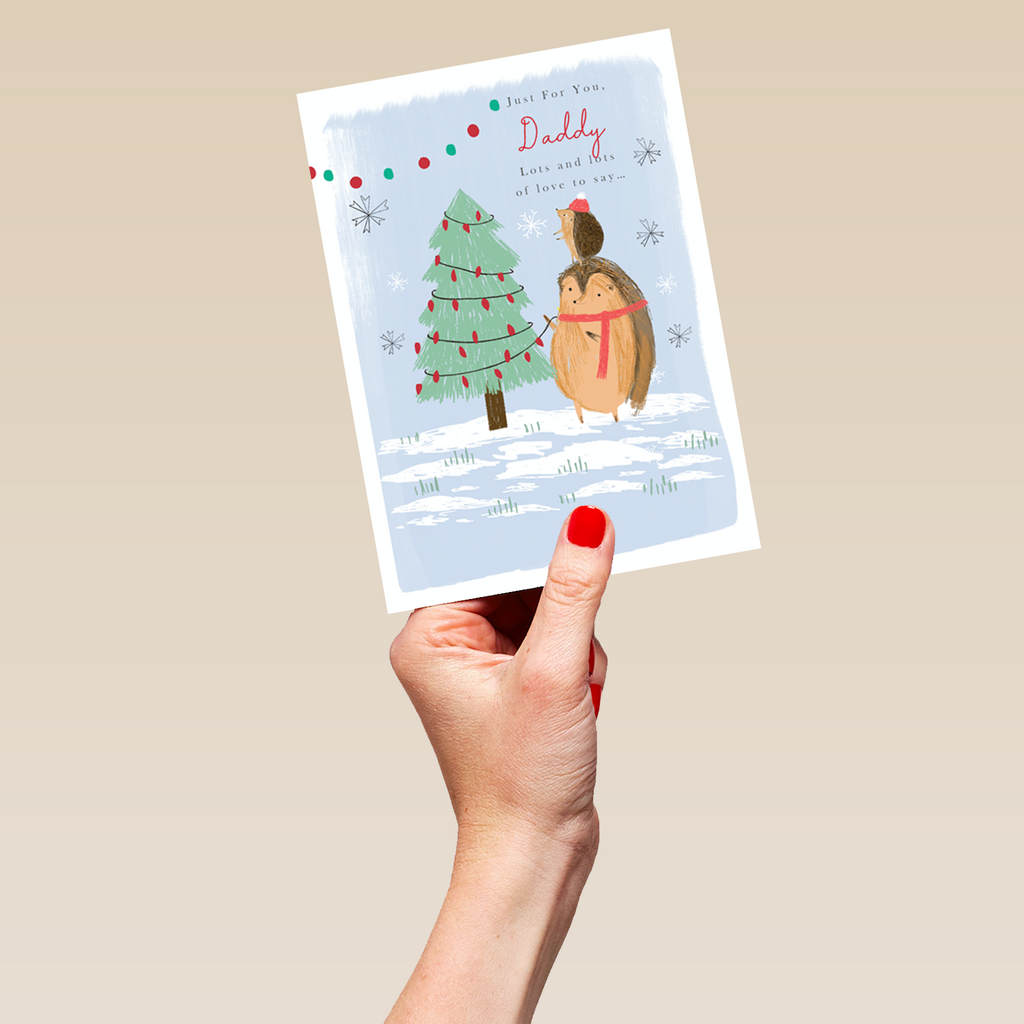 Show them you care with a personalised daddy hedgehogs decorating the tree cute Christmas card from Hallmark. Our greetings cards are printed on premium quality, FSC®-certified card & delivered nationwide. This card is available as standard 12cm by 16.7cm and large 15.5cm by 21.6cm.