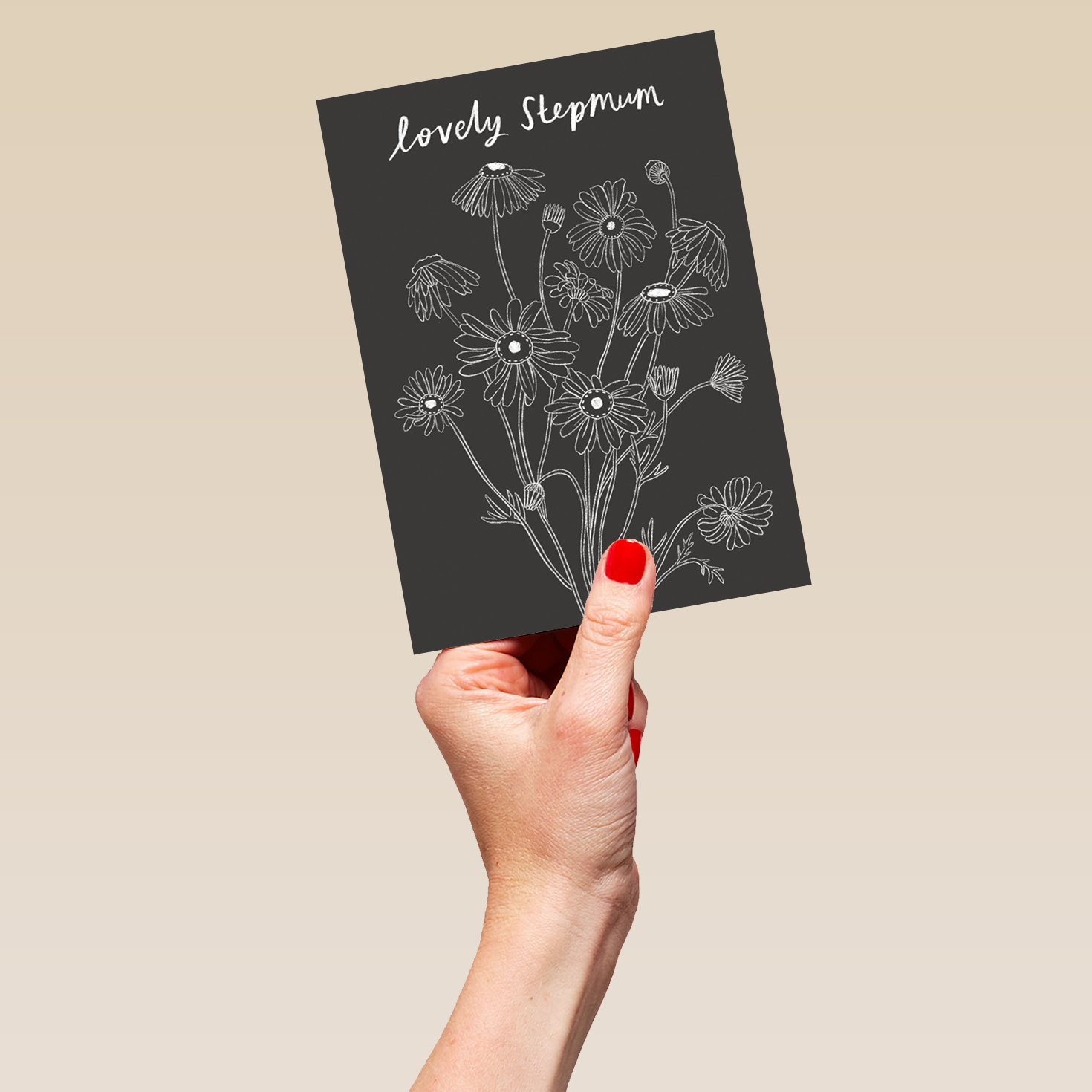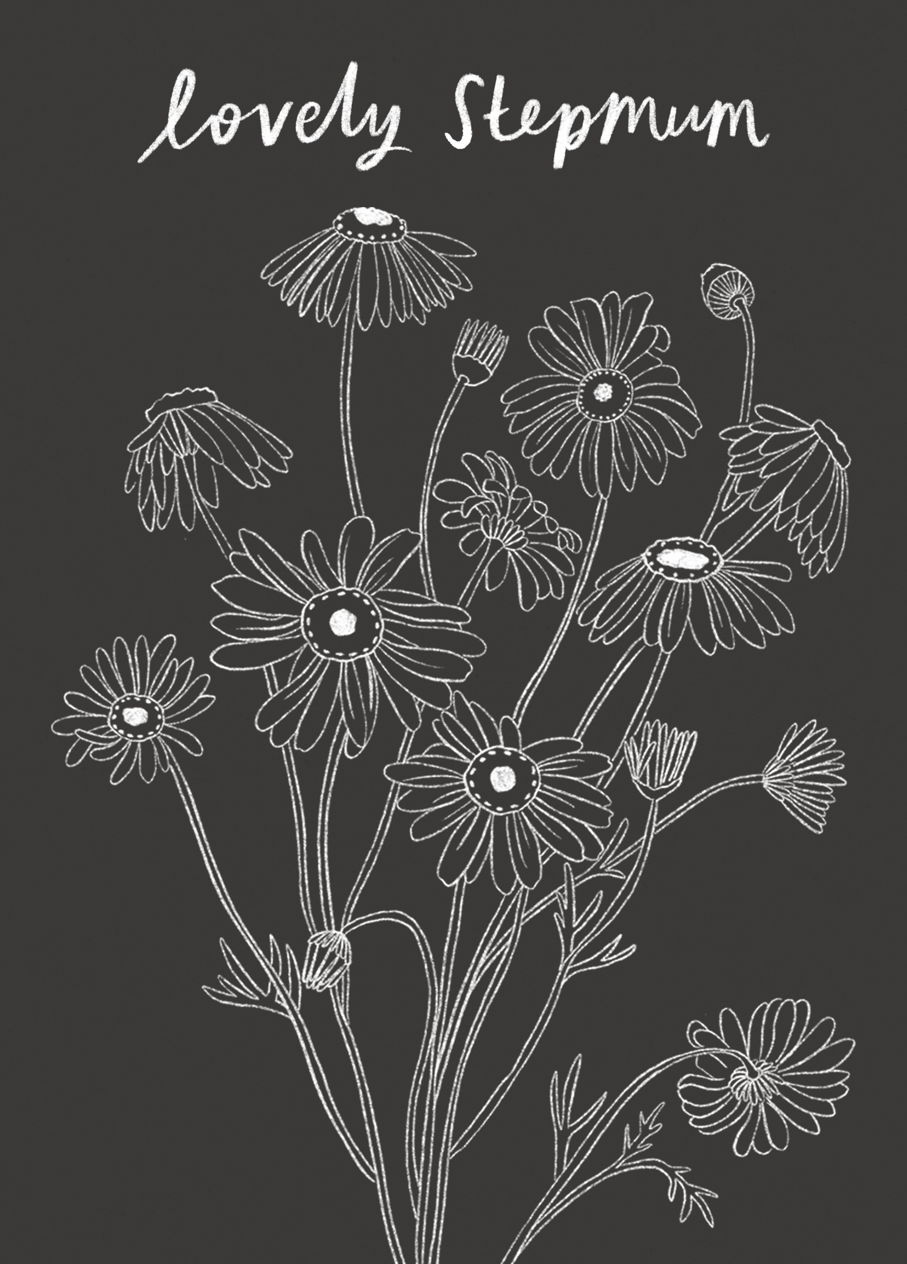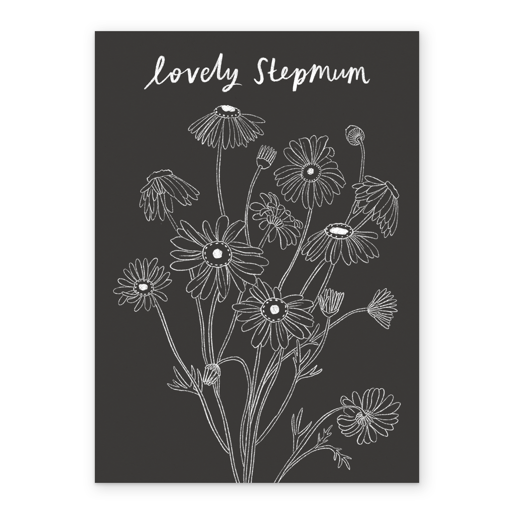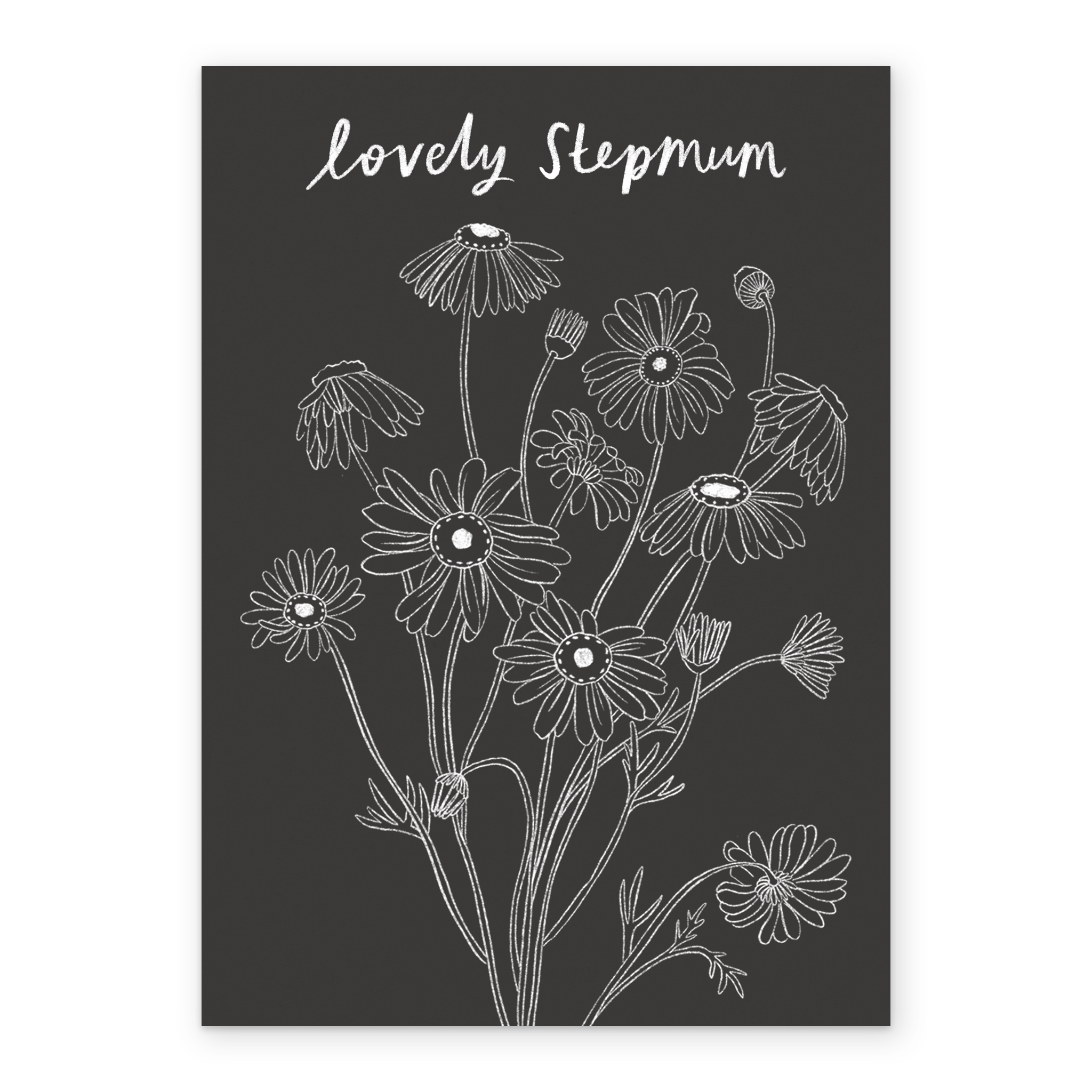 Printed on premium-quality board, this card features white outlines of flowers on a dark grey background, with the message 'Lovely Stepmum', and comes complete with a co-ordinating white envelope.
