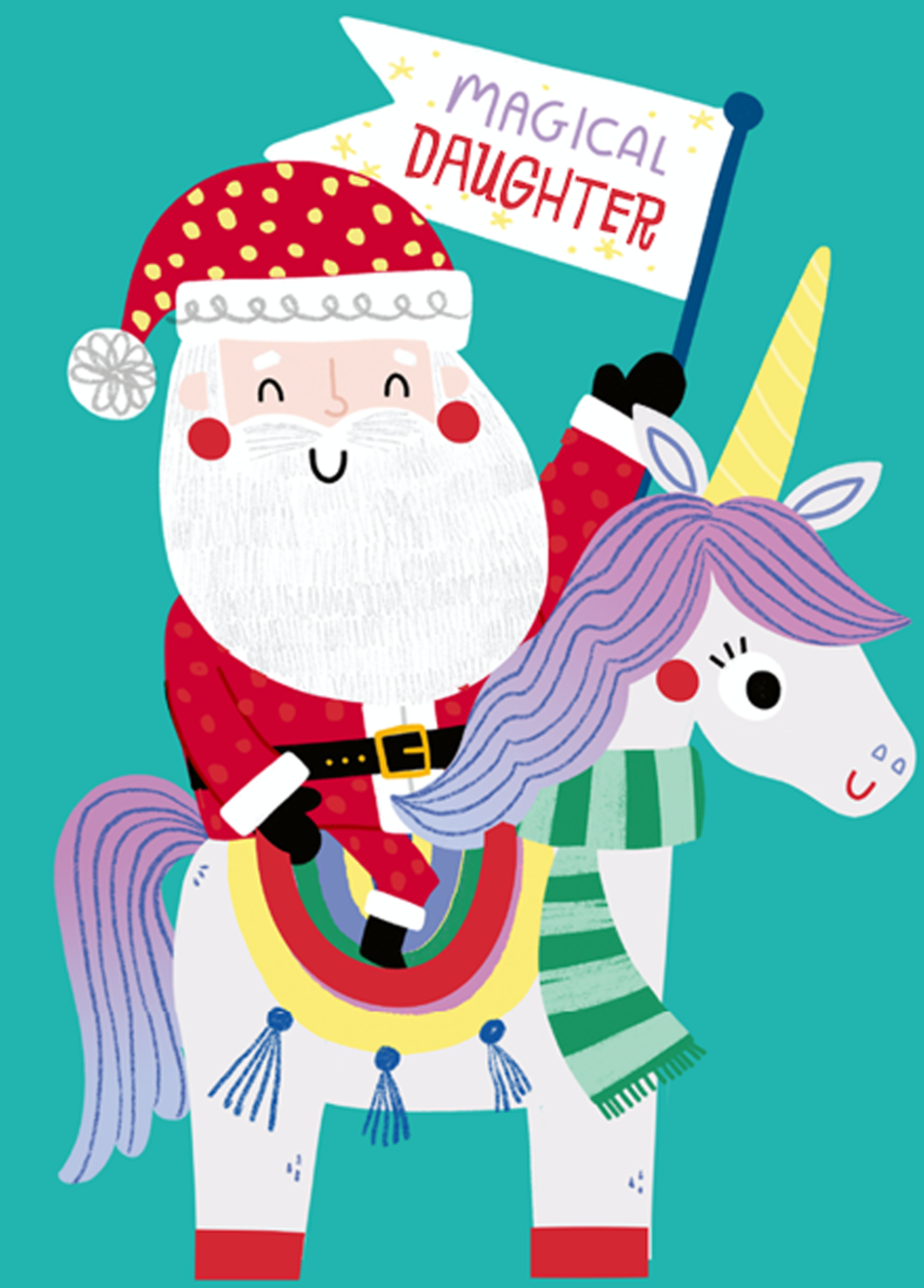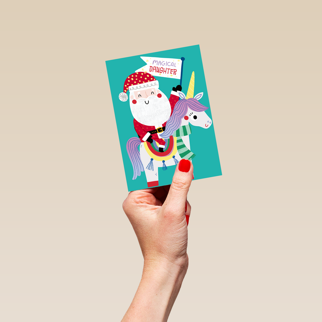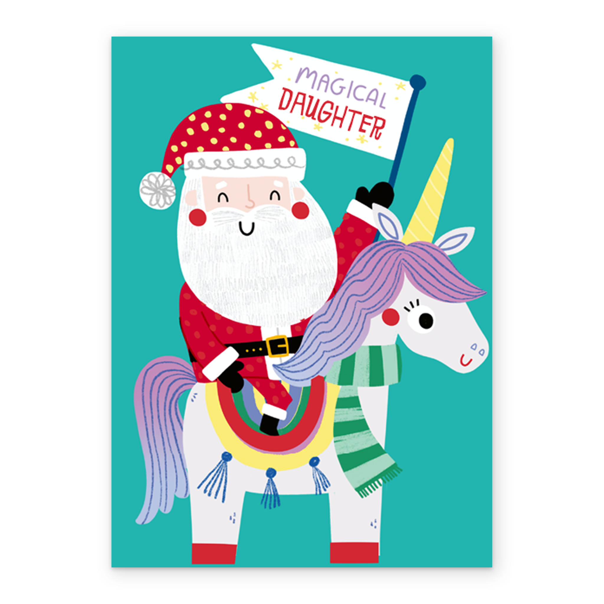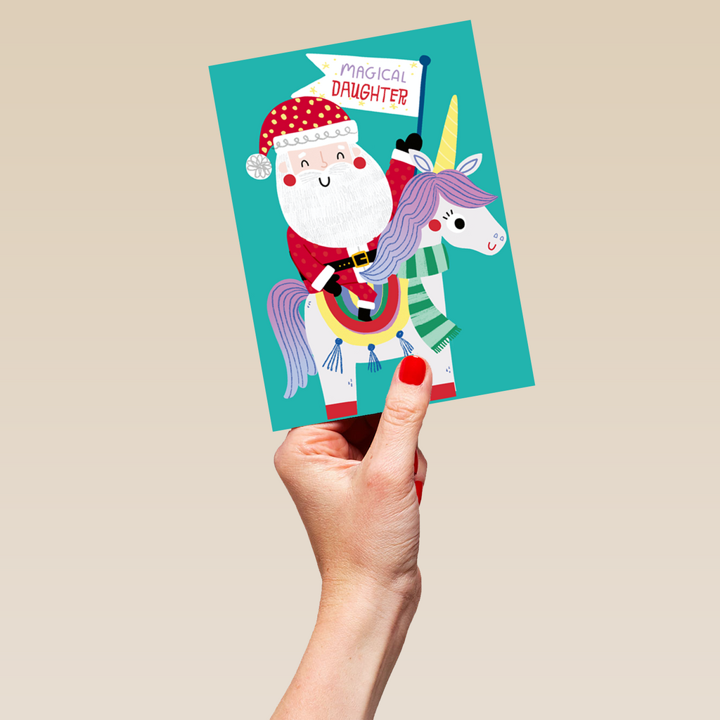 Show them you care with a personalised daughter Santa and unicorn Christmas card from Hallmark. Our greetings cards are printed on premium quality, FSC®-certified card & delivered nationwide. This card is available as standard 12cm by 16.7cm and large 15.5cm by 21.6cm.