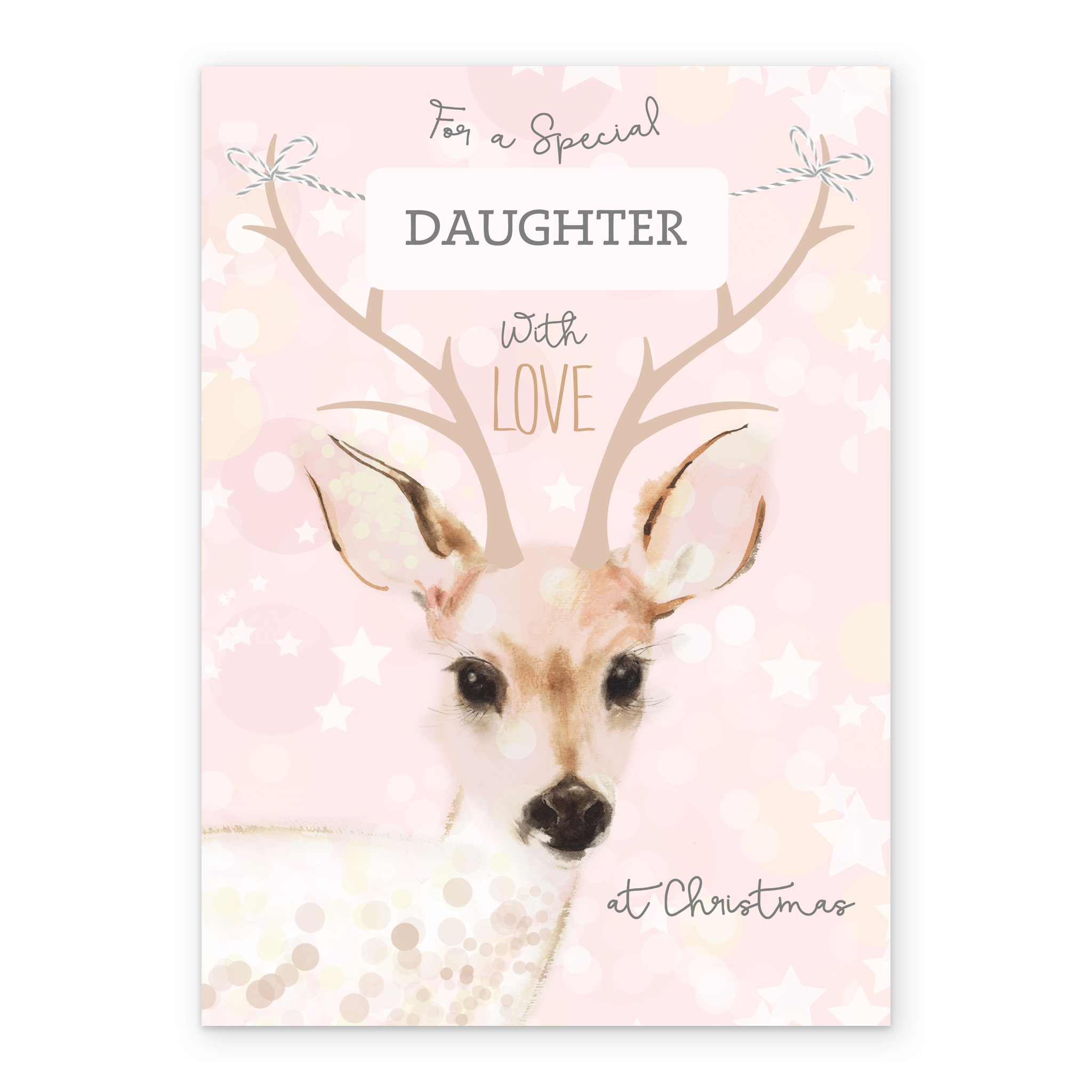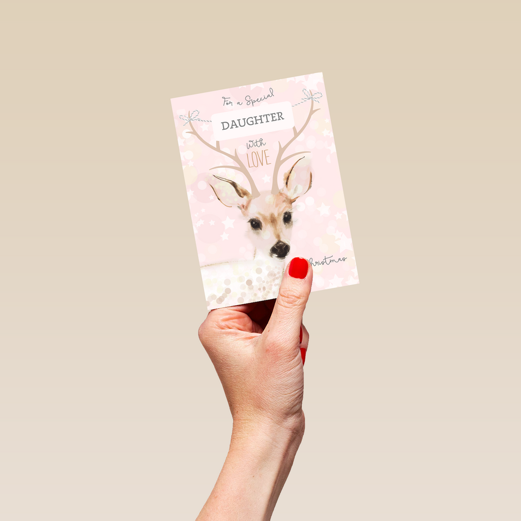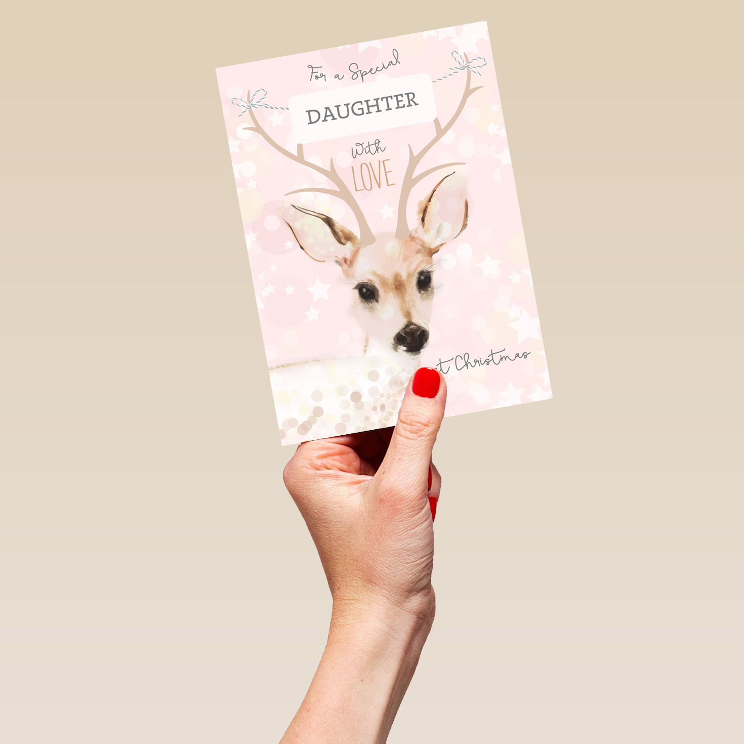 Show them you care with a personalised daughter winter reindeer card from Hallmark. Our Christmas cards are printed on premium quality, FSC®-certified card & delivered nationwide. This card is available as standard 12cm by 16.7cm and large 15.5cm by 21.6cm.