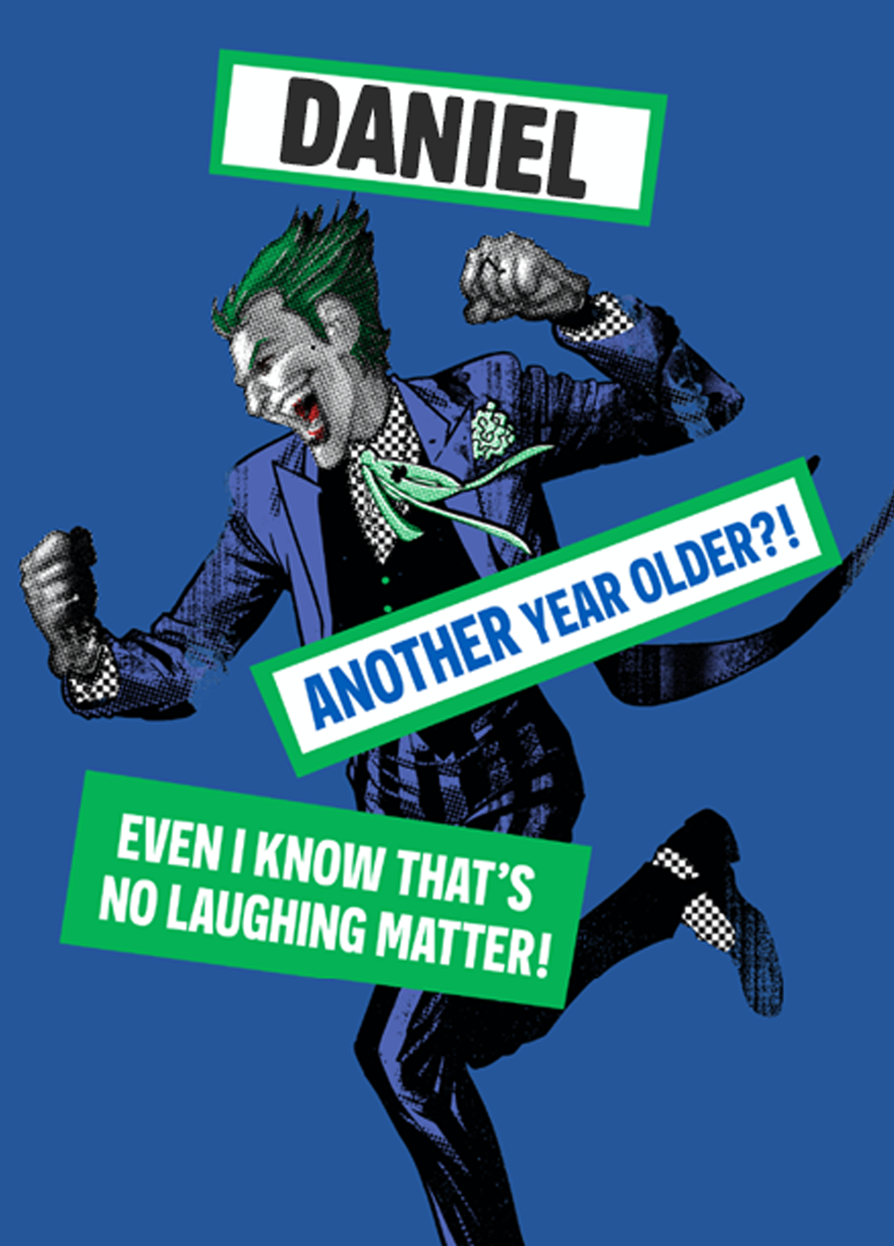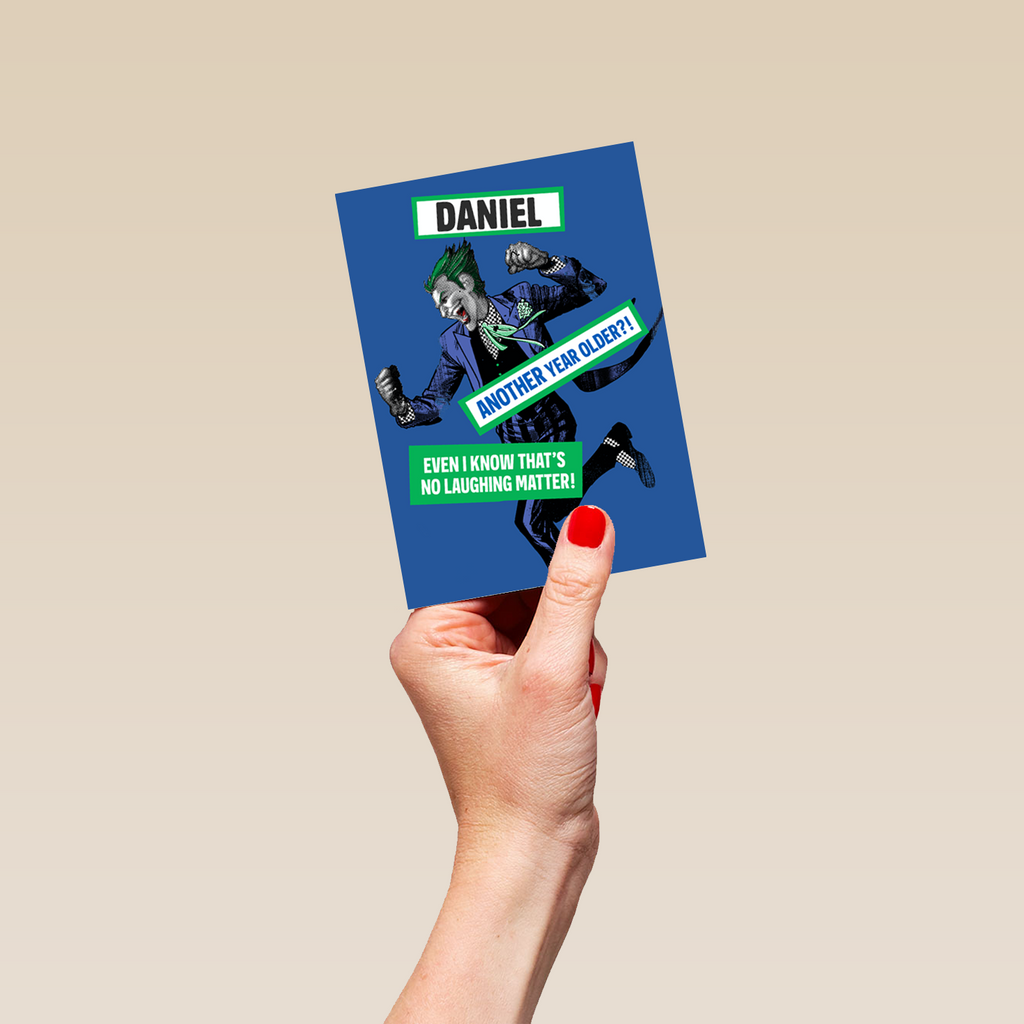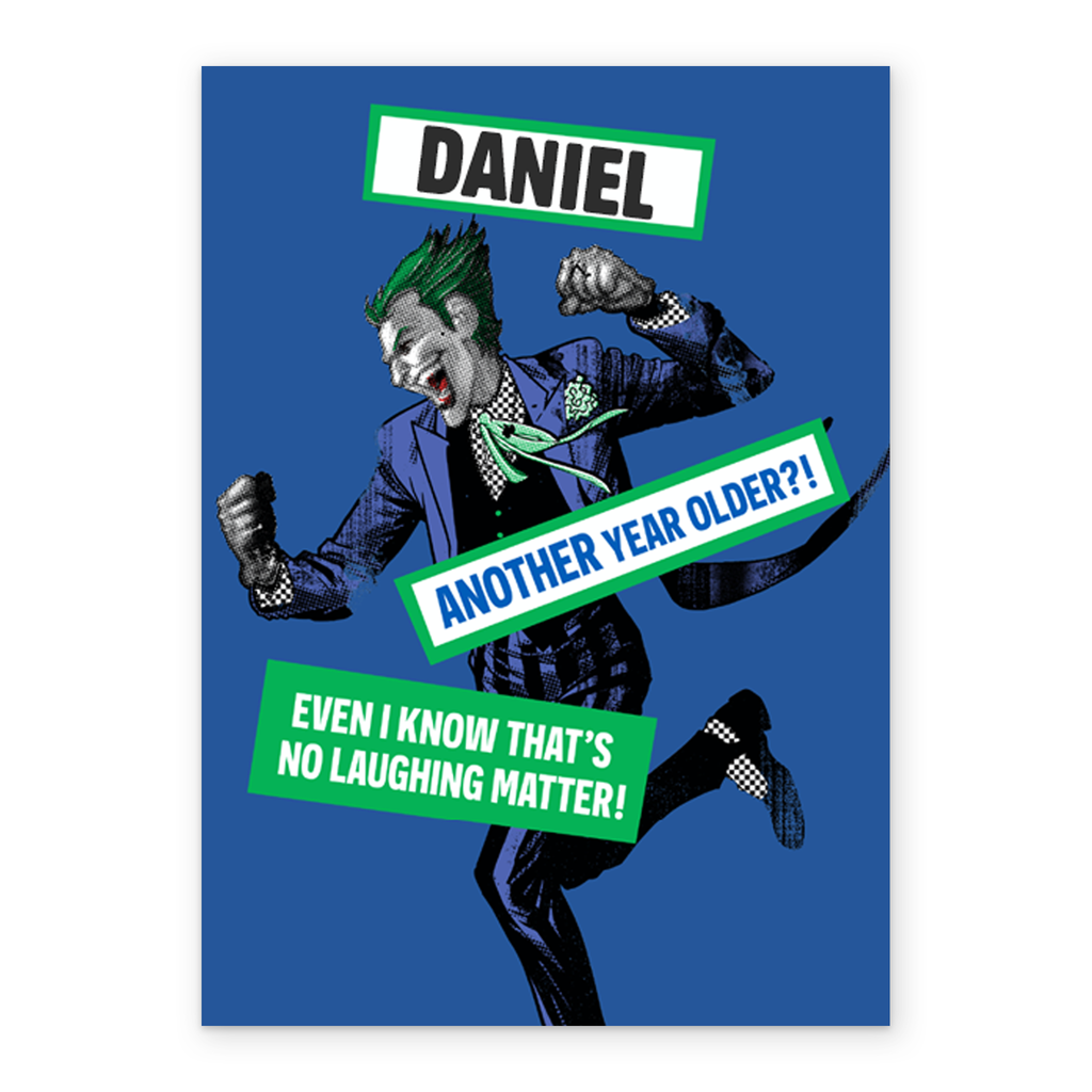 Show them you care with a personalised DC Joker birthday card from Hallmark. Our birthday cards are printed on premium quality, FSC®-certified card & delivered nationwide. This card is available as standard 12cm by 16.7cm and large 15.5cm by 21.6cm.
