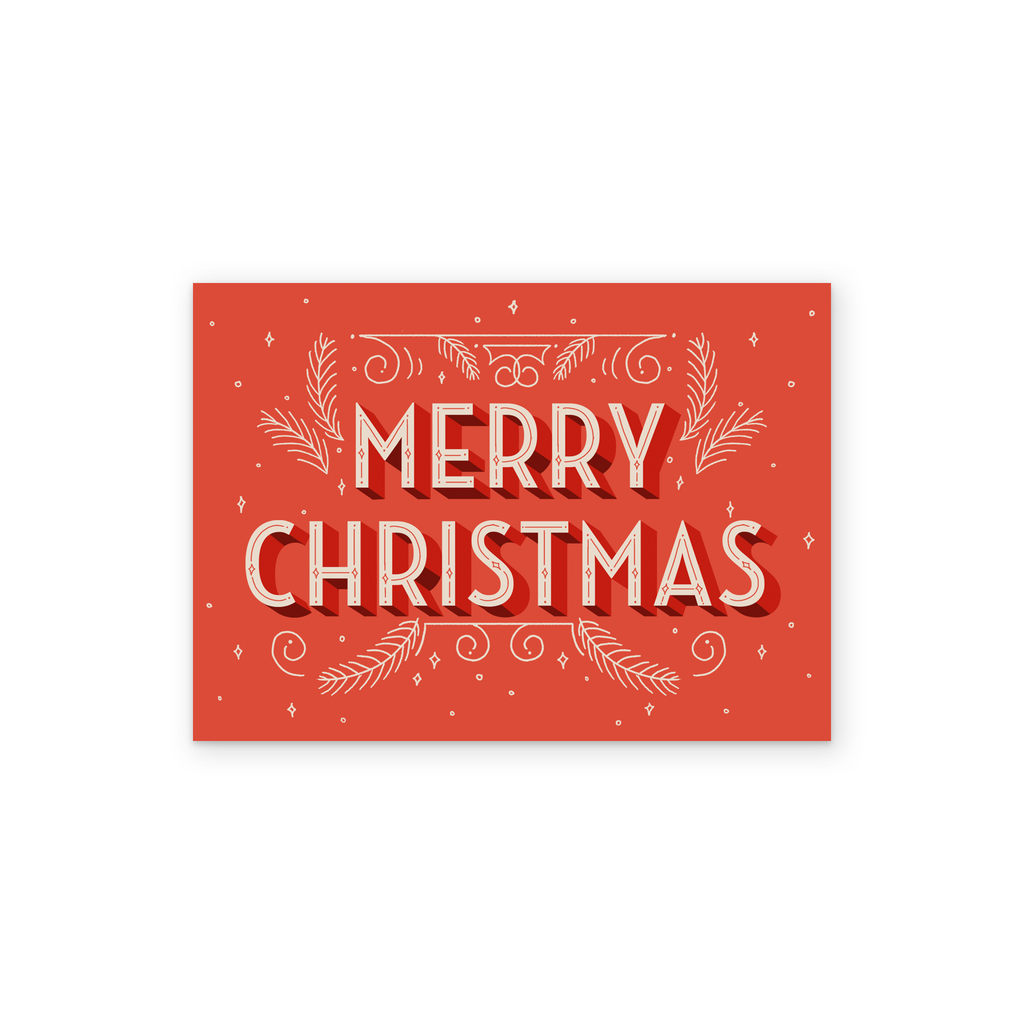 Printed on premium-quality board, this card features a stylish, art deco influenced design on a rich red background with white lettering, with the message 'Merry Christmas', and comes complete with a co-ordinating white envelope.
