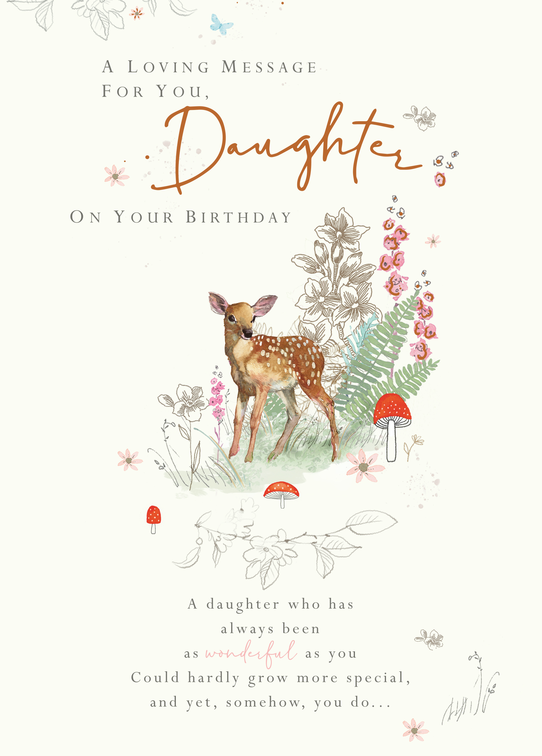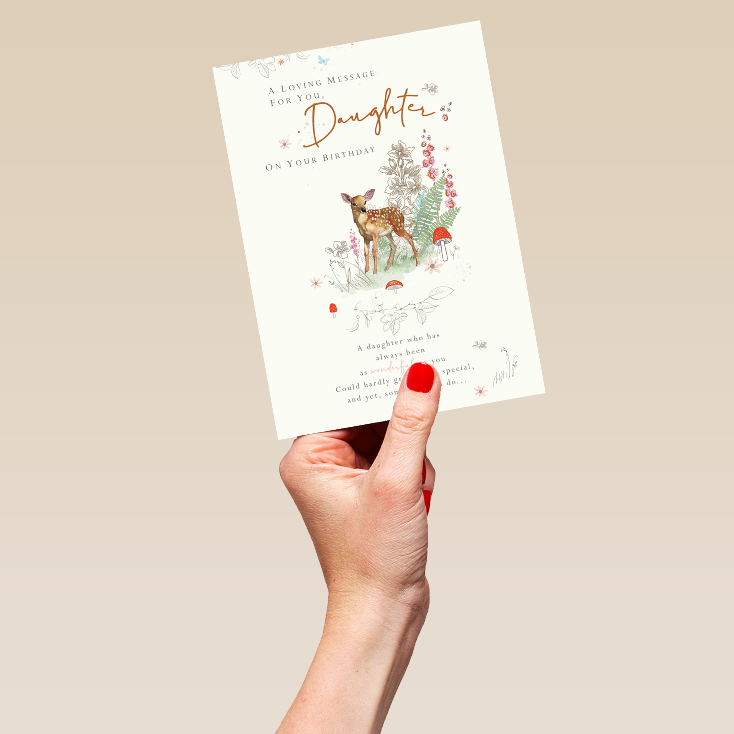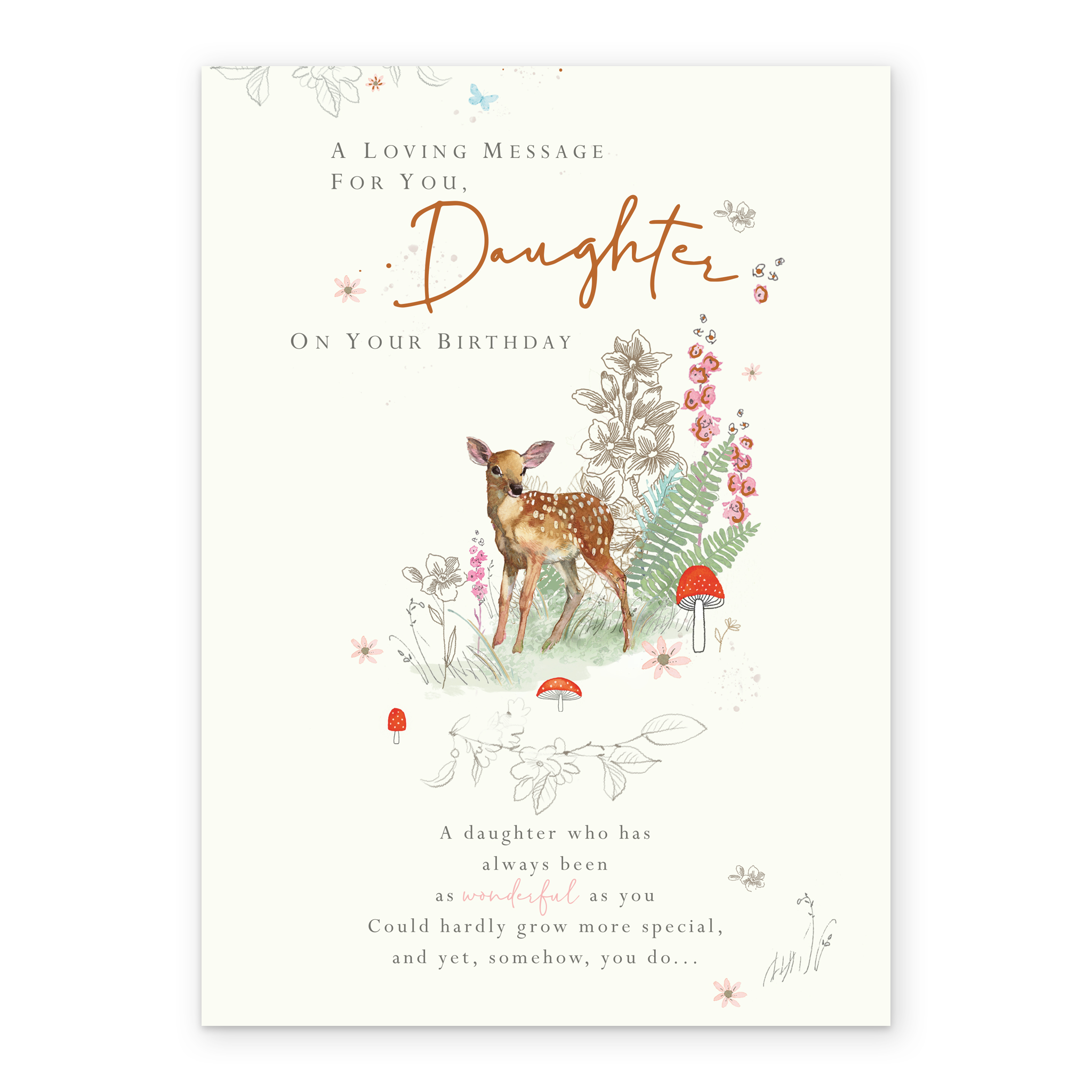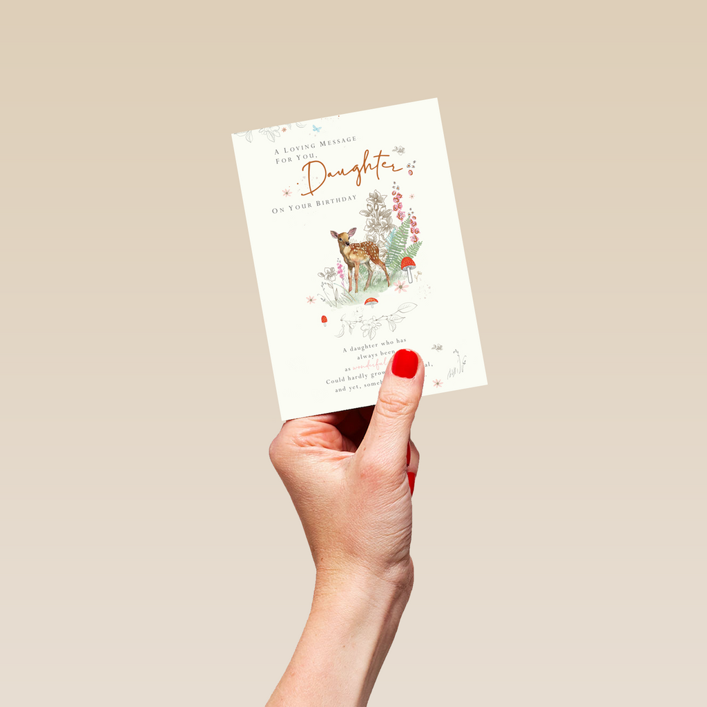 Show them you care with a personalised deer birthday card for daughter from Hallmark. Our birthday cards are printed on premium quality, FSC®-certified card & delivered nationwide. This card is available as standard 12cm by 16.7cm and large 15.5cm by 21.6cm.