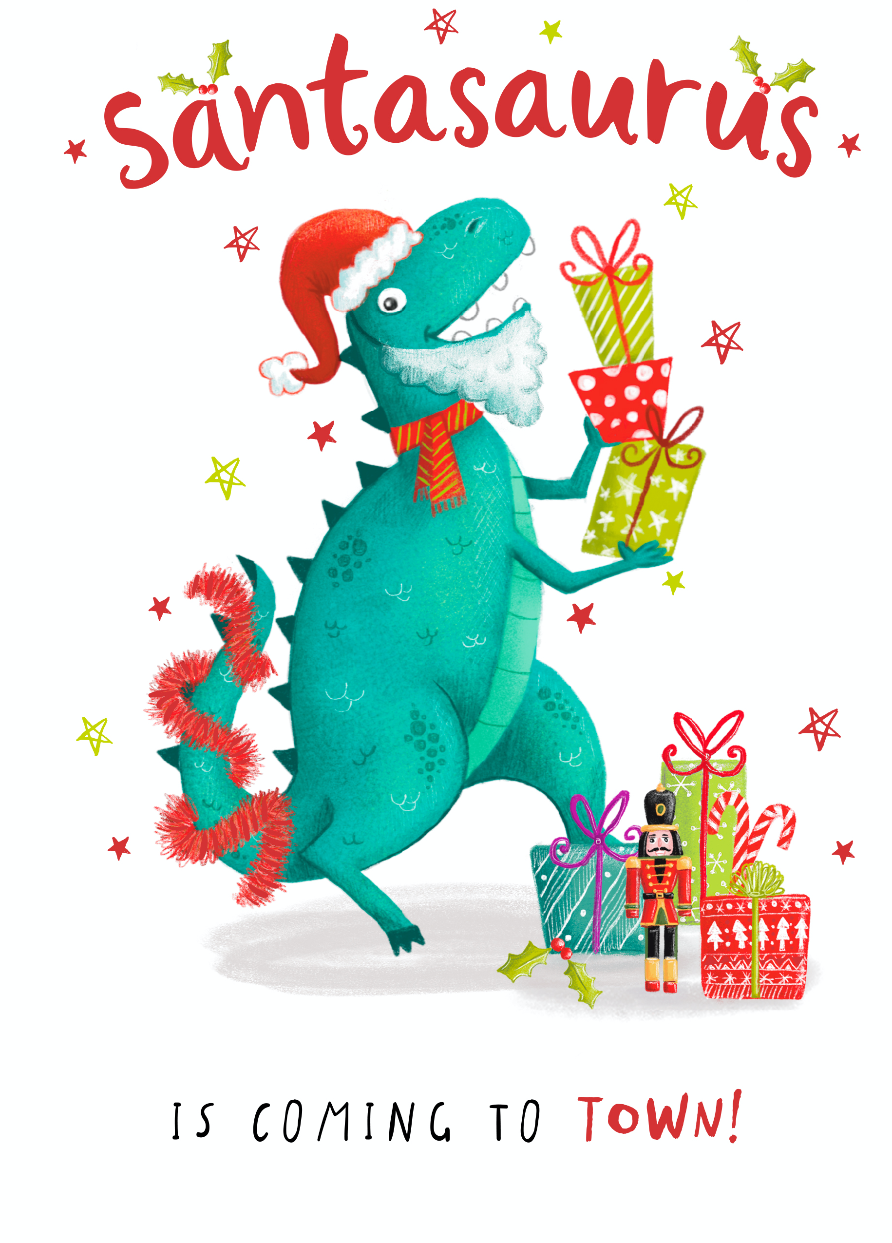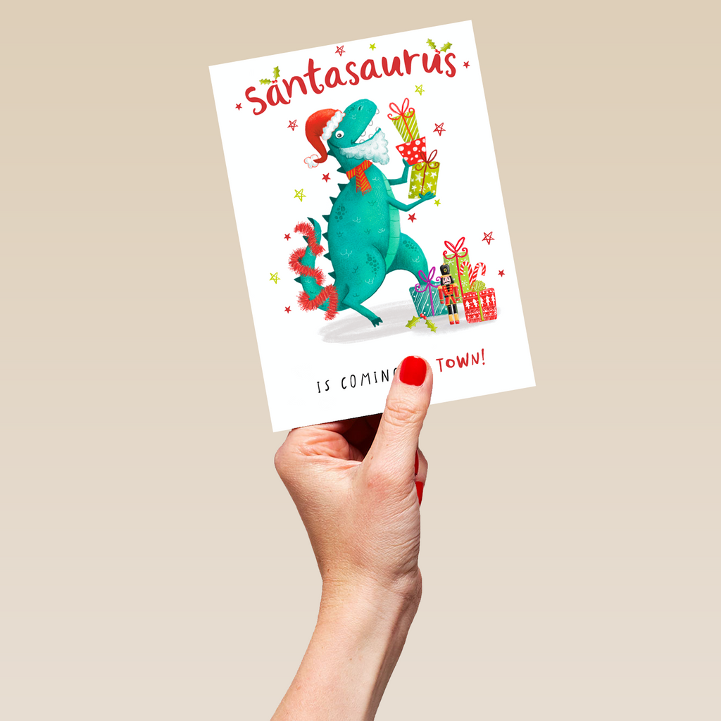 Show them you care with a personalised dinosaur Santa is coming to town card from Hallmark. Our Christmas cards are printed on premium quality, FSC®-certified card & delivered nationwide. This card is available as standard 12cm by 16.7cm and large 15.5cm by 21.6cm.