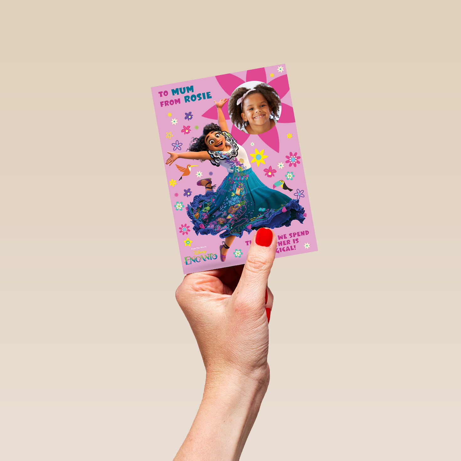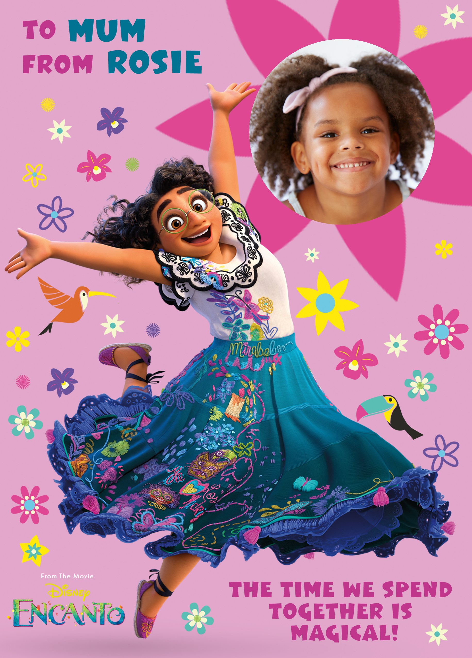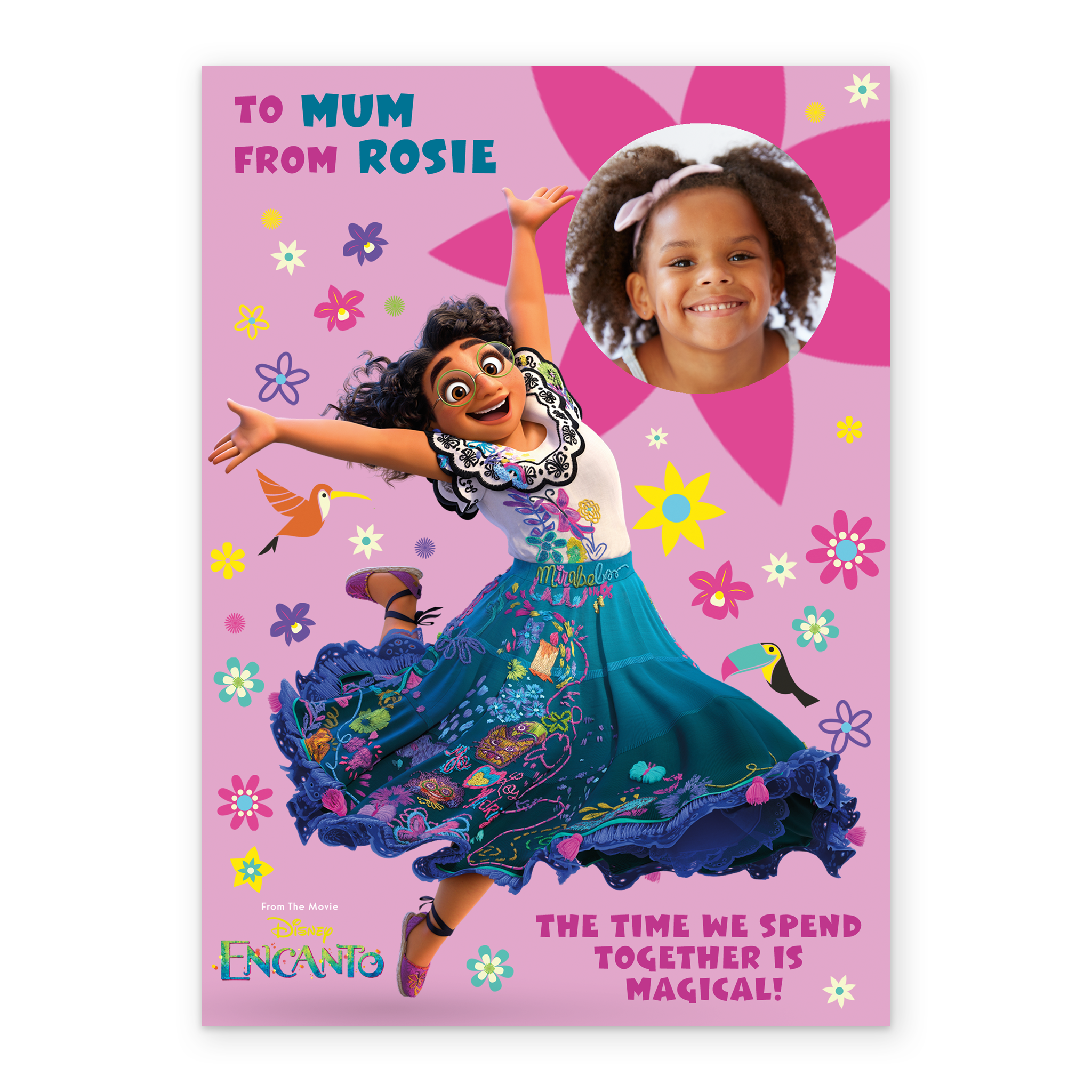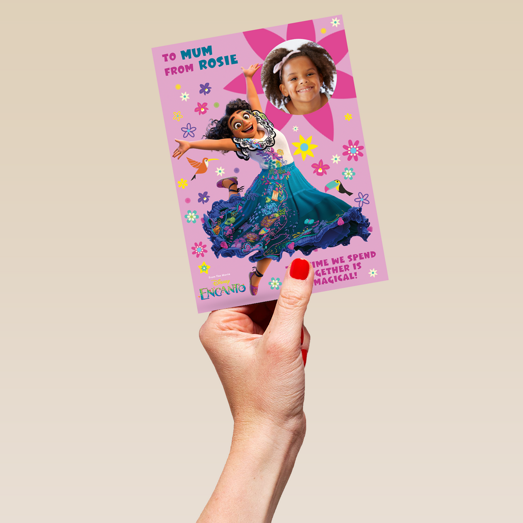 Printed on premium-quality board, this card features Mirabel from Disney Encanto, in a magical pose, surrounded by colourful birds and flowers on a light pink background, with the message 'To Mum from ____ The time we spend together is magical!', space to upload a photo and personalise a name, and comes complete with a co-ordinating white envelope.
