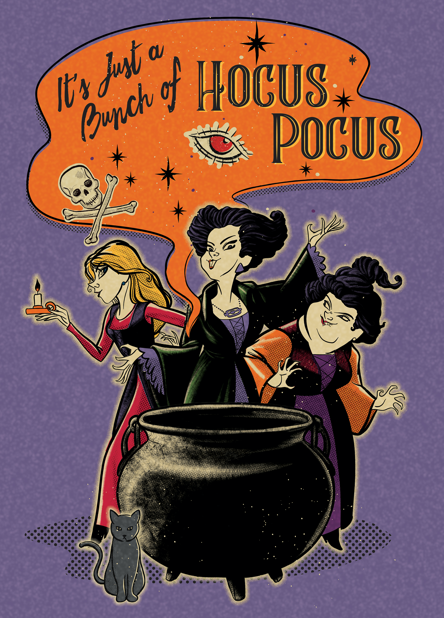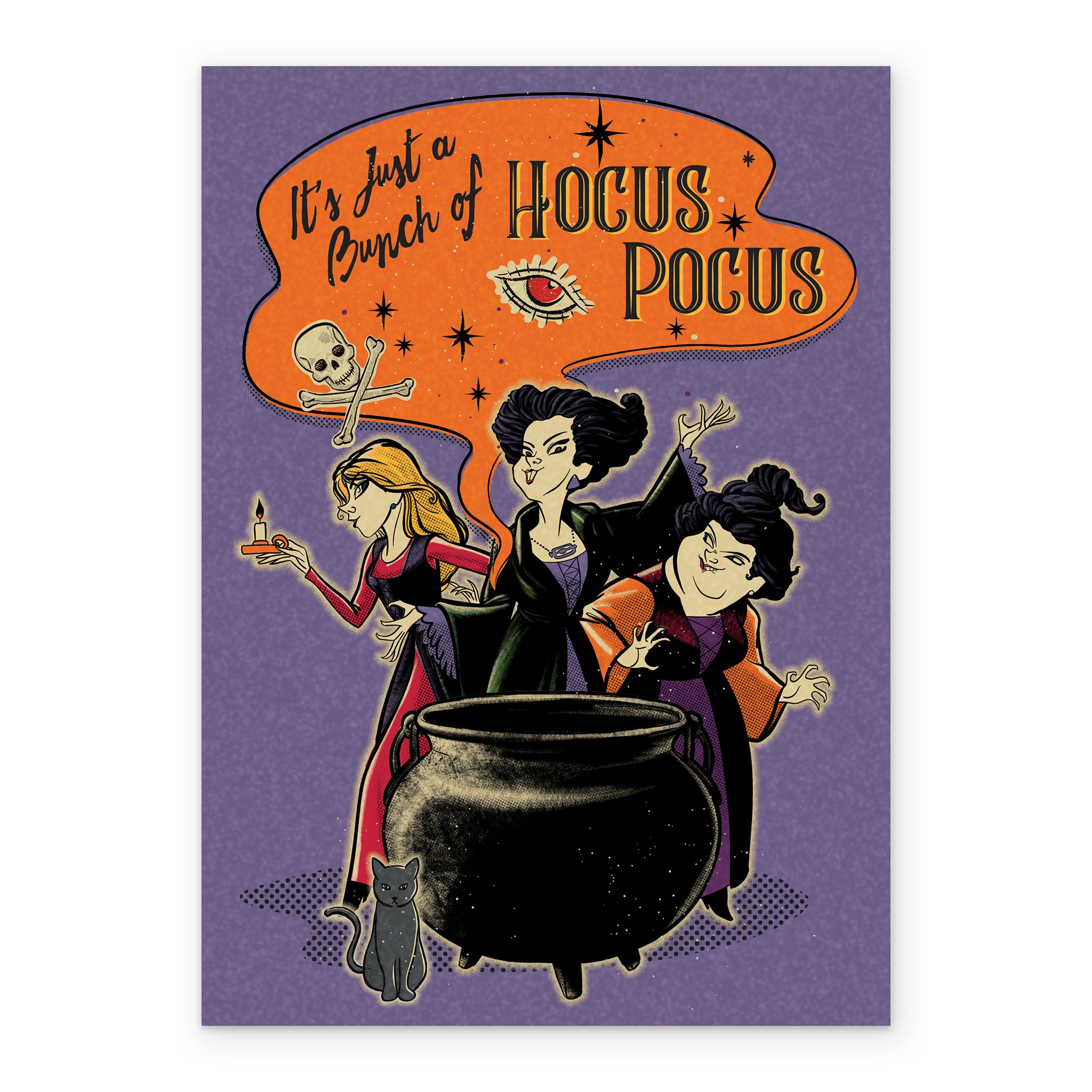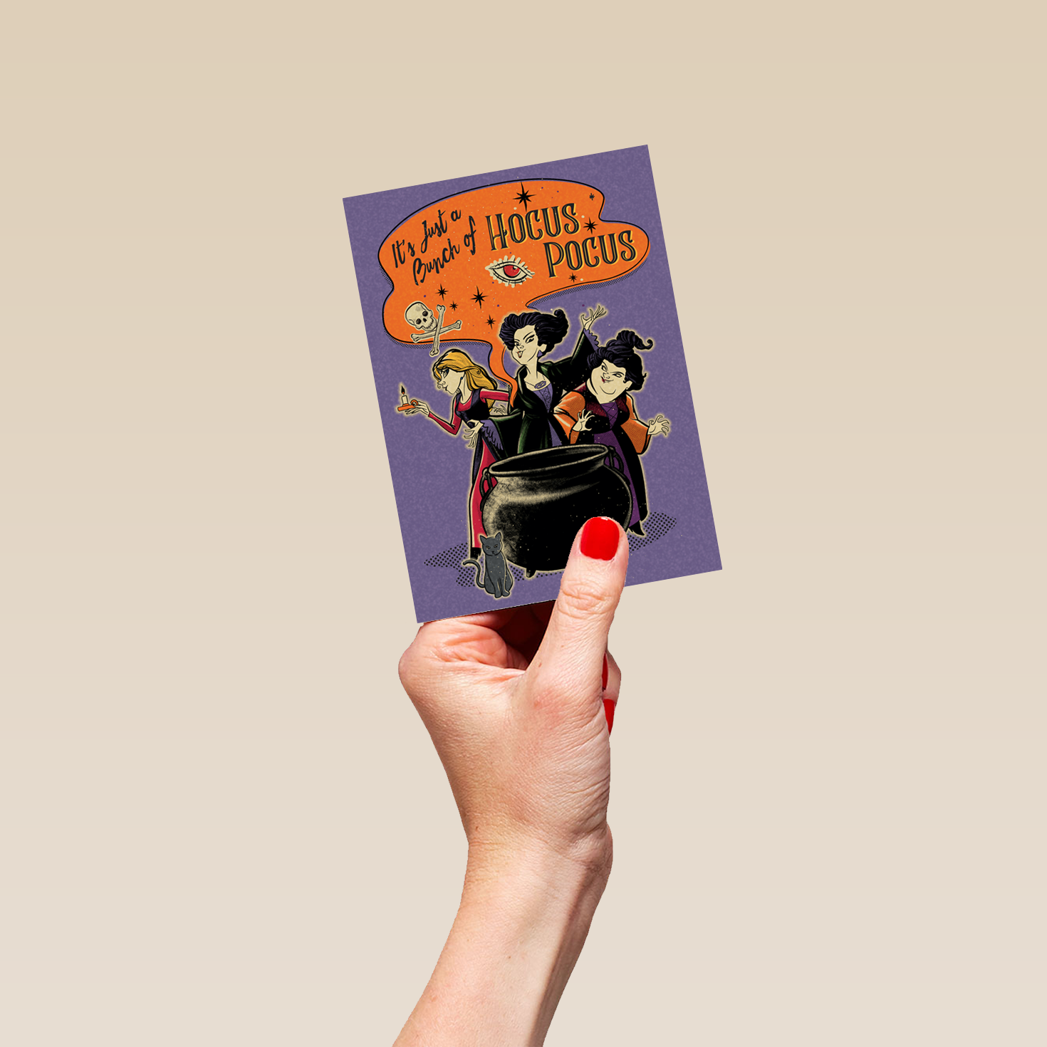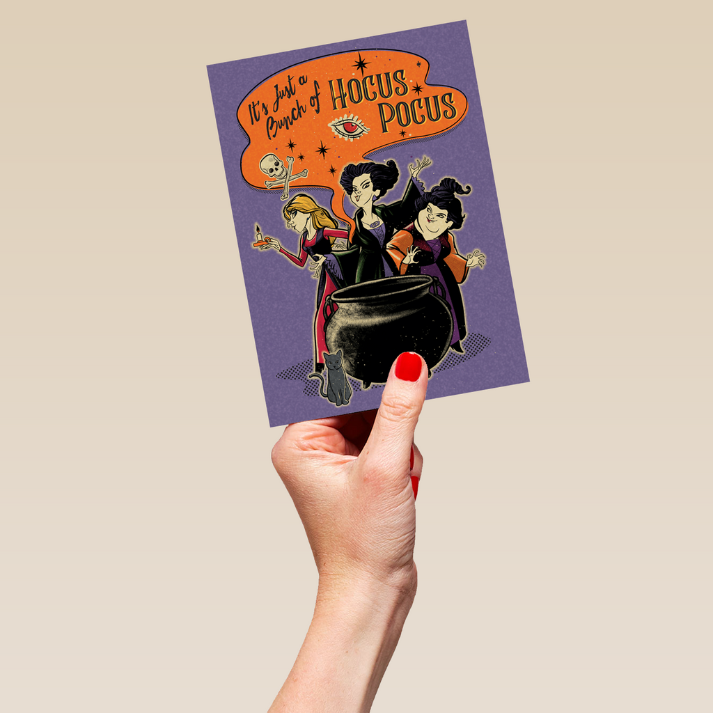 Printed on high-quality board, this card features a vintage styled illustration of Disney's Hocus Pocus The Sanderson Sisters, Winifred, Mary and Sarah in front of a cauldron with the message 'It's just a Bunch of Hocus Pocus', you can customise the text inside, and comes complete with a co-ordinating white envelope.
