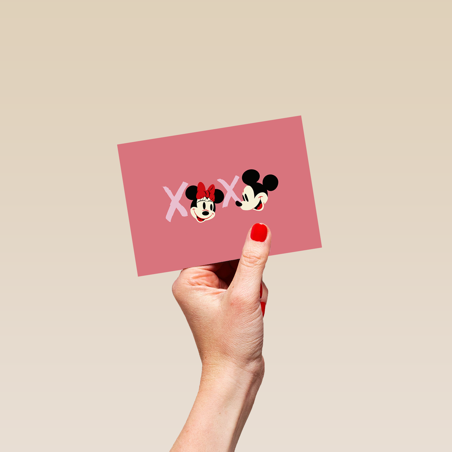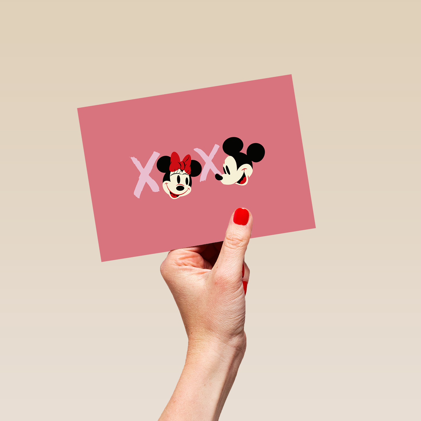 Printed on premium-quality board, this card features Mickey and Minnie Mouse in an 'xoxo' sequence on a pink background, and comes complete with a co-ordinating white envelope.