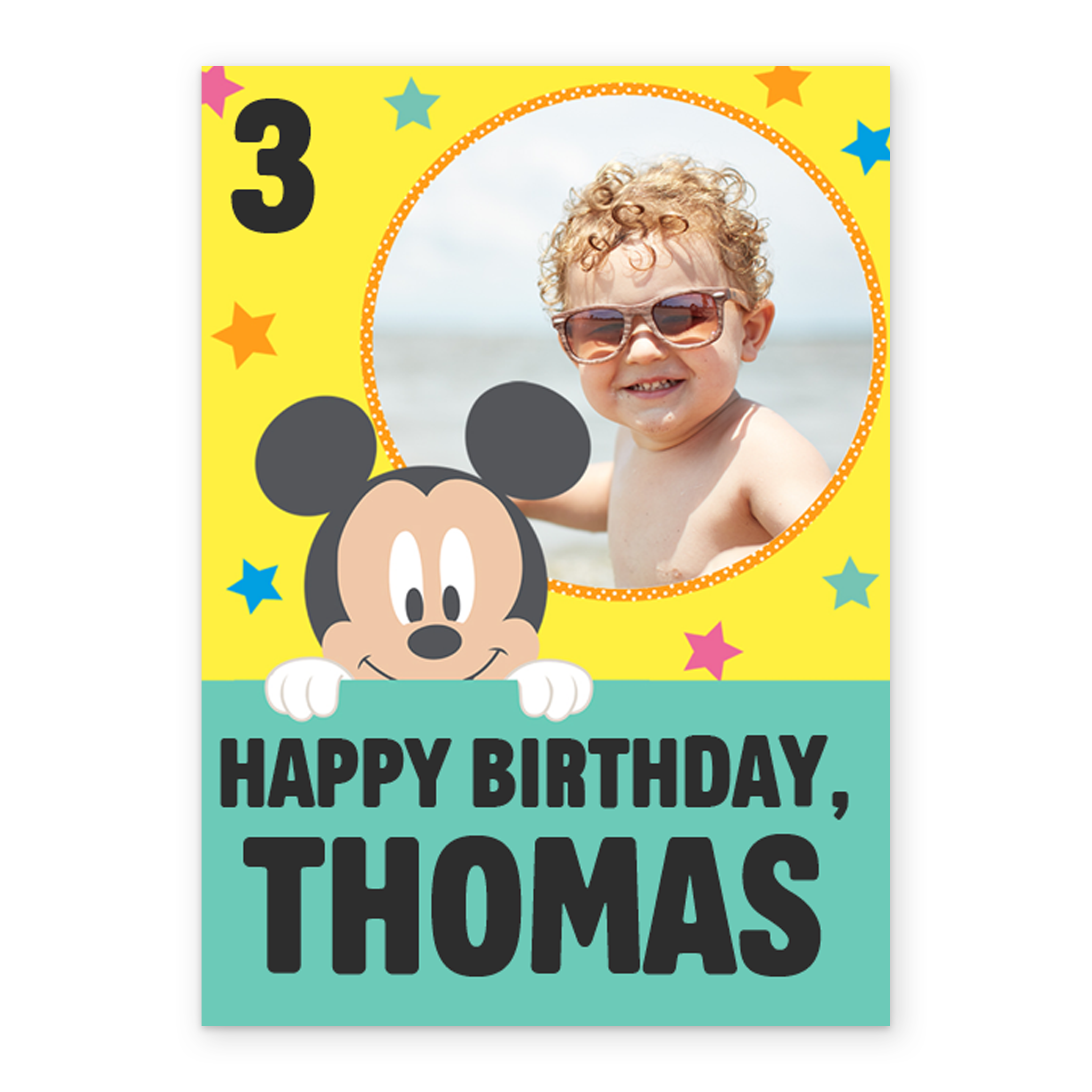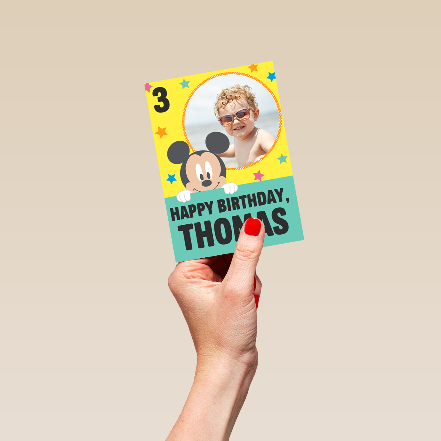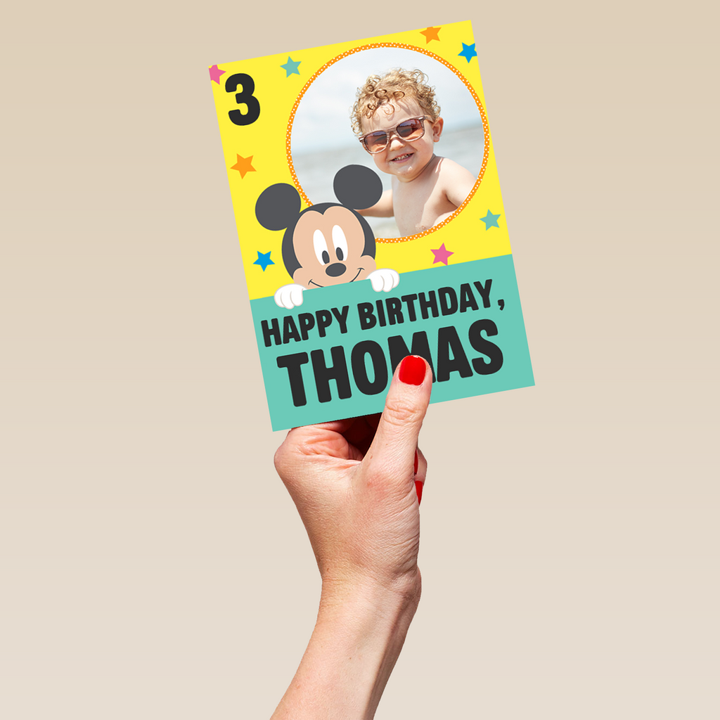Show them you care with a personalised Mickey Mouse photo birthday card from Hallmark. Our birthday cards are printed on premium quality, FSC®-certified card & delivered nationwide. This card is available as standard 12cm by 16.7cm and large 15.5cm by 21.6cm.