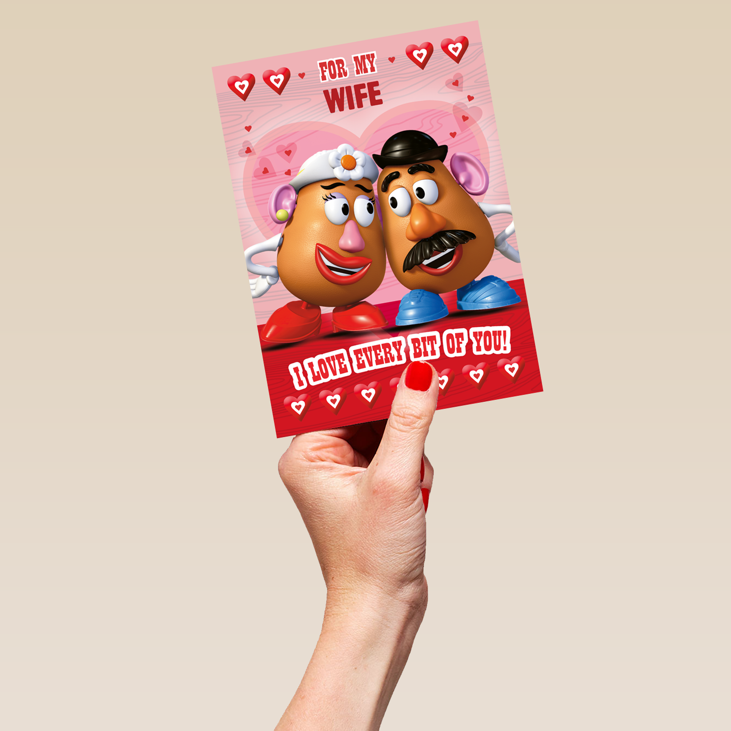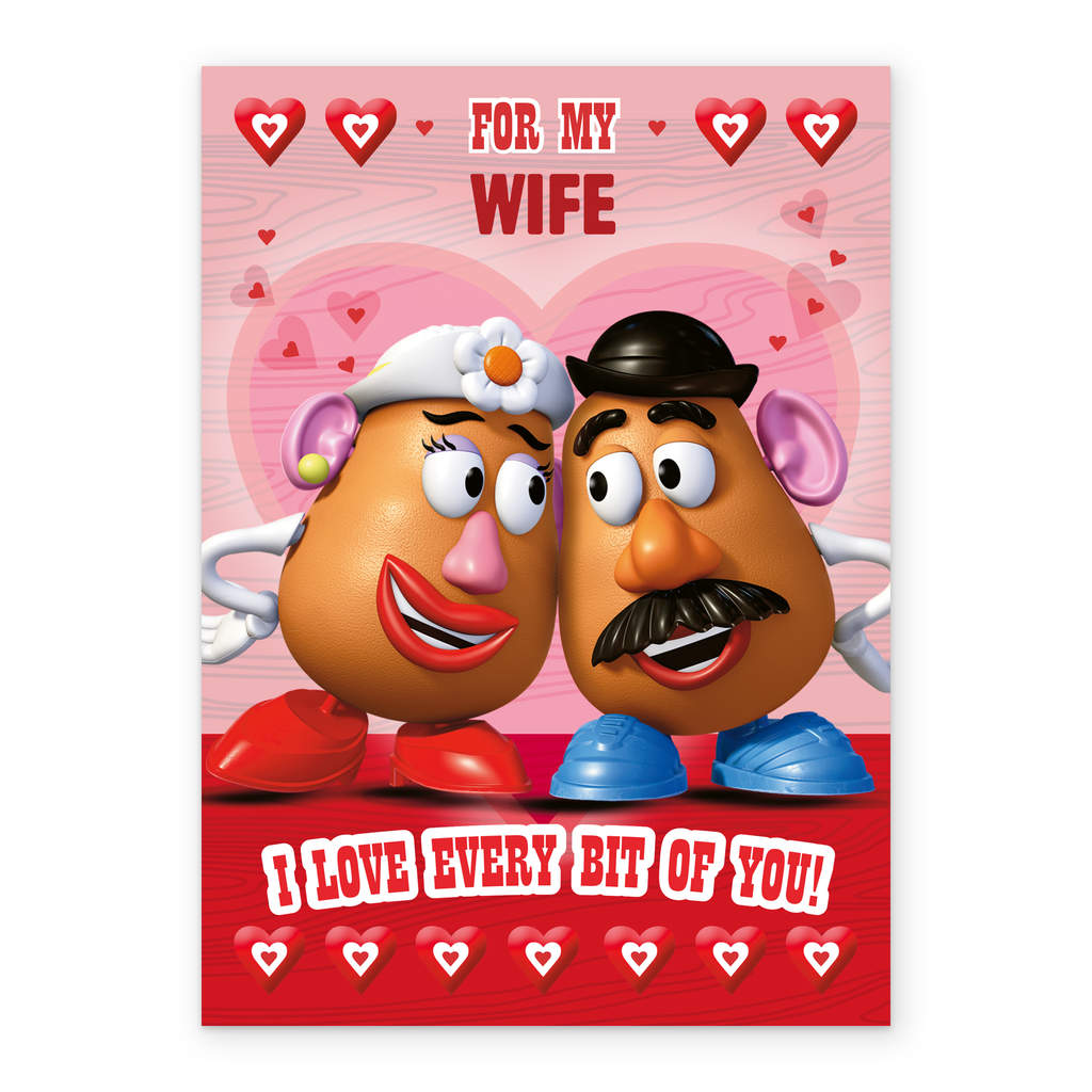 Wish your wonderful wife a Valentine's day she deserves, with this sweet personalised Mr and Mrs Potato Head Valentine's day card, the perfect way to express your love.