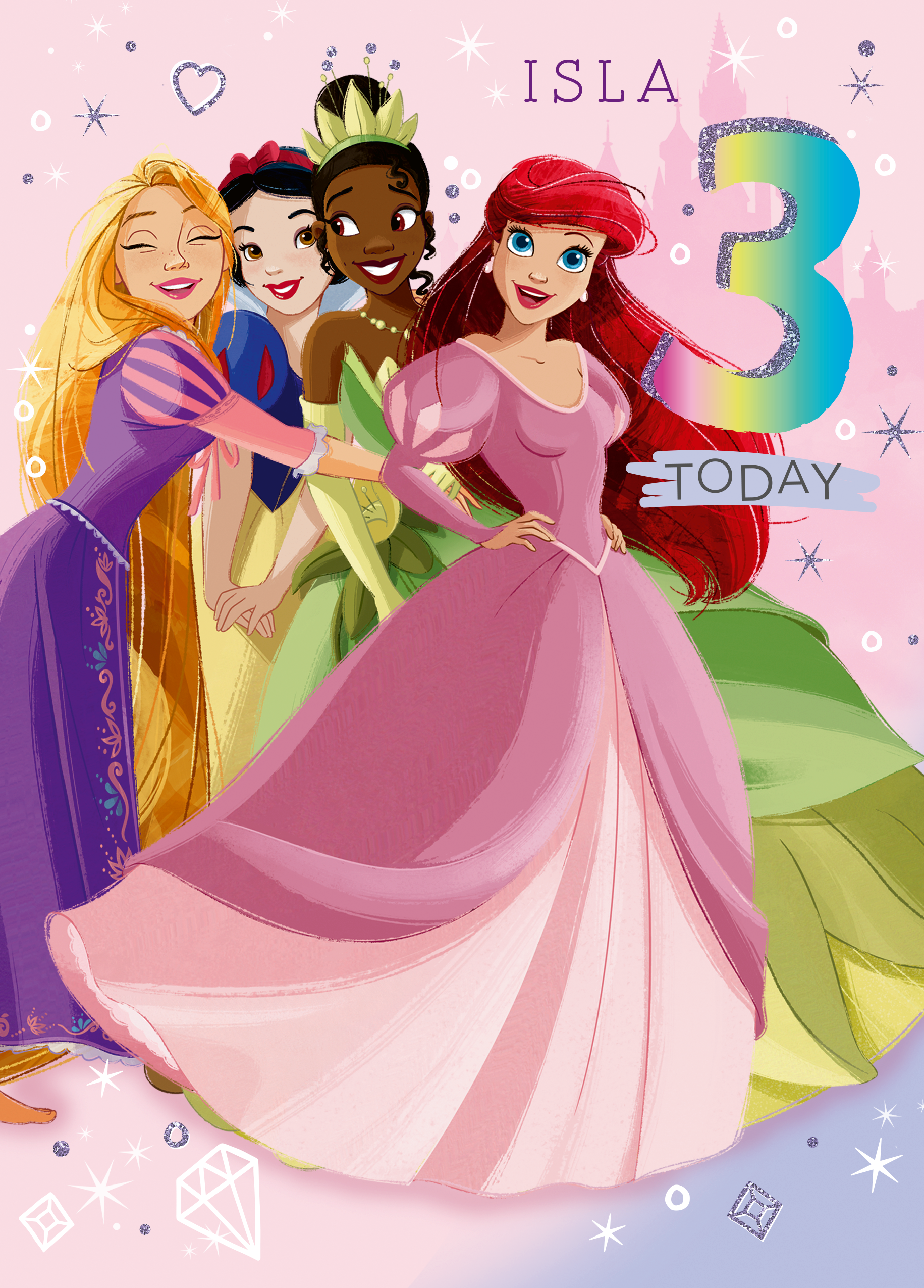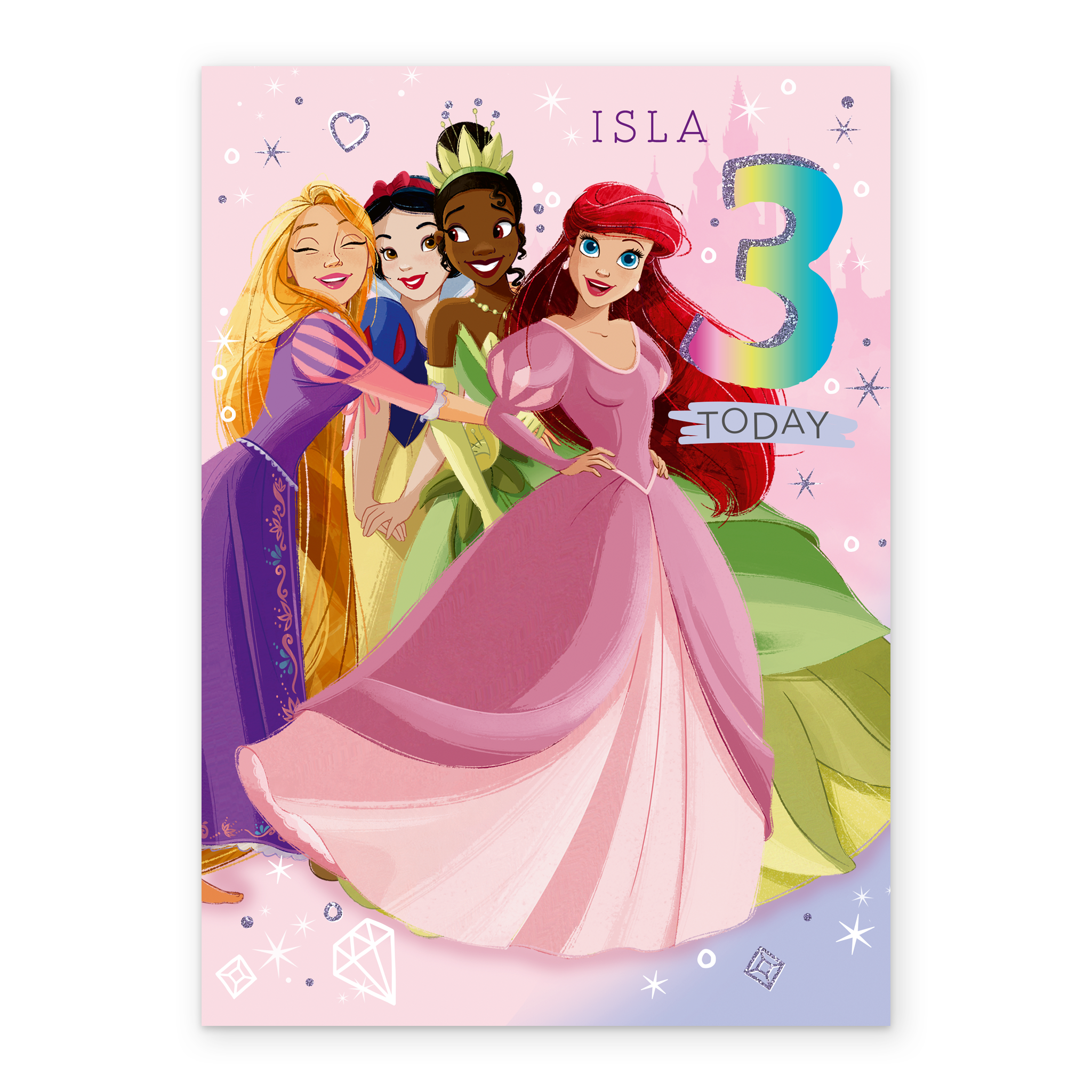 Printed on premium-quality board, this card features Disney princesses Rapunzel, Snow White, Tiana and Ariel in pretty dresses, ready to celebrate a special 3rd birthday, with the message '3 Today', space to personalise a name, and comes complete with a co-ordinating white envelope.