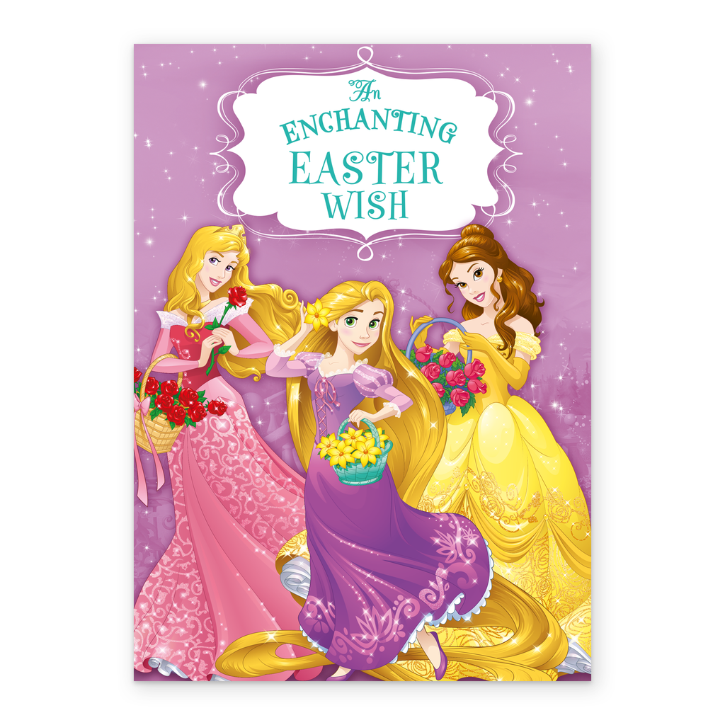 Printed on premium-quality board, this card features Disney Princesses Cinderella, Rapunzel and Belle holding baskets of spring flowers, on a night sky background adorned with enchanting stars, with the message 'An enchanting Easter wish', and comes complete with a co-ordinating white envelope.