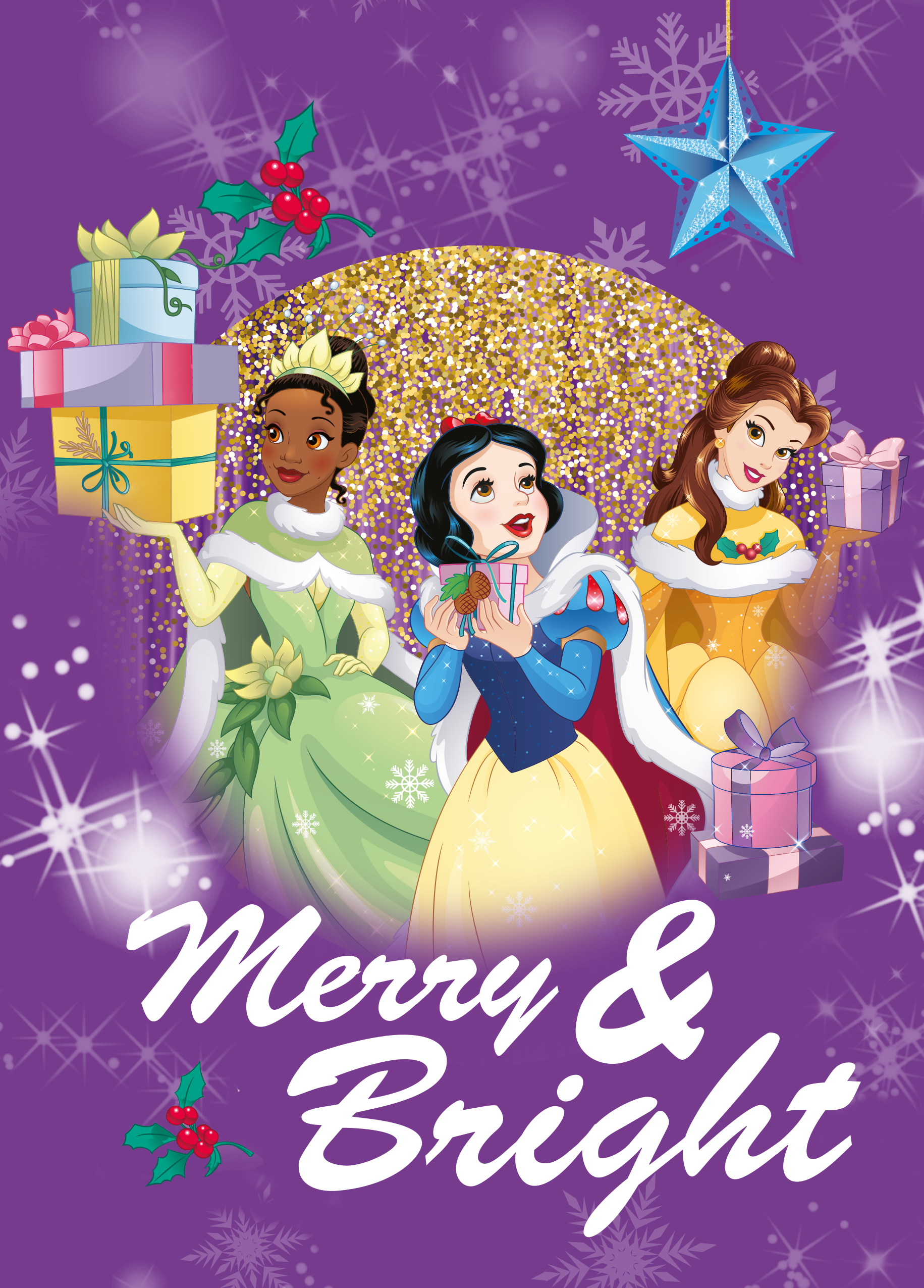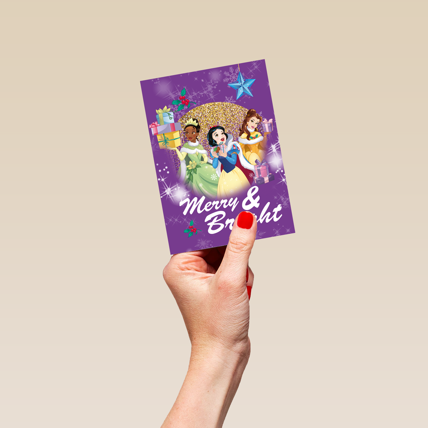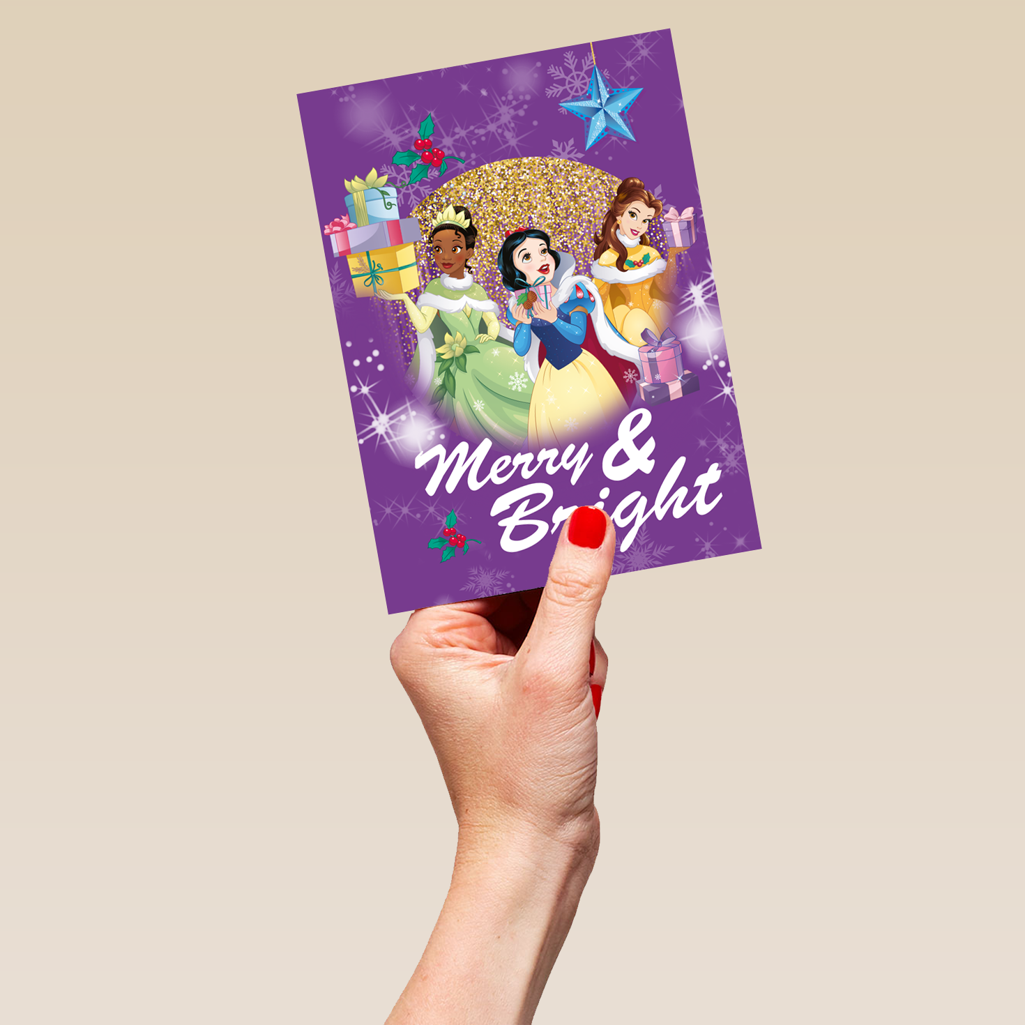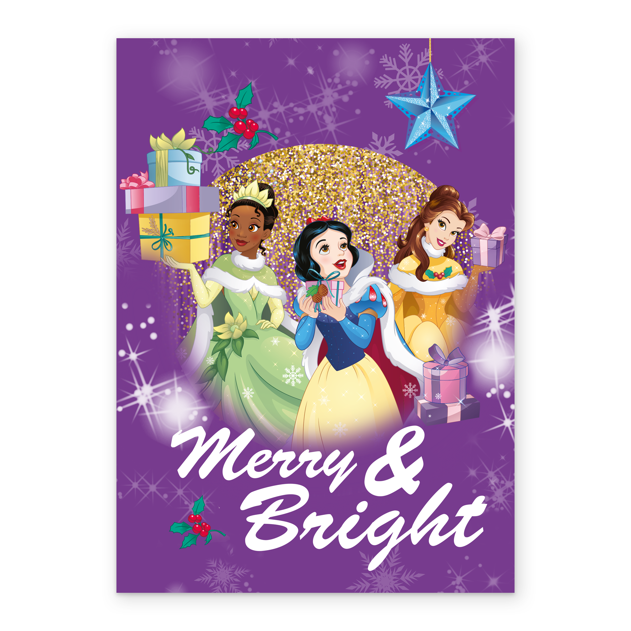 Printed on premium-quality board, this card features Disney Princesses, Tiana from The Princess and the Frog, Snow White and Belle from Beauty and the Beast, in their winter cloaks, with the message 'Merry & Bright', and comes complete with a co-ordinating white envelope.