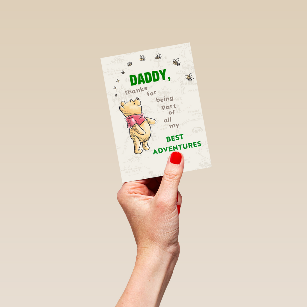 Show them you care with a personalised Winnie the Pooh cute adventures birthday card for daddy from Hallmark. Our birthday cards are printed on premium quality, FSC®-certified card & delivered nationwide. This card is available as standard 12cm by 16.7cm and large 15.5cm by 21.6cm.