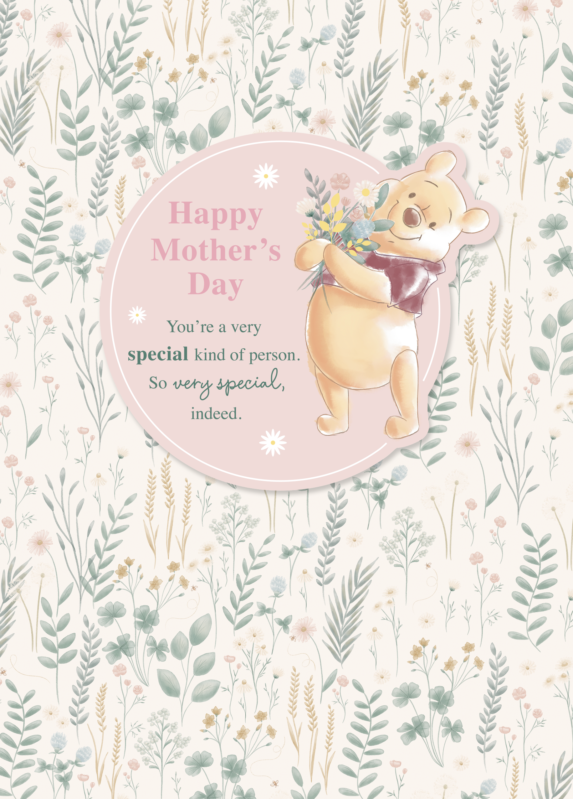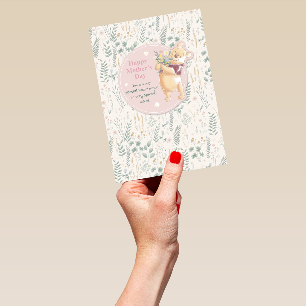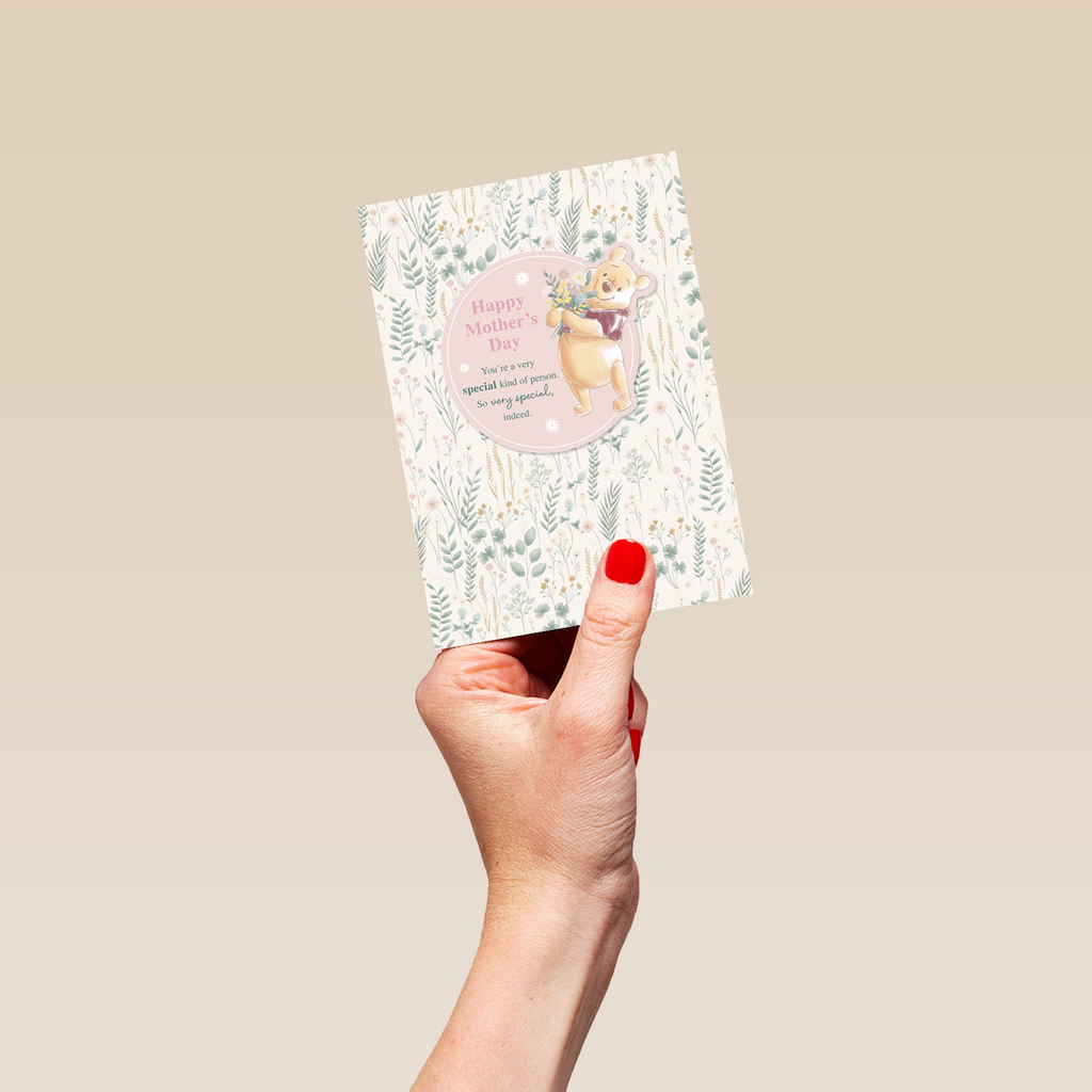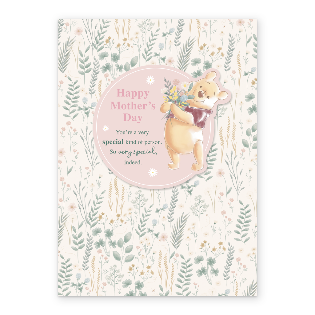 Printed on premium-quality board, this card features Disney's Winnie the Pooh smiling while holding a bouquet of flowers, on a wildflower floral design background, with the message 'Happy Mother's Day You're a special kind of person. So very special indeed', and comes complete with a co-ordinating white envelope.