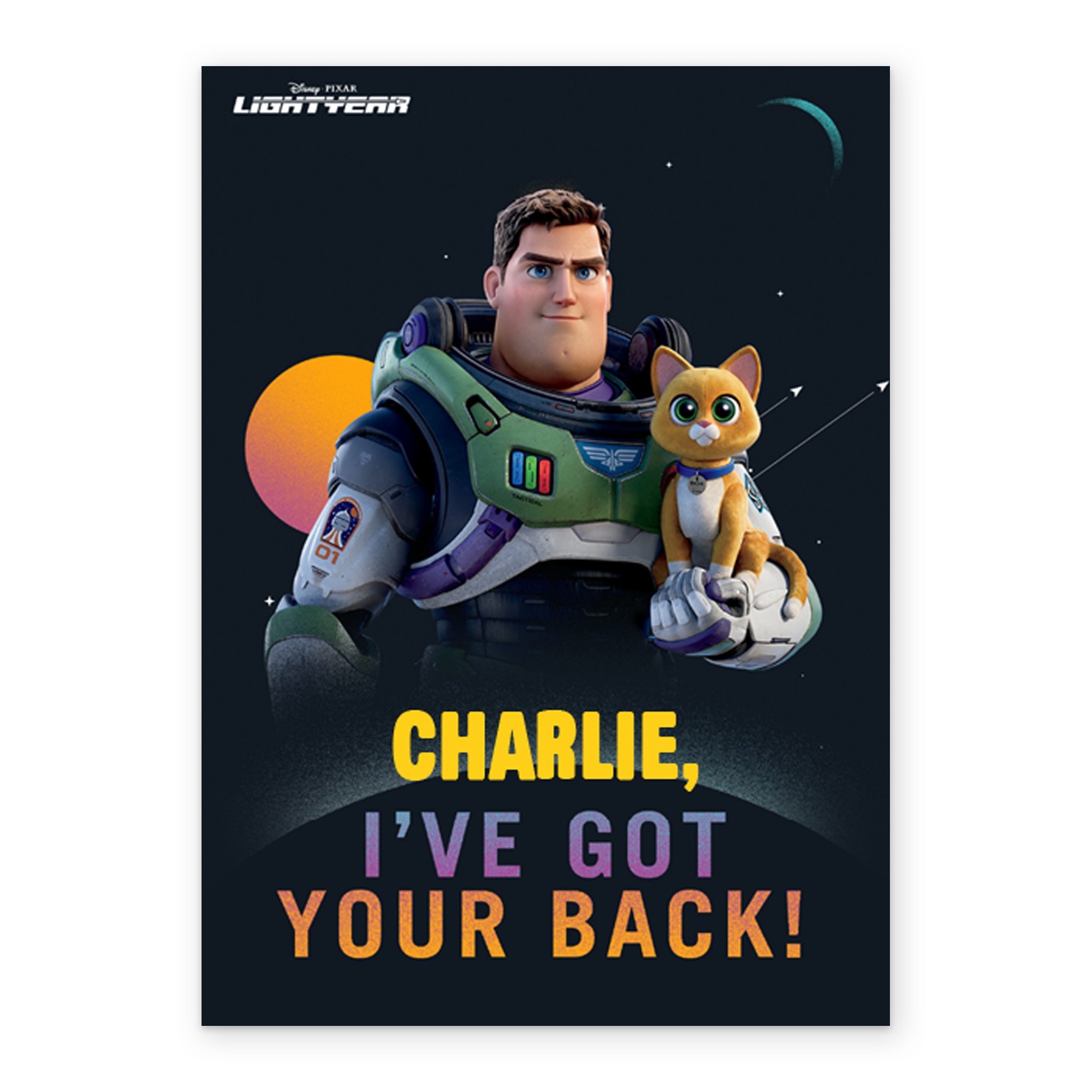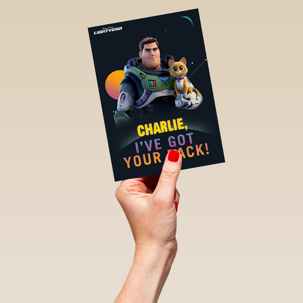 Show them you care with a personalised you've got a friend in me Disney Lightyear card from Hallmark. Our birthday cards are printed on premium quality, FSC®-certified card & delivered nationwide. This card is available as standard 12cm by 16.7cm and large 15.5cm by 21.6cm.