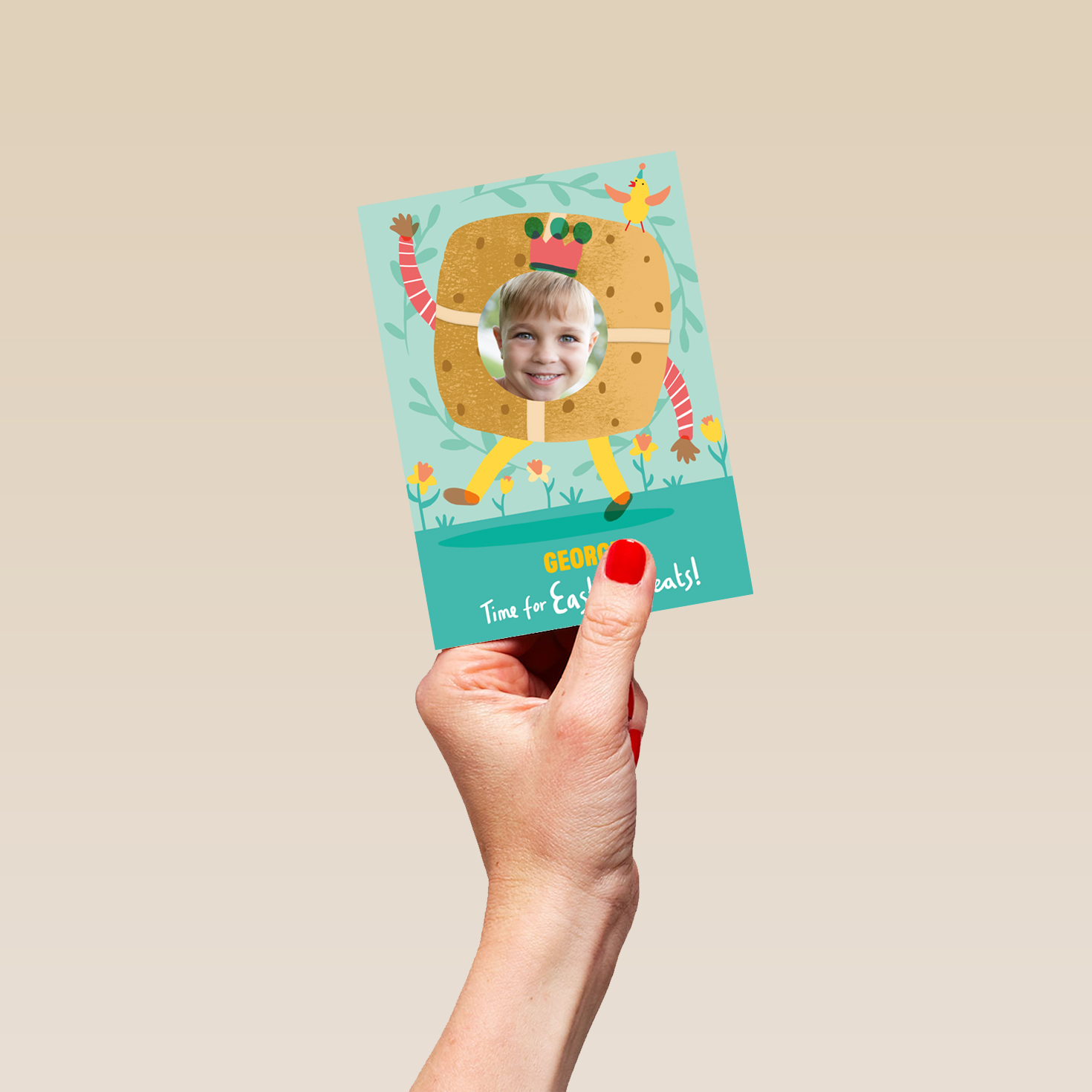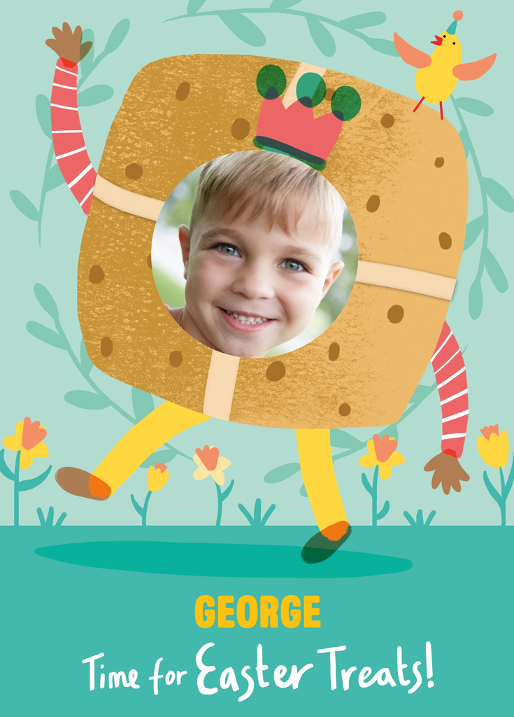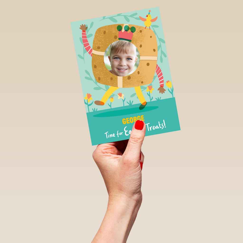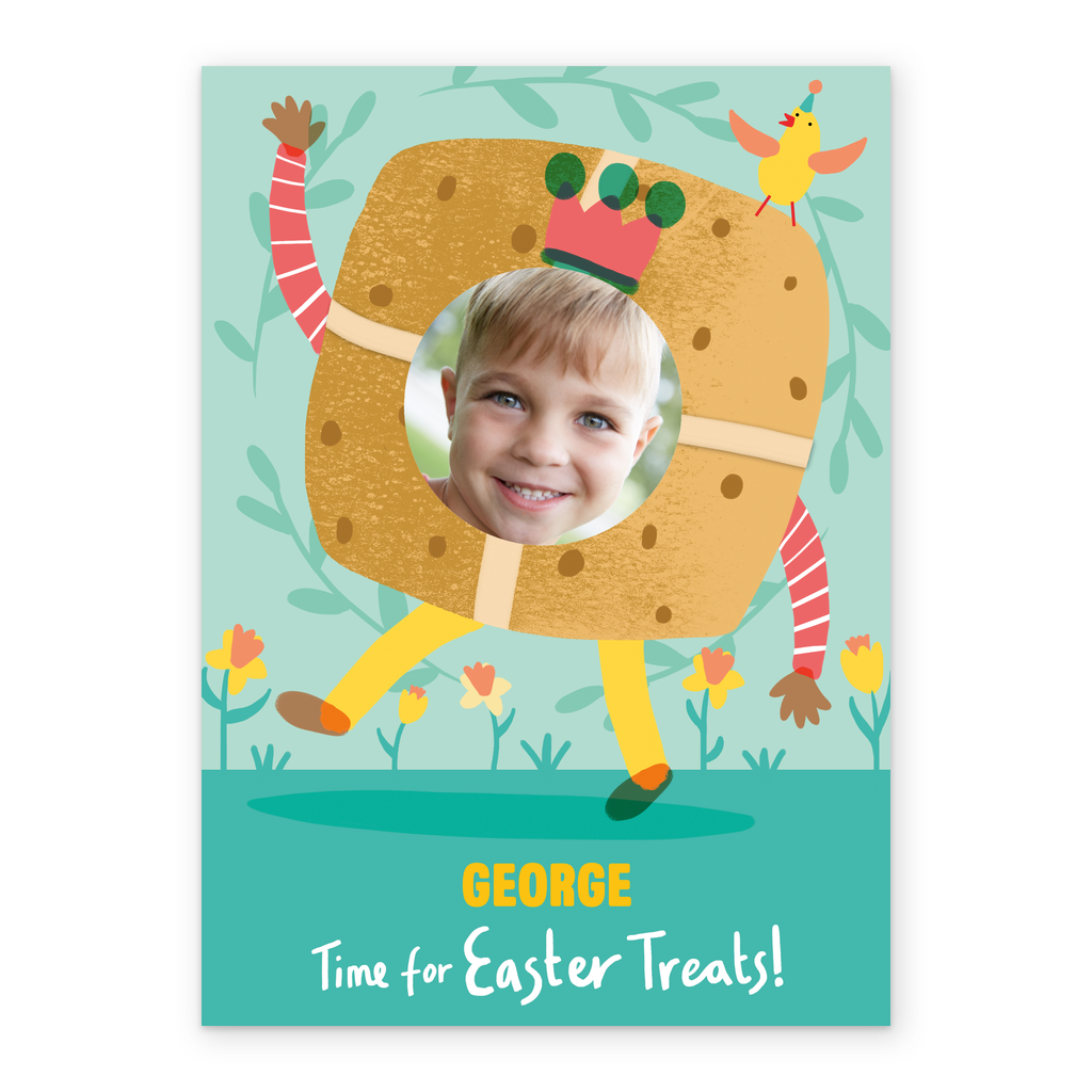 Printed on premium-quality board, this card features space to upload a photo of your favourite person; show them dressed as a hot cross bun, wearing a read and green crown, and celebrating Easter with a happy yellow chick and brightly coloured daffodils, with the message 'Time for Easter treats!', space to personalise a name, and comes complete with a co-ordinating white envelope.